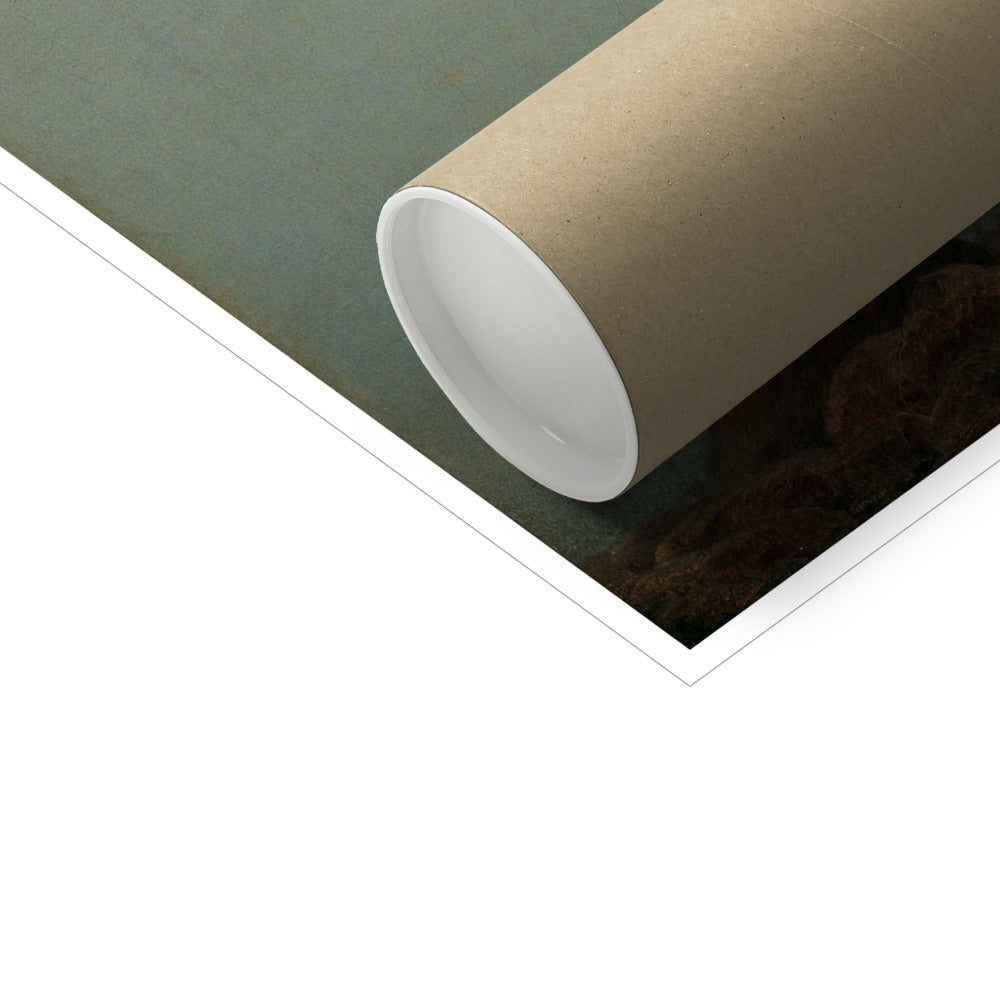 Caspar David Friedrich – Meeresstrand im Nebel (1807). This atmospheric painting captures a misty shoreline where the sea merges seamlessly with the sky in a veil of fog. Barely visible ships drift in the distance, their forms softened by the haze, evoking a sense of solitude and introspection. The rocky foreground anchors the viewer while the mysterious vastness beyond hints at the Romantic fascination with nature’s sublime and unknowable depths. Friedrich’s delicate use of light and muted tones deepens the meditative mood of this early masterpiece.
