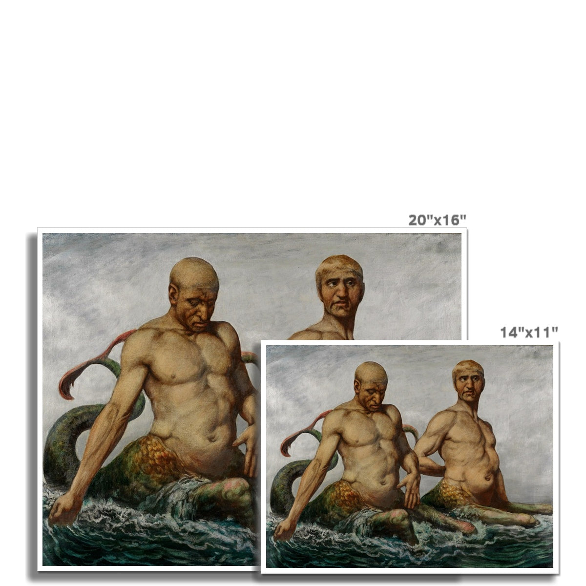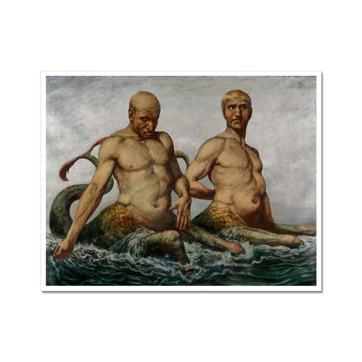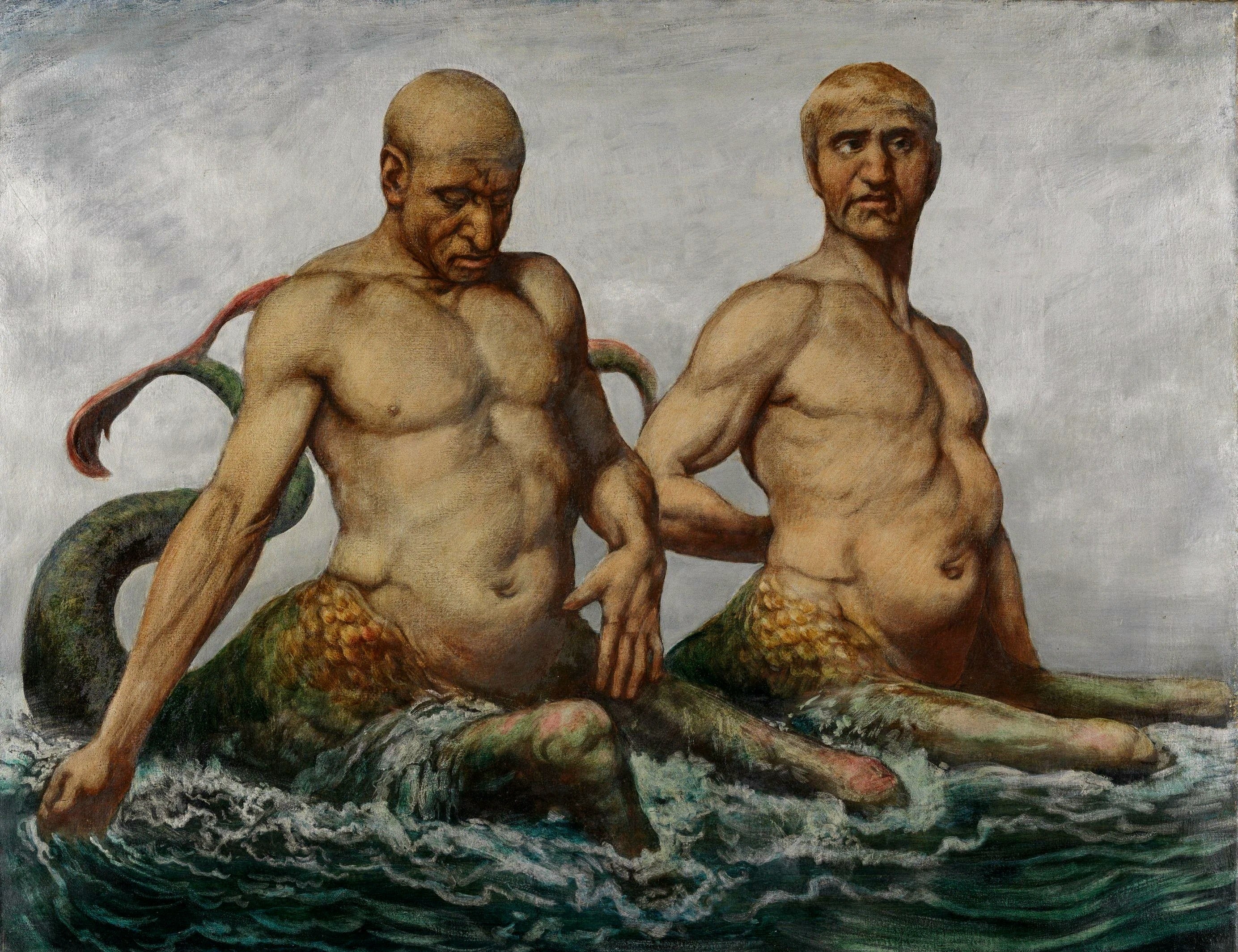 Hans Thoma’s Mermen (1900) presents a striking and unconventional take on mythological sea beings. In this oil painting, two muscular mermen with human upper bodies and scaled, serpentine tails emerge from churning waters under a grey, overcast sky. Their expressions—one introspective, the other cautiously observant—evoke a mysterious tension, blurring the line between human vulnerability and mythic power. Thoma’s naturalistic style and muted palette lend the work a somber realism that contrasts with its fantastical subject.