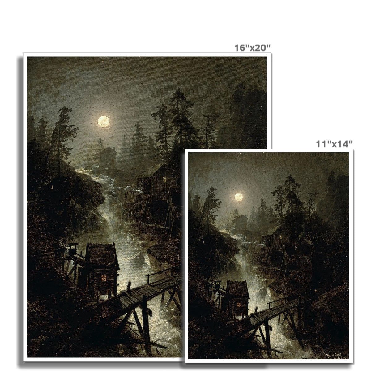 Mining Town by Moonlight by Hermann Ottomar Herzog (1832–1932) is an evocative nocturne that reveals the austere harmony between human industry and the untamed natural world. Under the ethereal glow of the moon, a secluded mining settlement materializes from the surrounding darkness, its timbered buildings and cascading waters rendered with meticulous attention to detail. The faint radiance from cabin windows contrasts with the silvery mist drifting through the ravine, imbuing the scene with a haunting sense of solitude and endurance. In this work, Herzog masterfully unites Romantic sensibility with realist precision, transforming an industrial landscape into a meditation on light, labor, and the sublime.