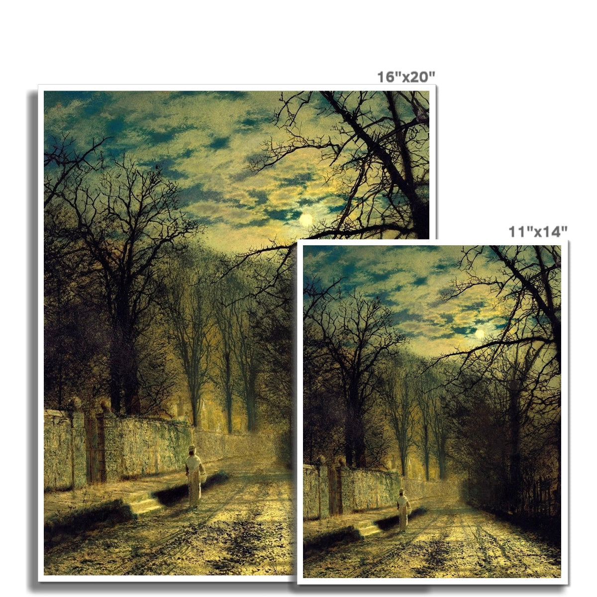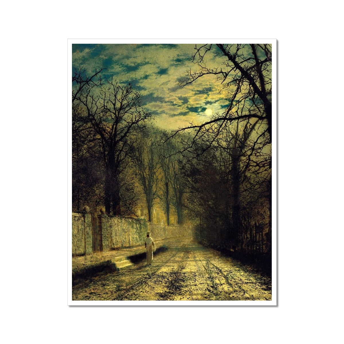 John Atkinson Grimshaw’s "A Moonlit Street" (1880) is a masterful nocturne that captures a quiet, deserted roadway bathed in pale, silvery moonlight. Framed by bare, arching trees and damp, reflective ground, the scene is suffused with a hushed, almost spectral atmosphere. Grimshaw’s meticulous handling of light and shadow transforms an ordinary street into a poetic meditation on solitude, stillness, and the subtle beauty of the night.