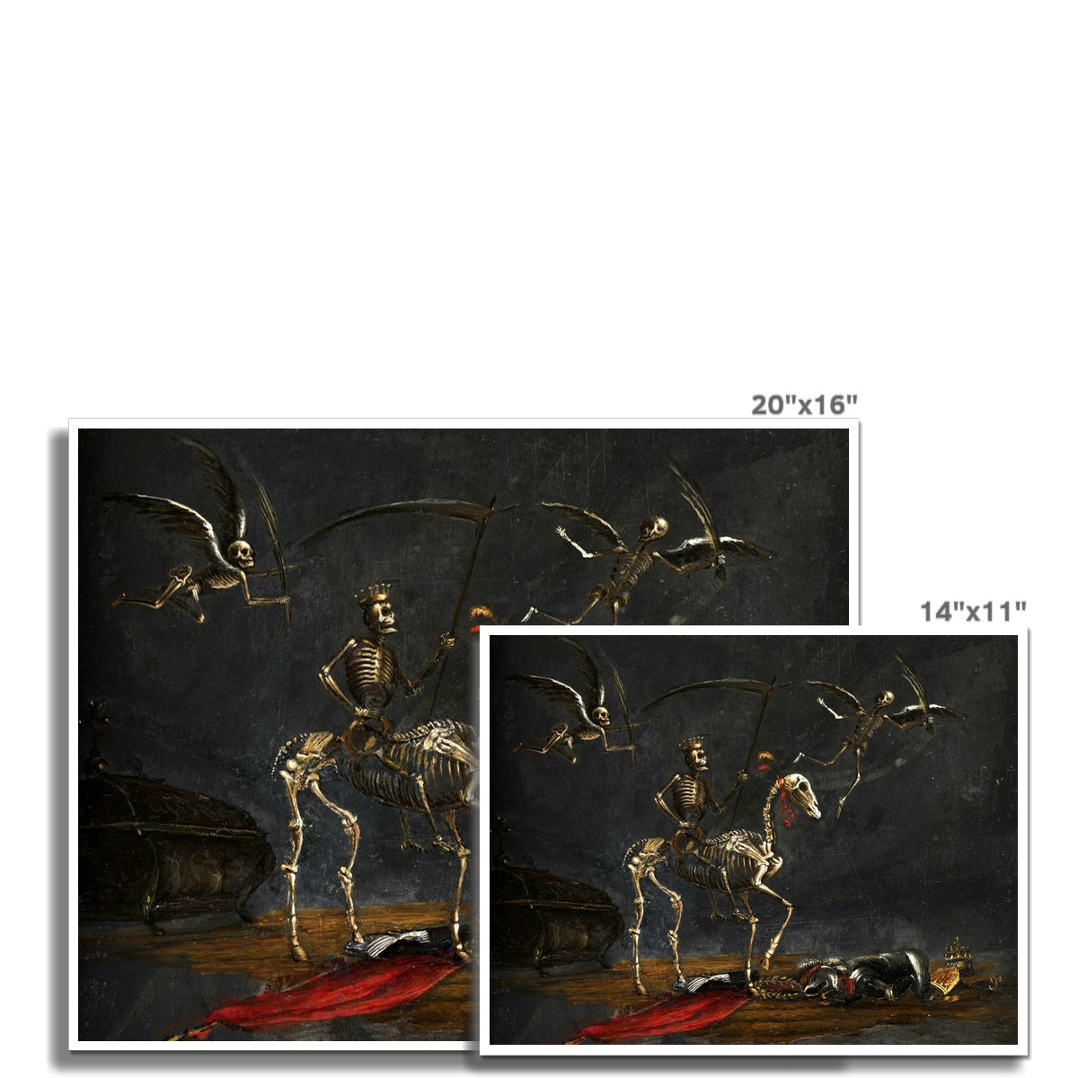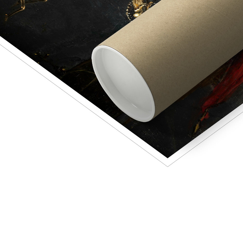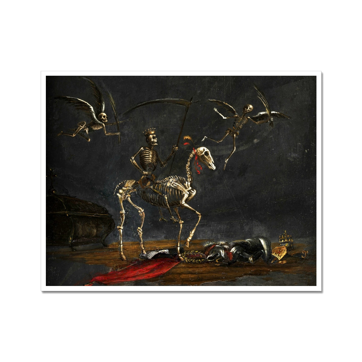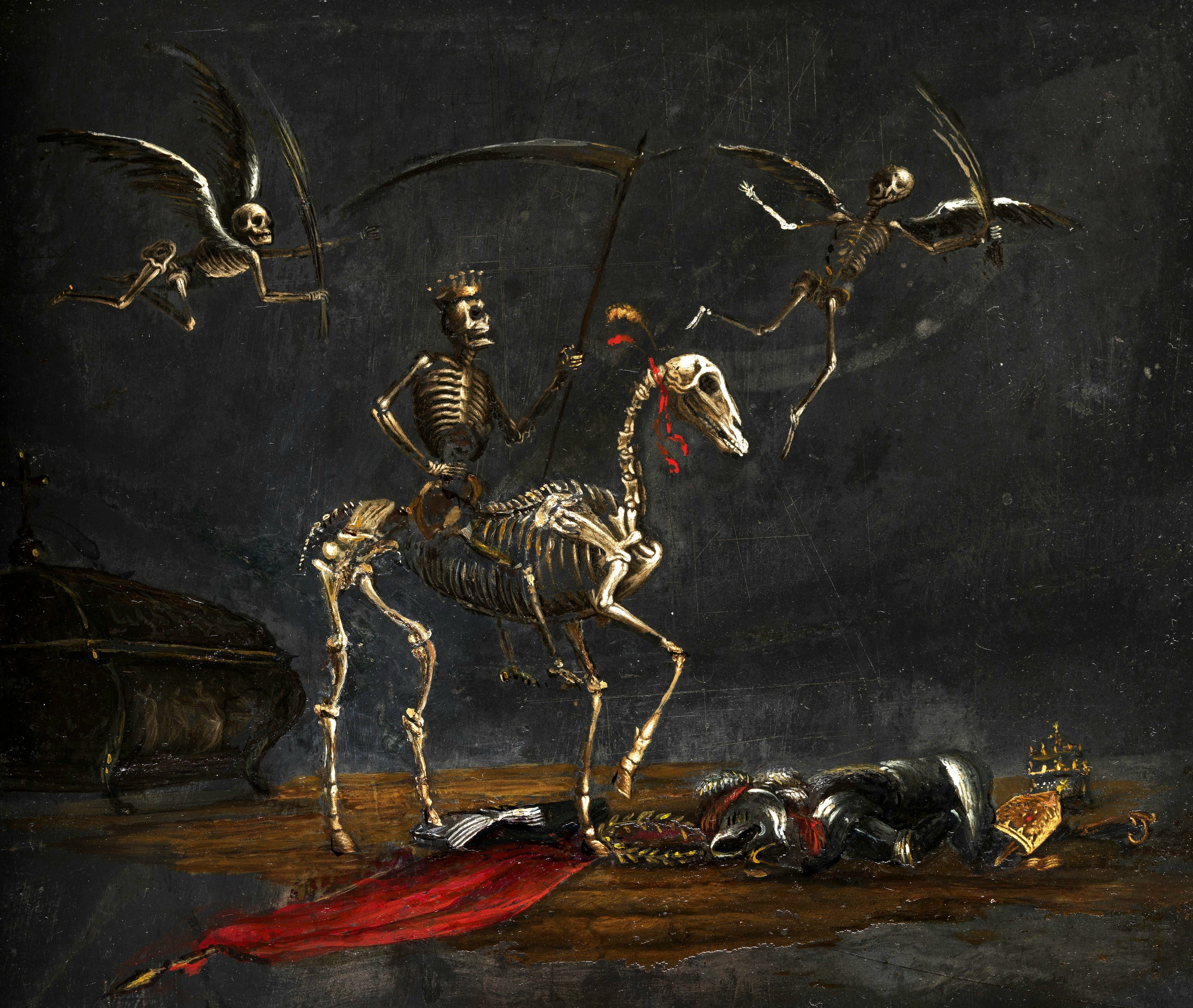 "Mors Triumphans" (c. 1650) by Leonard Bramer (1596–1674) is a haunting allegorical painting that depicts the triumph of death. A crowned skeleton, wielding a scythe, rides a skeletal horse across a dark, barren landscape. Two winged skeletons soar ominously above, each holding a bow. Below, a fallen figure in armor lies lifeless, surrounded by symbols of power—a crown, scepter, and robe—emphasizing the inevitability of death regardless of status or strength. The stark chiaroscuro and dramatic symbolism reflect Baroque fascination with mortality and the vanitas theme, reminding viewers of life’s fleeting nature.