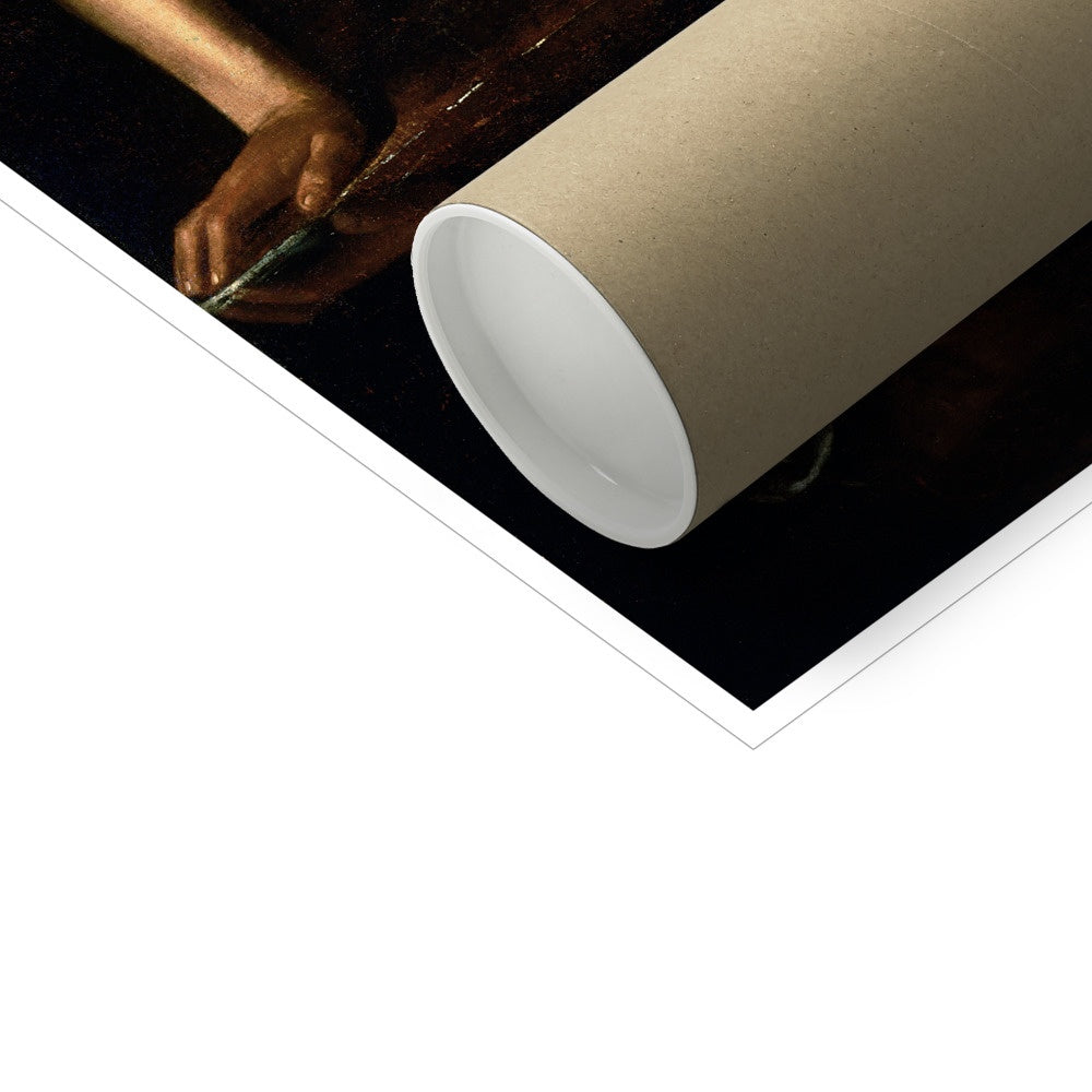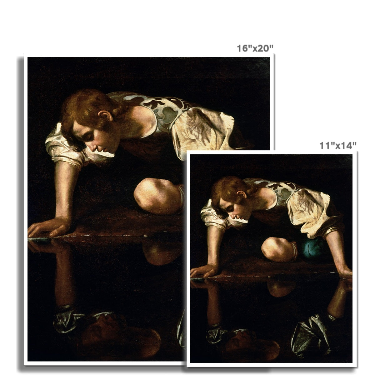 "Narcissus" is a painting by Italian Baroque master Caravaggio. It depicts the mythological figure of Narcissus, who was punished by the gods for his vanity by falling in love with his own reflection. The painting is characterized by Caravaggio's dramatic use of light and dark, with the contrasts of light and dark adding to the sense of emotional intensity in the scene. The figure of Narcissus is depicted in a highly realistic manner, with his youthful, idealized features and the glistening waters of the pool in which he is gazing. The intricate details of the surrounding vegetation and the ripples in the water also add to the painting's realism and emotional impact. Caravaggio's use of color is also noteworthy, with the warm hues of Narcissus' skin and clothing contrasting against the cool blues and greens of the background. "Narcissus" is considered one of Caravaggio's masterpieces and is widely recognized as a powerful example of Italian Baroque art.