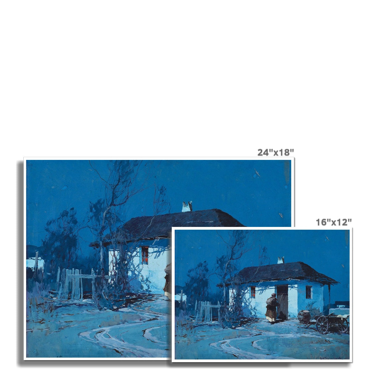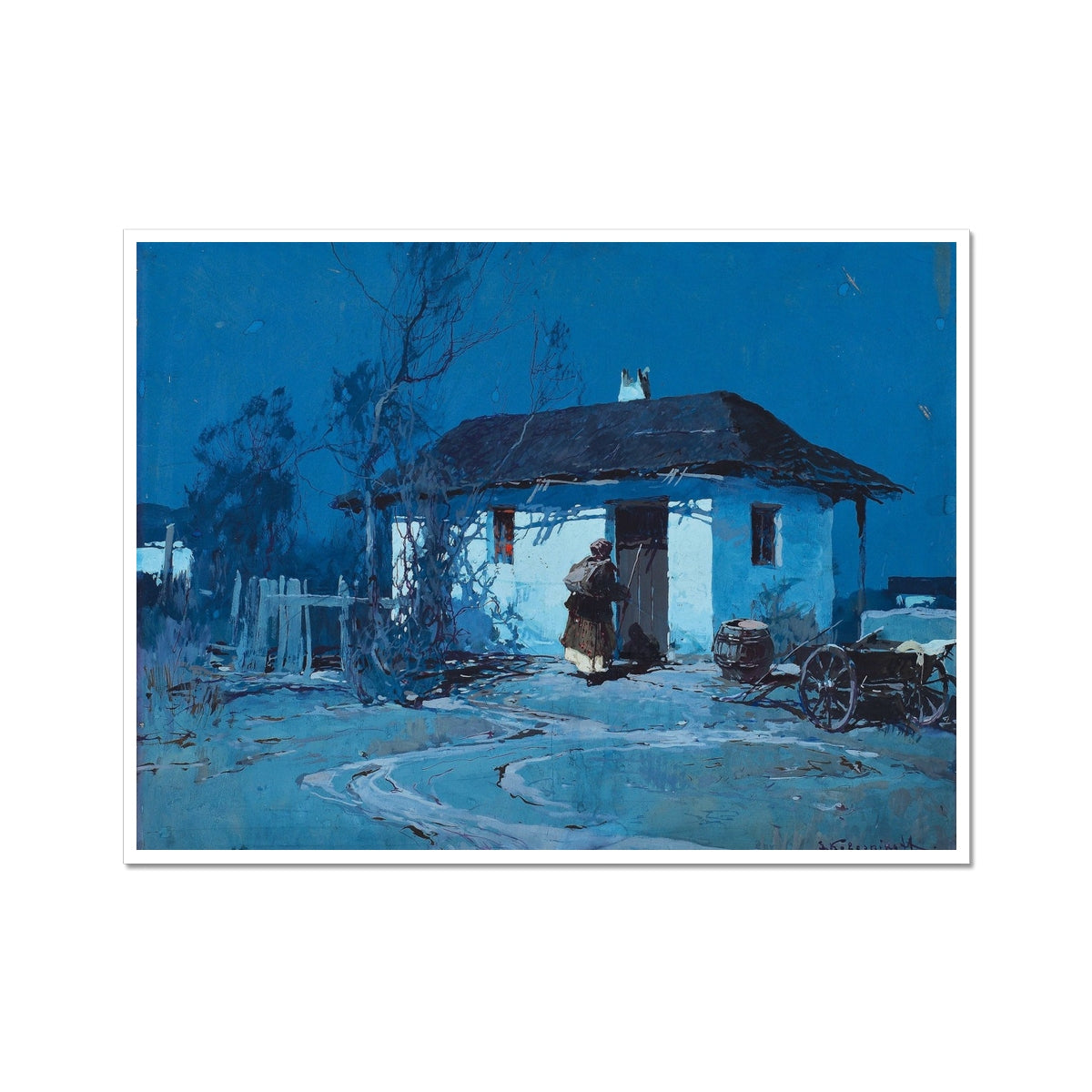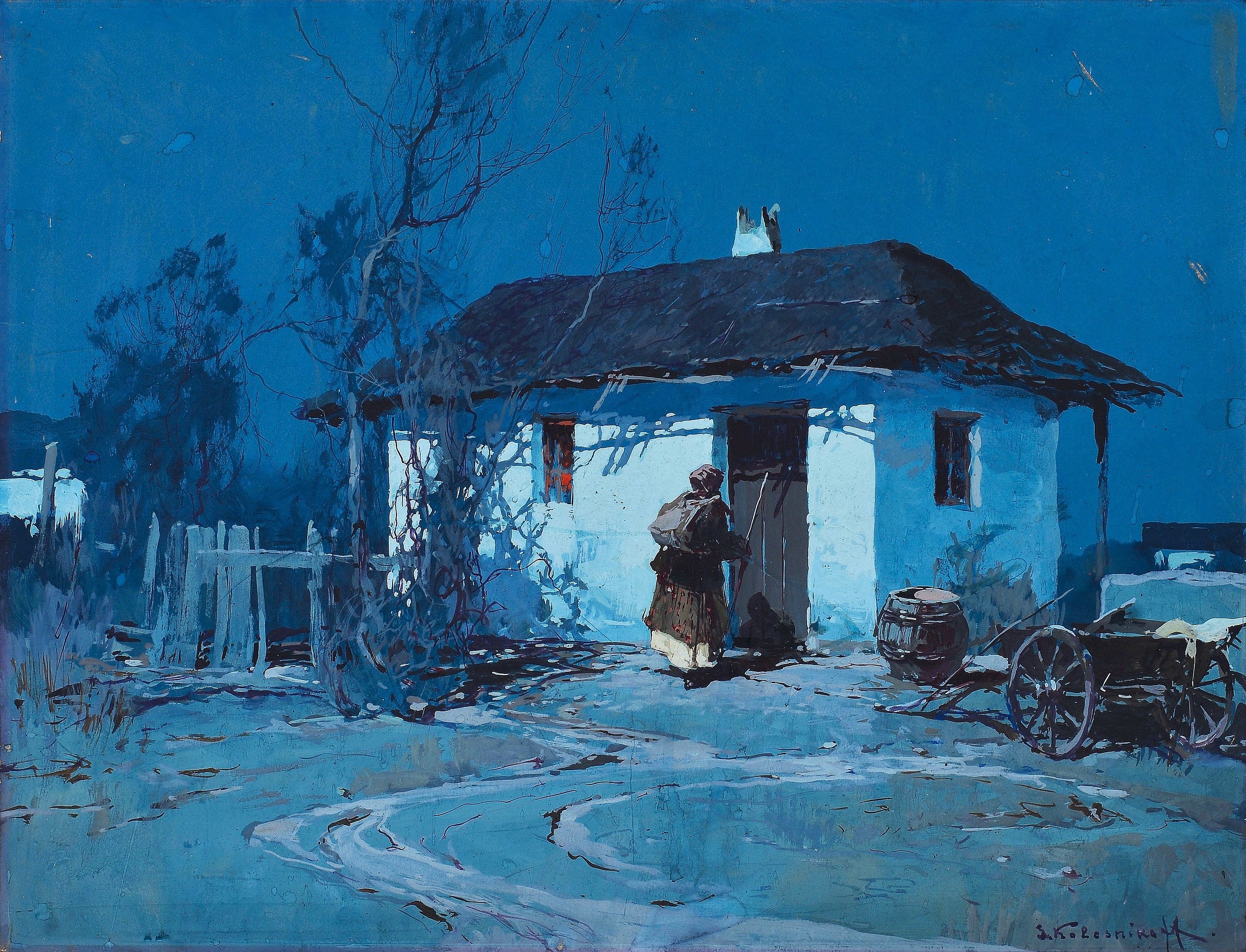 This painting, Night in Ukraine by Stepan Feodorovich Kolesnikov, created circa 1910, portrays a tranquil rural scene bathed in the cool hues of moonlight. The artwork features a small whitewashed house with a thatched roof, surrounded by bare trees and a quiet yard. A lone figure, wrapped in traditional attire, stands near the doorway, emphasizing a connection to Ukrainian peasant life. The deep blue palette and delicate play of light and shadow create a serene and atmospheric nocturnal ambiance, characteristic of Kolesnikov’s evocative style.