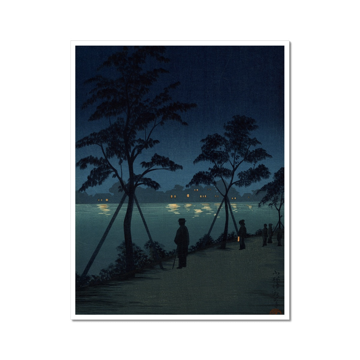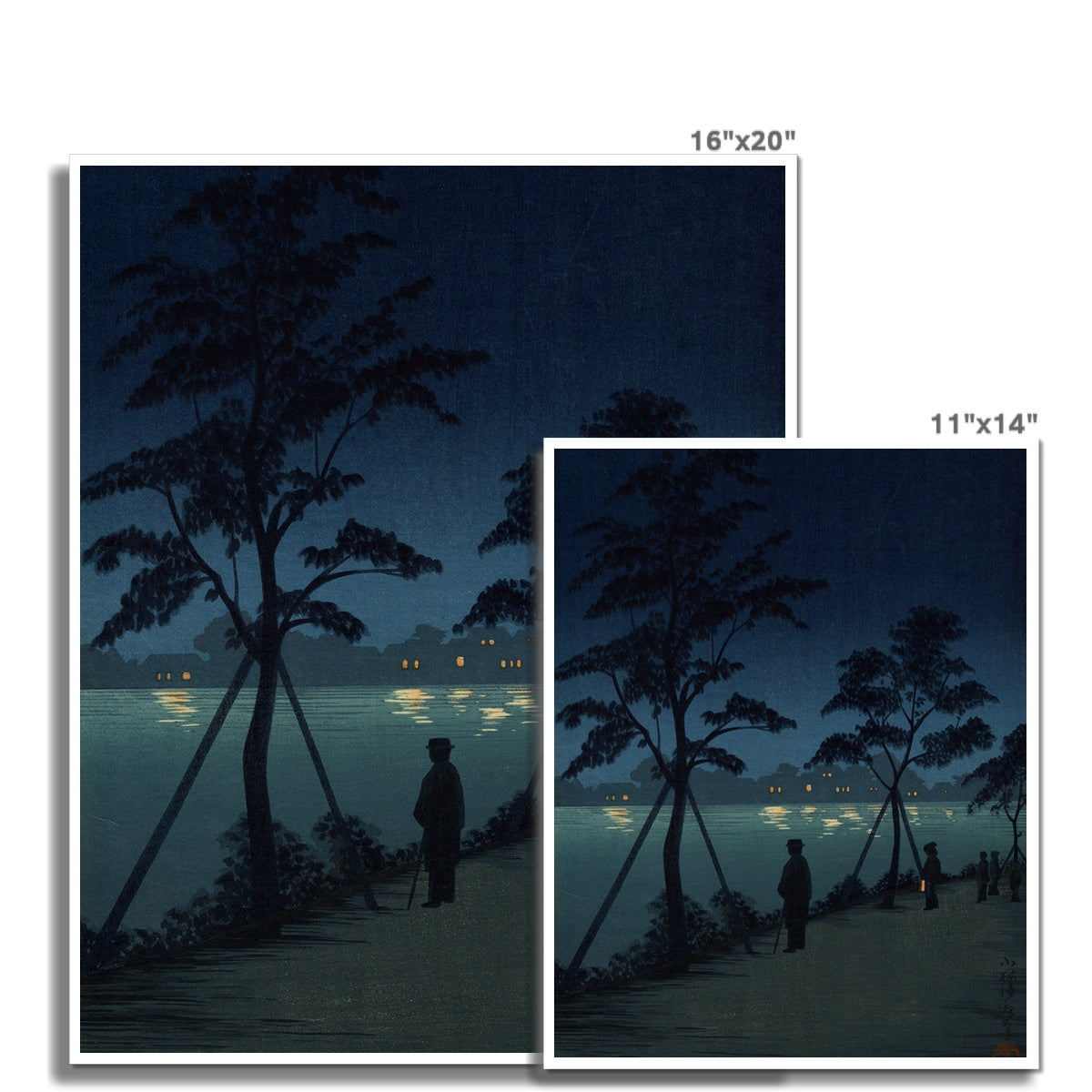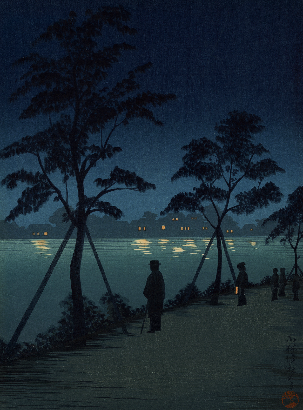 The artwork "Night Scene at Sumida River" by Kobayashi Kiyochika, created around 1930, portrays a serene nocturnal landscape along the Sumida River in Japan. The scene is characterized by a subdued colour palette, dominated by shades of blue and black, which evoke the quietude of the night. The composition is balanced with trees in the foreground, their delicate leaves forming silhouettes against the dark sky. Figures are depicted strolling or standing by the riverside, their forms rendered in simple yet expressive outlines, suggesting a contemplative or leisurely evening walk.