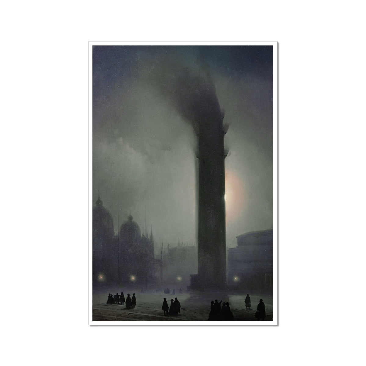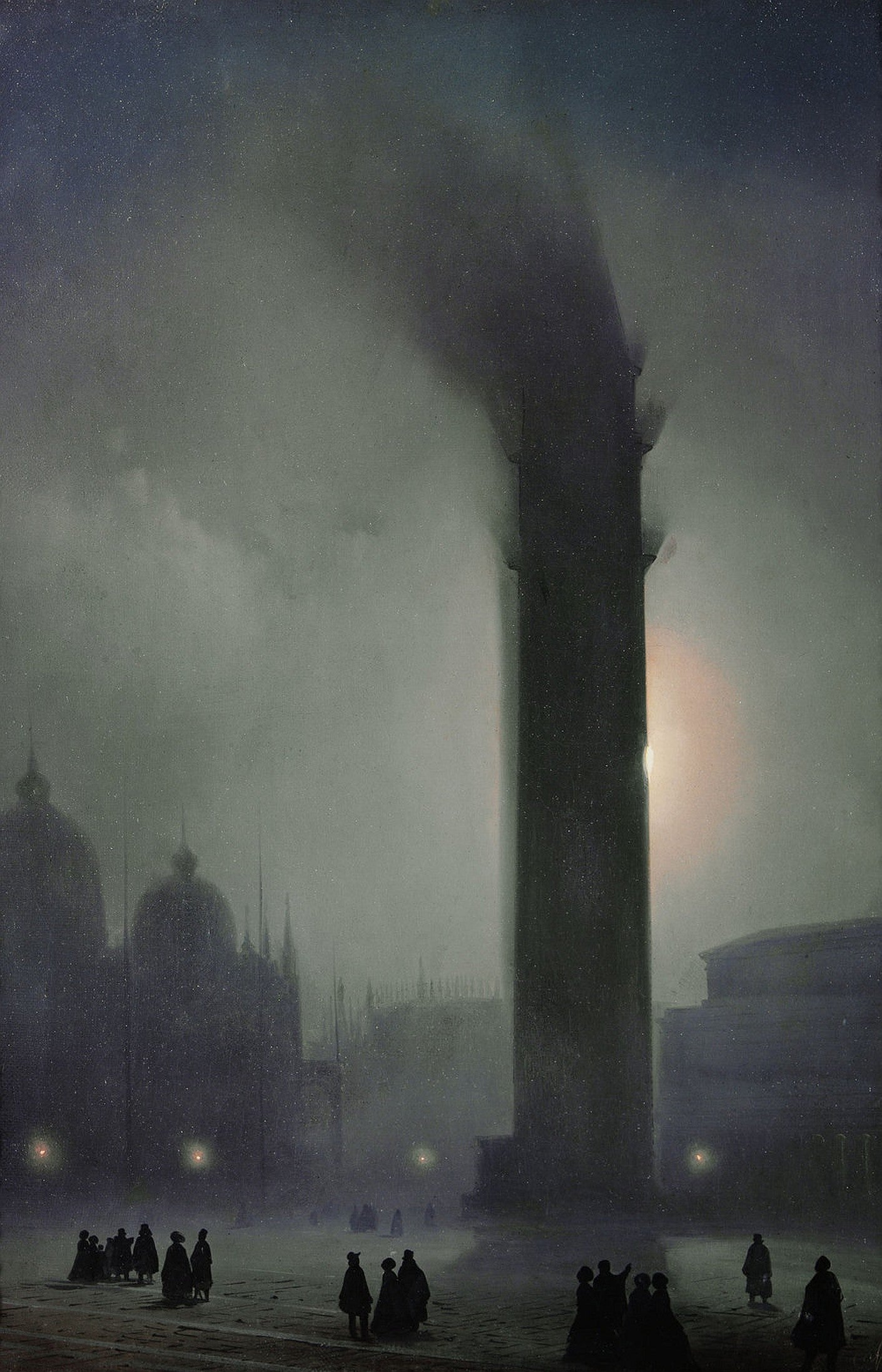 This 19th century painting from Ippolito Caffi, "Nocturne with Fog in Piazza San Marco," captures the dark, gloomy atmosphere of Venice at night. The use of shadows and fog create a mysterious and unique aesthetic, making for a captivating artwork.