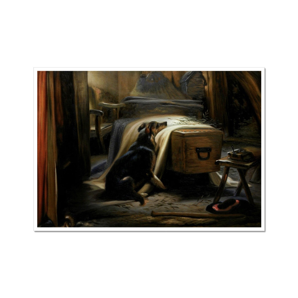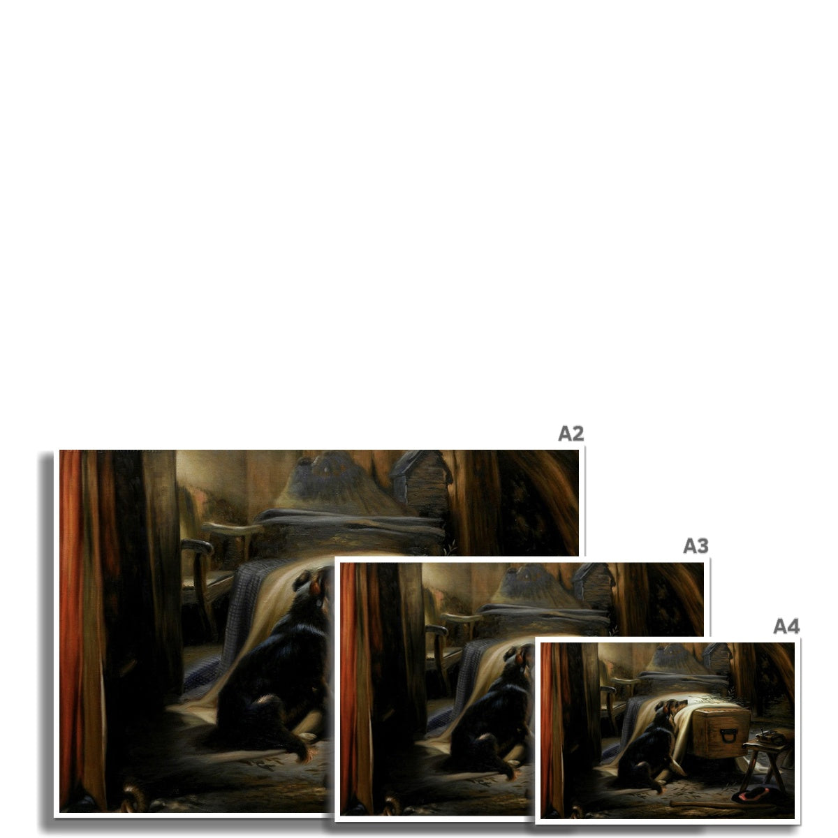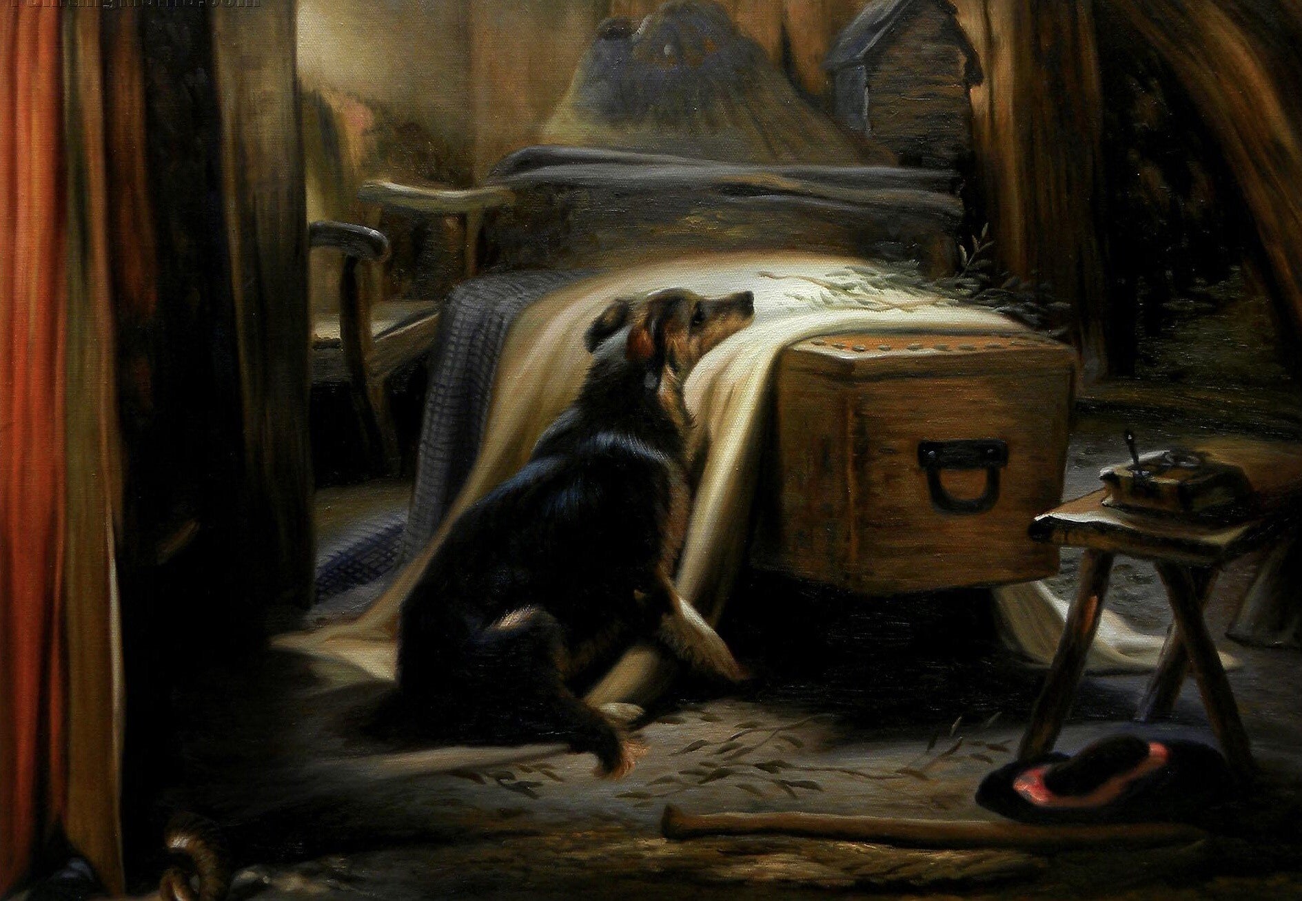 This painting, Old Shepherd’s Chief Mourner by Edwin Henry Landseer, created circa 1837, is a poignant depiction of loyalty and grief. The artwork portrays a dog resting its head on a coffin draped with a cloth, symbolizing the passing of its master, the shepherd. The dimly lit interior, humble surroundings, and meticulous details emphasize the deep emotional resonance of the scene. Landseer’s masterful technique captures the tender devotion of the dog, making it a timeless exploration of love, loss, and fidelity.