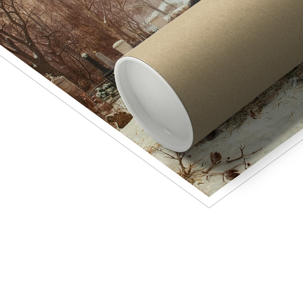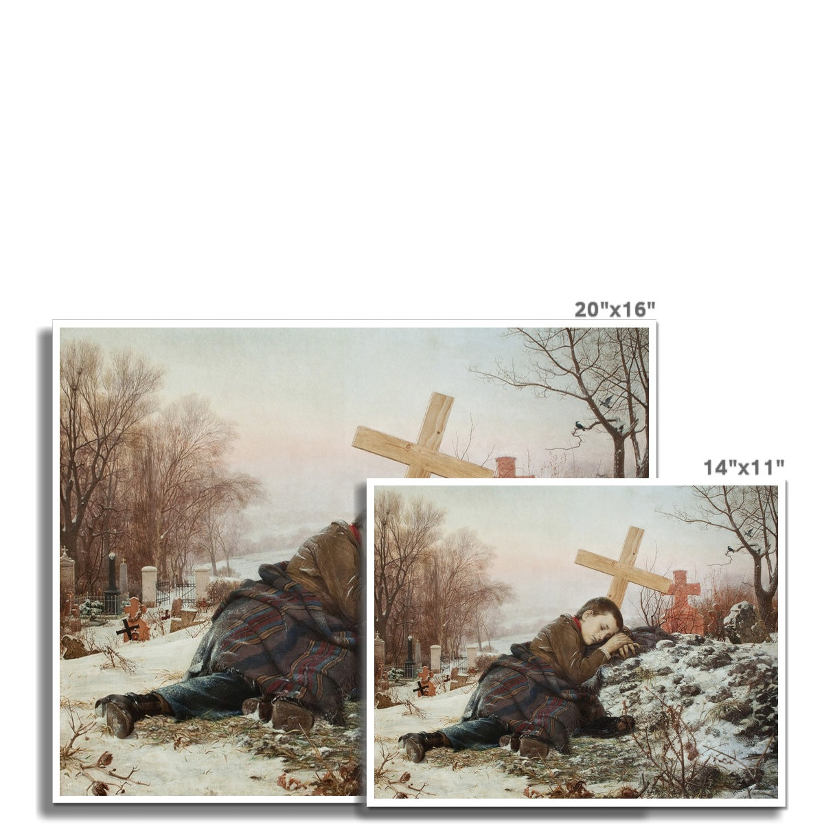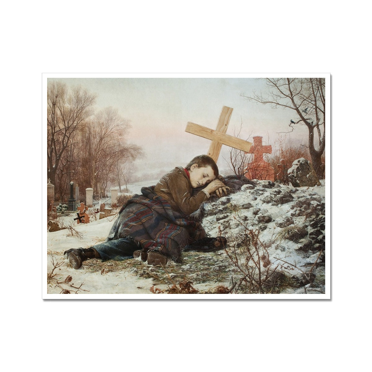 The painting titled "Orphan at Mother's Grave" by Uroš Predić, created in 1888, is a poignant work of art that depicts a young boy mourning at the grave of his mother. The scene is set against a wintry backdrop, likely conveying the coldness and desolation of loss. The boy, wrapped in a plaid blanket, is seen lying on the ground with his head resting on his arm, which is propped up on the snow-covered grave marked by a simple wooden cross. The barren trees and grey skies further enhance the sombre mood of the painting, making it a powerful representation of grief and solitude.