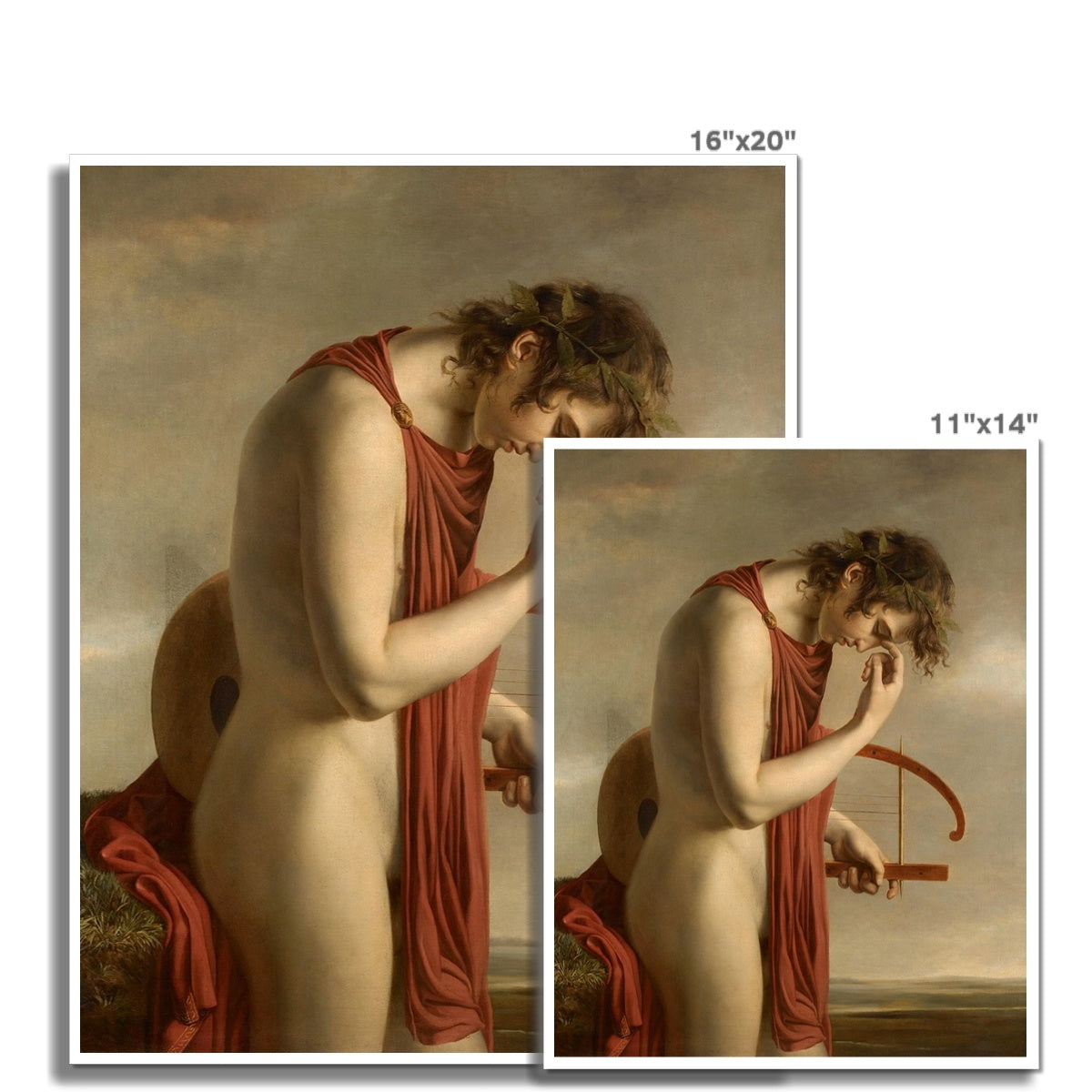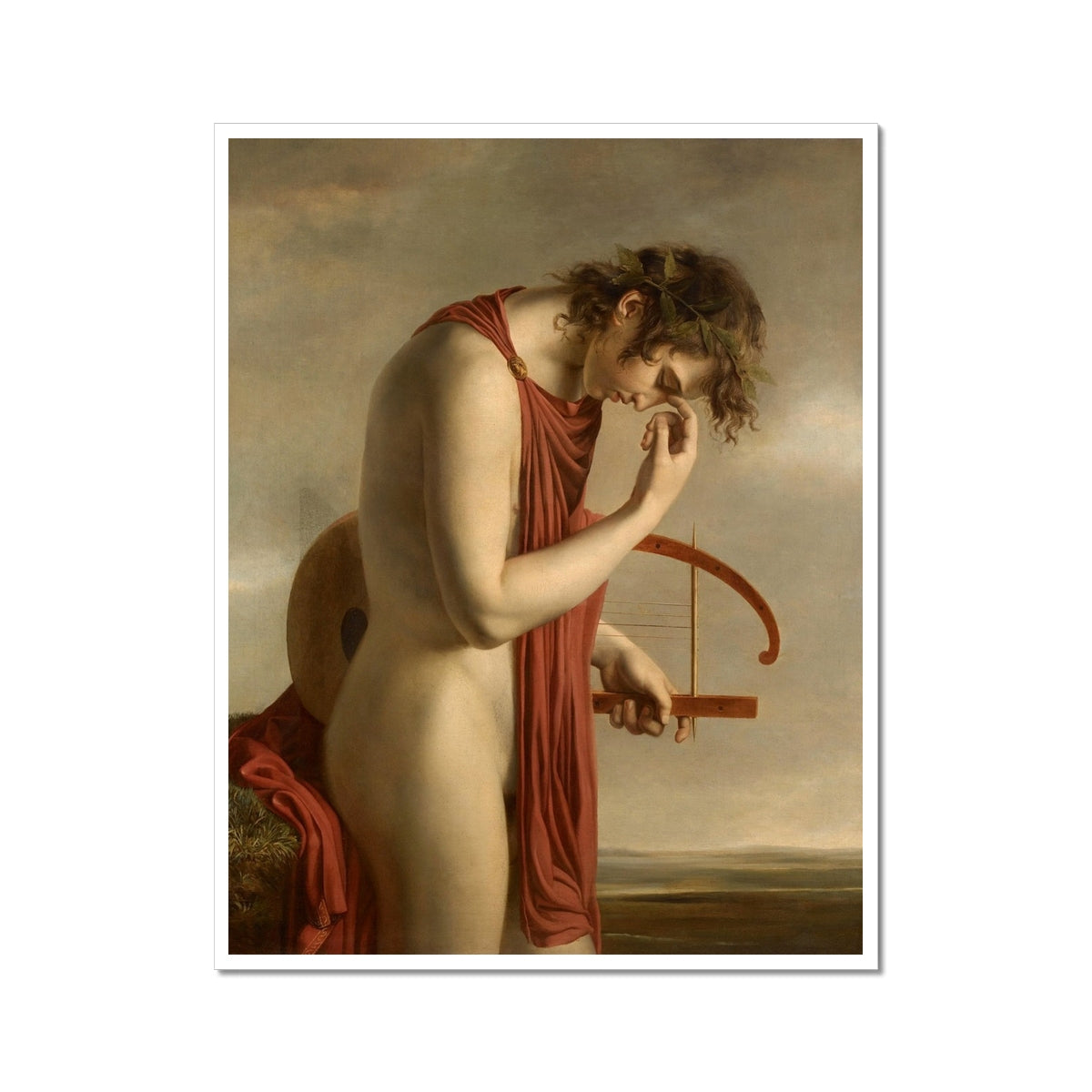 This painting, titled Orpheus by Paul Duqueylar, portrays the mythological musician and poet in a moment of deep sorrow. The young, nude Orpheus is depicted in a classical pose, draped modestly with a red cloth, a laurel wreath on his head, and holding a lyre—his iconic instrument. His downcast gaze and hand raised to his face suggest mourning or lament, likely referencing the tragic loss of his beloved Eurydice. The muted background and soft lighting enhance the melancholic and introspective mood of the piece, emphasizing Neoclassical ideals of beauty, emotion, and restraint.