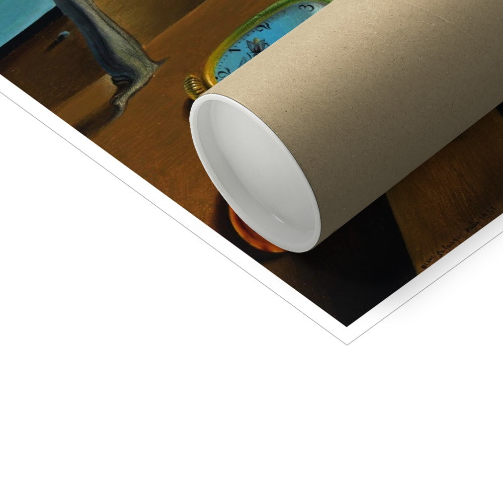 The painting "The Persistence of Memory" by Salvador Dalí, created in 1931, is one of the most iconic and recognizable works of Surrealism. It features a dreamlike landscape with a desolate, barren background that suggests a twilight or dawn setting with a calm sea or bay. The central motif is a series of melting clocks draped over various objects, including a tree branch, the edge of a table or platform, and what appears to be a sleeping face, often interpreted as a self-portrait of Dalí himself, though distorted and dreamlike. The soft, melting clocks are thought to represent the fluidity and relativity of time within the dream state. The precise detail in which these surreal elements are painted contrasts with the irrationality of the scene, creating a paradoxical visual experience that challenges viewers' perceptions of reality. The overall effect is one of eerie stillness and otherworldly quietness, making it a quintessential piece of Dalí's exploration of the subconscious.