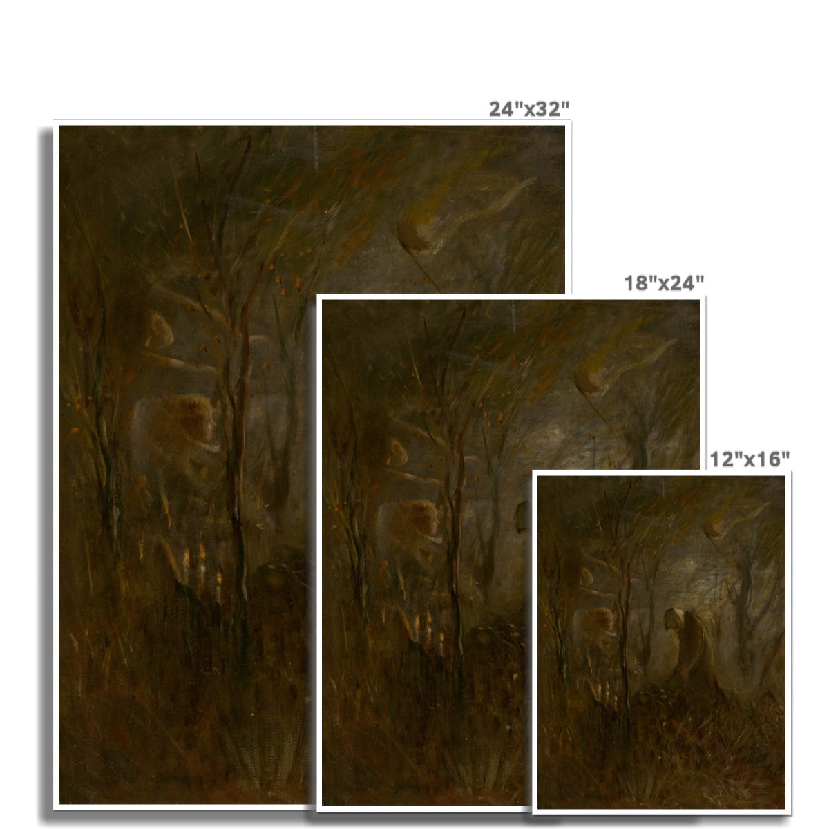 "Prayer Over The Grave," circa 1895, is an evocative painting by László Mednyánszky that embodies a profound sense of solemnity and reflection. This atmospheric piece captures a moment of private contemplation, as a figure appears deeply immersed in prayer or mourning beside a grave. Mednyánszky's masterful use of muted earth tones and the interplay of light and shadow create a moody and introspective ambiance. The brushwork suggests the fleeting nature of life and the inevitability of decay, as seen in the transient quality of the surrounding landscape. The artwork is a poignant representation of grief and remembrance, imbued with the spiritual and emotional depth characteristic of Mednyánszky's works.