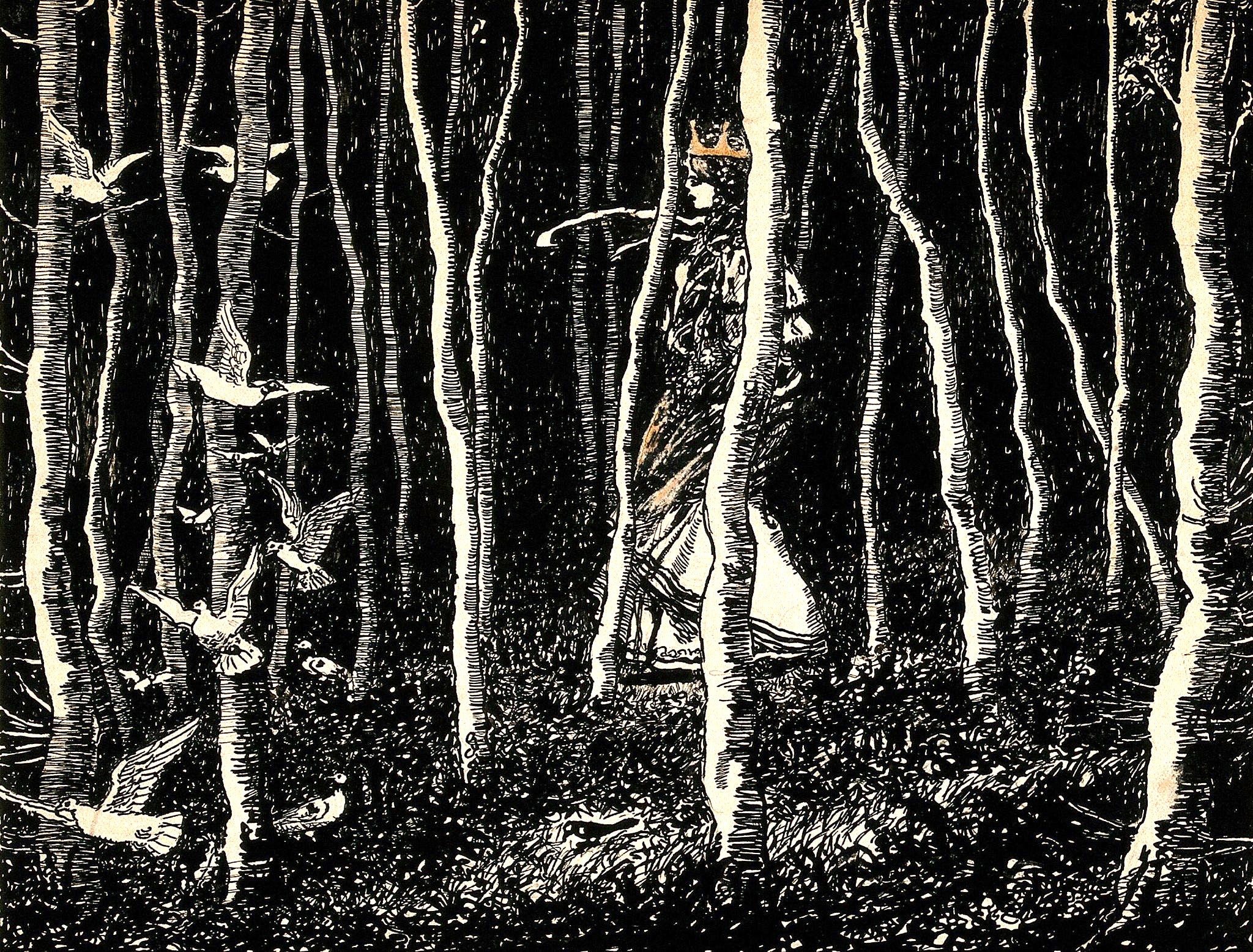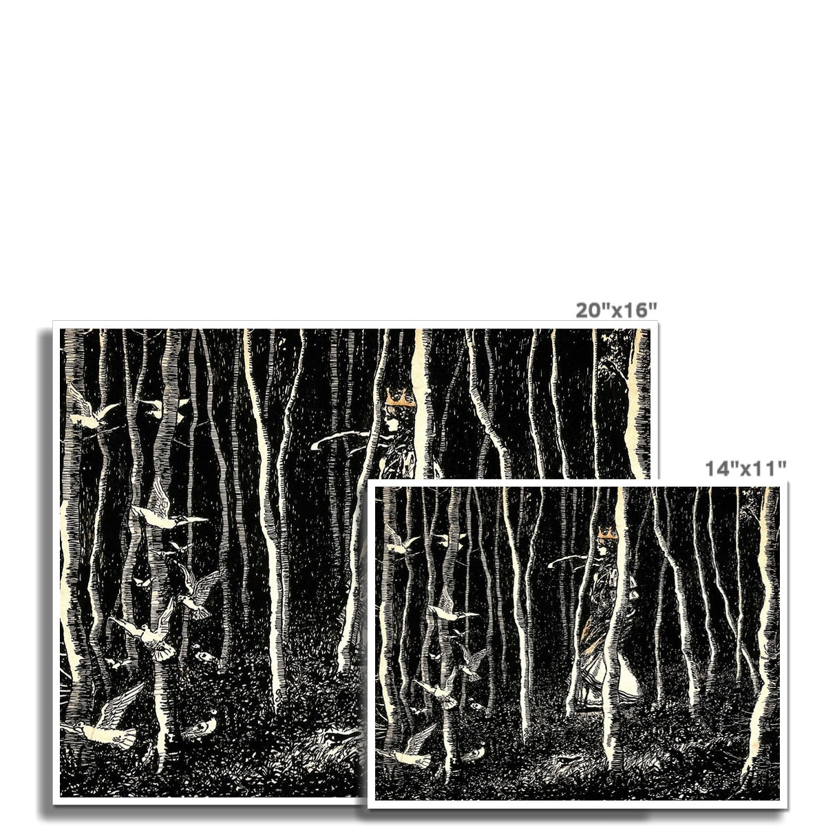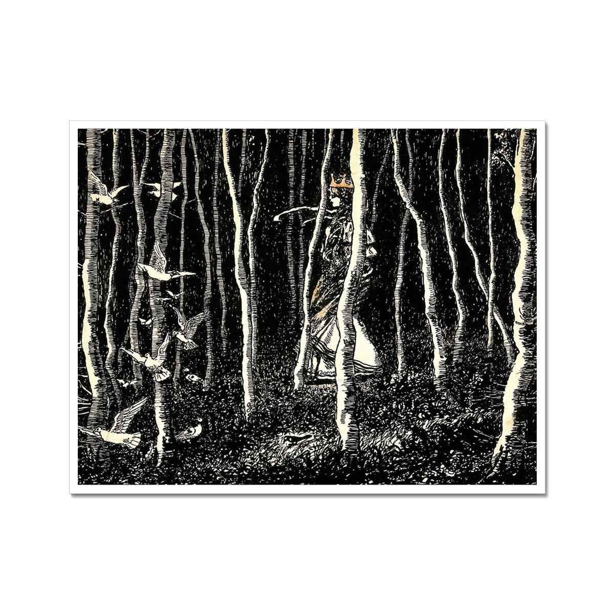 Princess Walking in a Forest by Haldane Macfall, created in the 19th century, is an evocative black-and-white illustration that captures the mysterious and enchanting atmosphere of a dense forest. The princess, adorned with a crown, is depicted moving gracefully through the tall, thin trees that surround her like an intricate lattice. The stark contrast between the dark forest floor and the illuminated white trees creates a striking, dreamlike ambiance. Birds flit through the scene, adding life and movement, while the overall composition conveys a sense of solitude and quiet majesty. The artwork reflects Macfall's skill in blending natural beauty with a sense of fairy tale wonder.