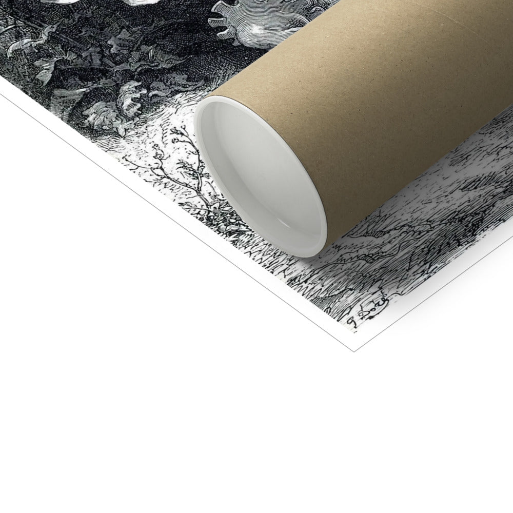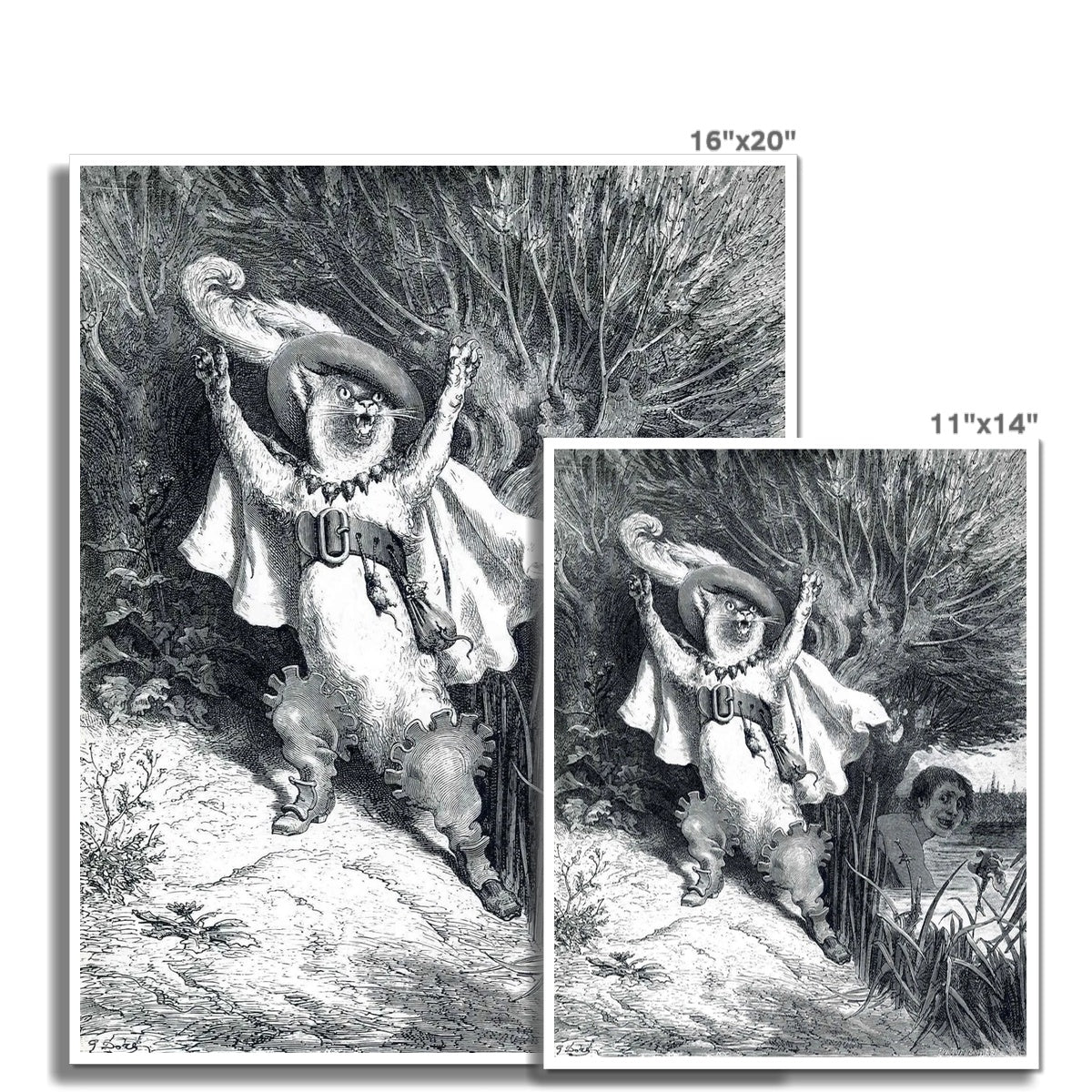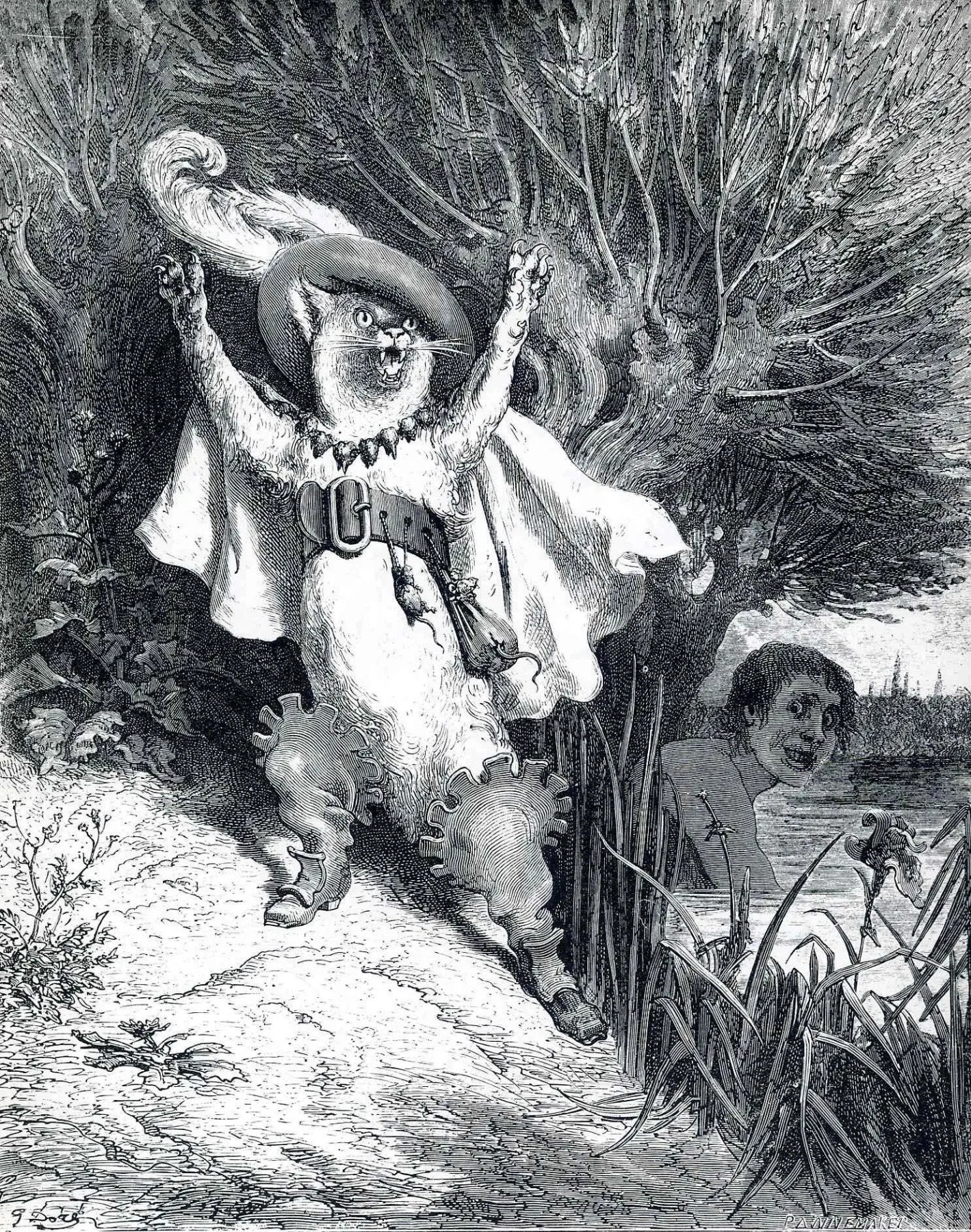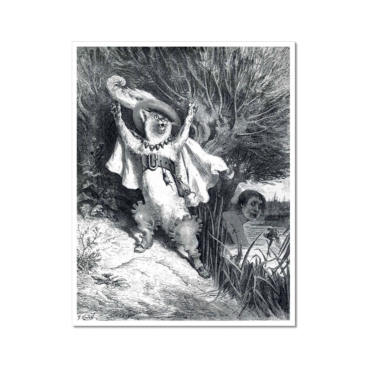 This illustration, Puss in Boots by Gustave Doré, created circa 1867, depicts the cunning cat from Charles Perrault's famous fairy tale. The anthropomorphic Puss is shown in his signature flamboyant attire, including a feathered hat, cape, and boots, dramatically raising his paws in an expressive gesture. His commanding pose captures his cleverness and charisma. In the background, a man watches from a riverbank, emphasizing the storytelling moment. Doré’s intricate engraving style adds depth and dynamism to this classic scene, bringing the mischievous and resourceful character to life.
