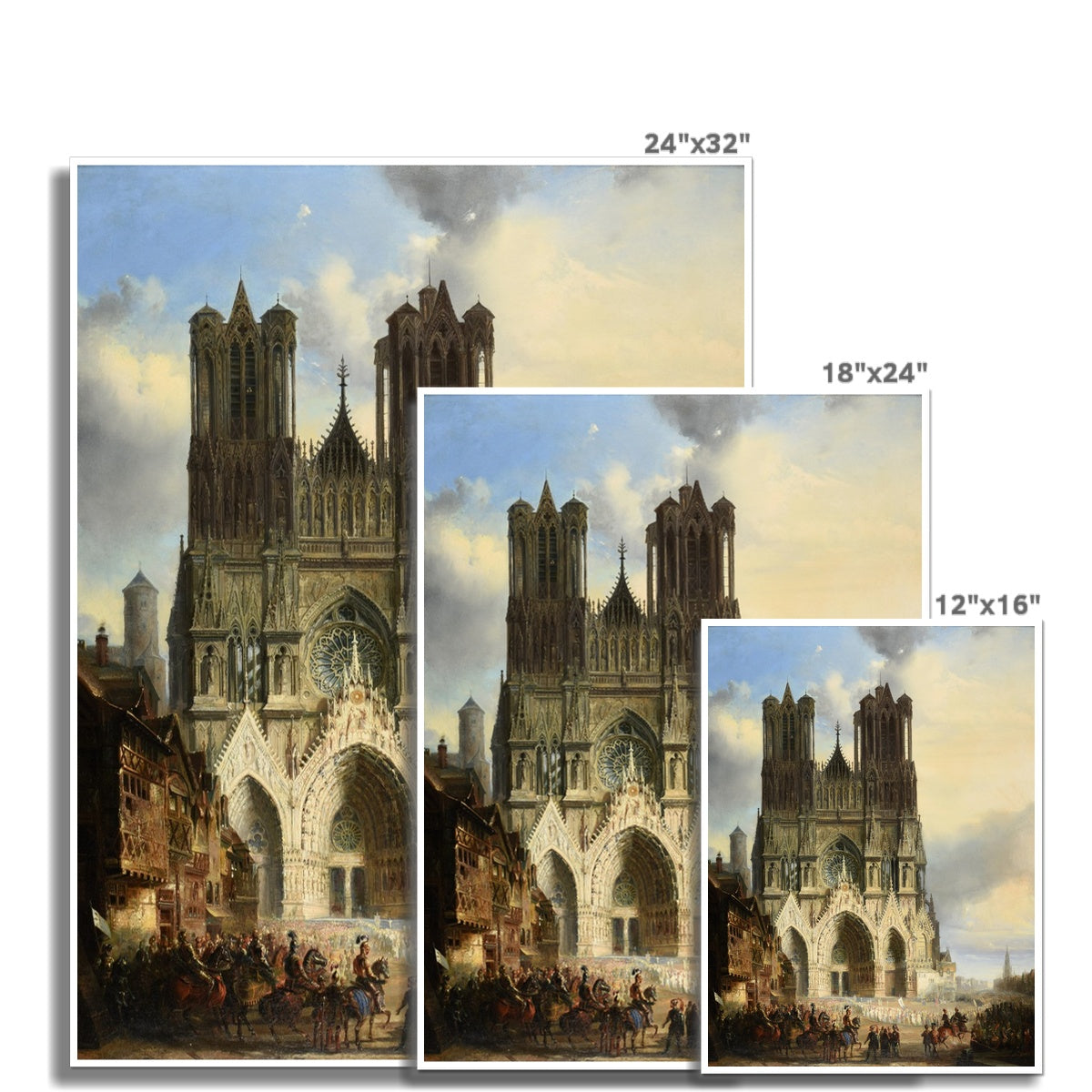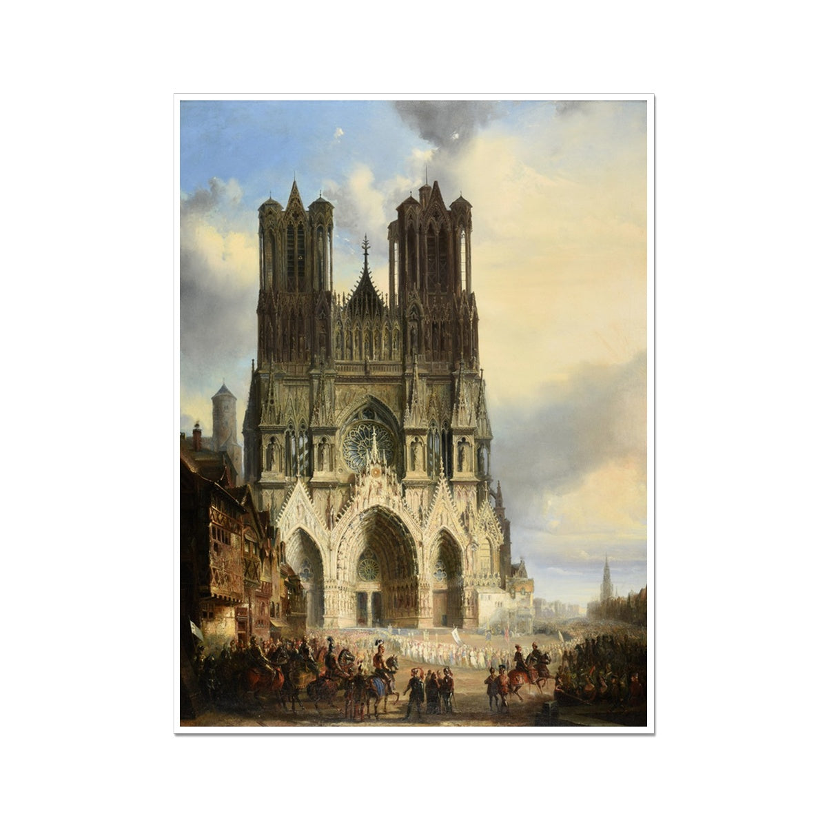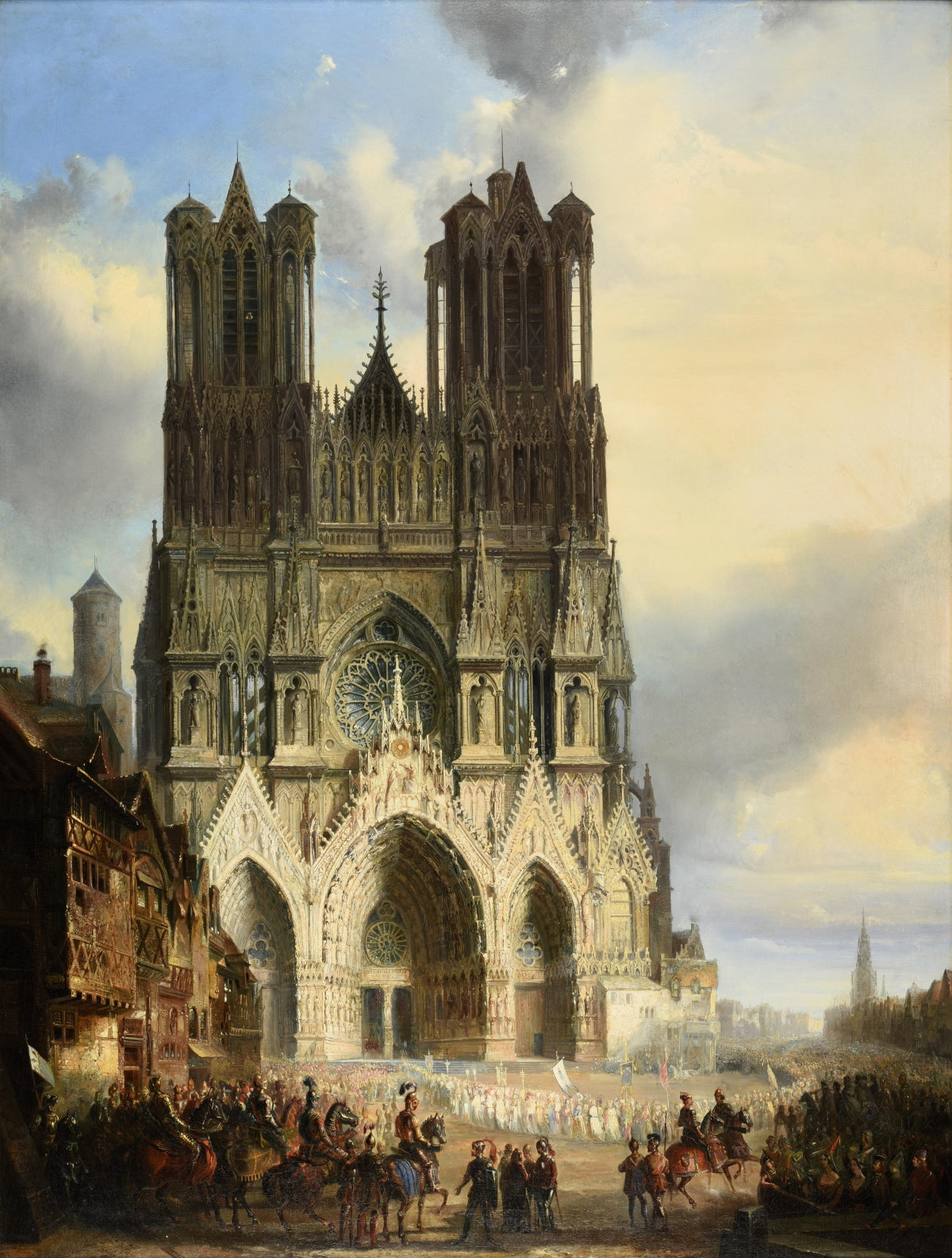 The painting "Reims Cathedral with a Medieval Procession" by David Roberts, from the 19th century, portrays the magnificent Reims Cathedral, a masterpiece of Gothic architecture, under a partly clouded sky. The cathedral stands with its intricate façades, grand spires, and the famous rose window, capturing the architectural splendor of the era. In the foreground, a colorful medieval procession is taking place, with figures in period attire, some on horseback and others on foot, adding a dynamic and lively atmosphere to the scene. The presence of military personnel, clergy, and townsfolk suggests an event of significance, possibly related to a royal or religious ceremony. The detailed depiction of the figures, the cathedral, and the surrounding buildings showcases Roberts' ability to combine historical accuracy with artistic flair. The play of light on the stone surfaces of the cathedral contrasts with the shadows of the foreground, drawing the viewer's eye to the grandeur of the edifice and the vibrancy of the procession.