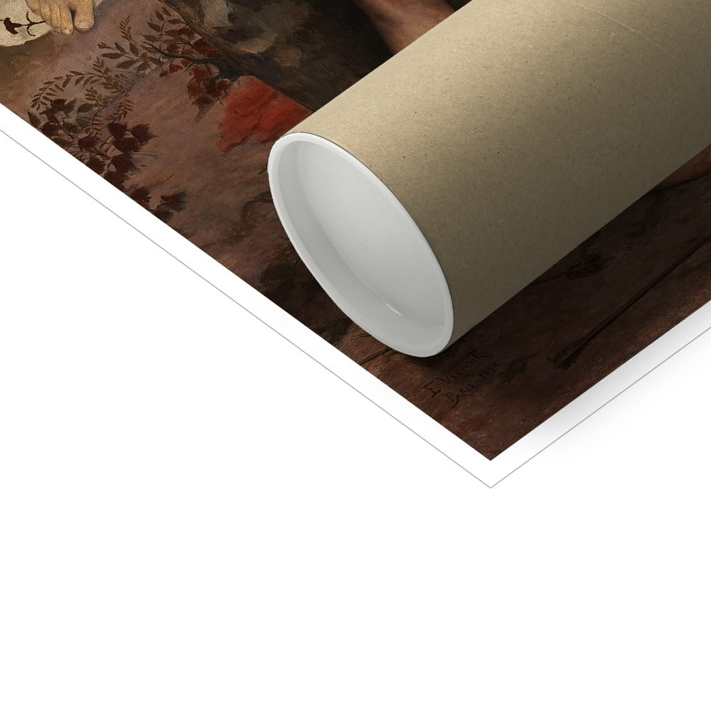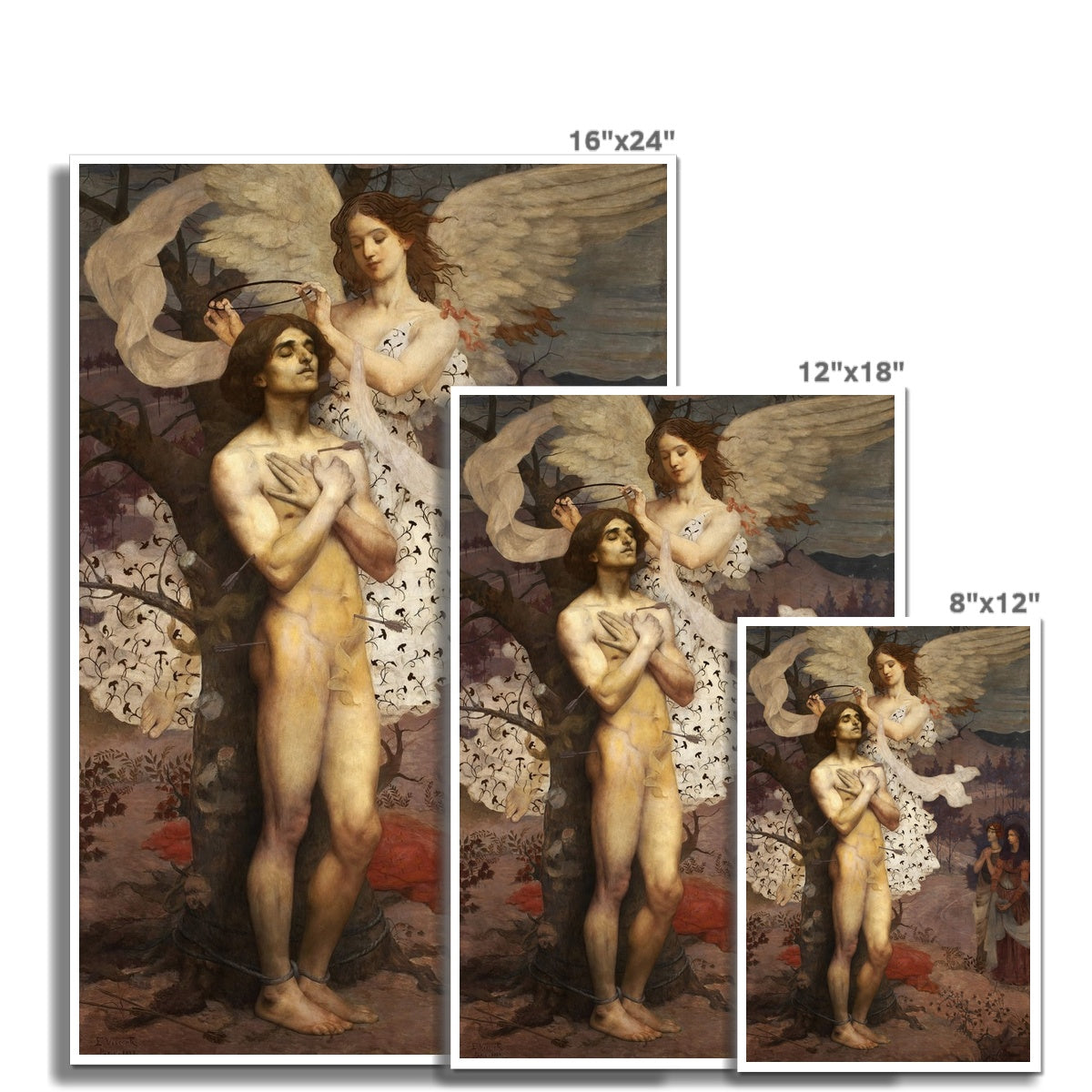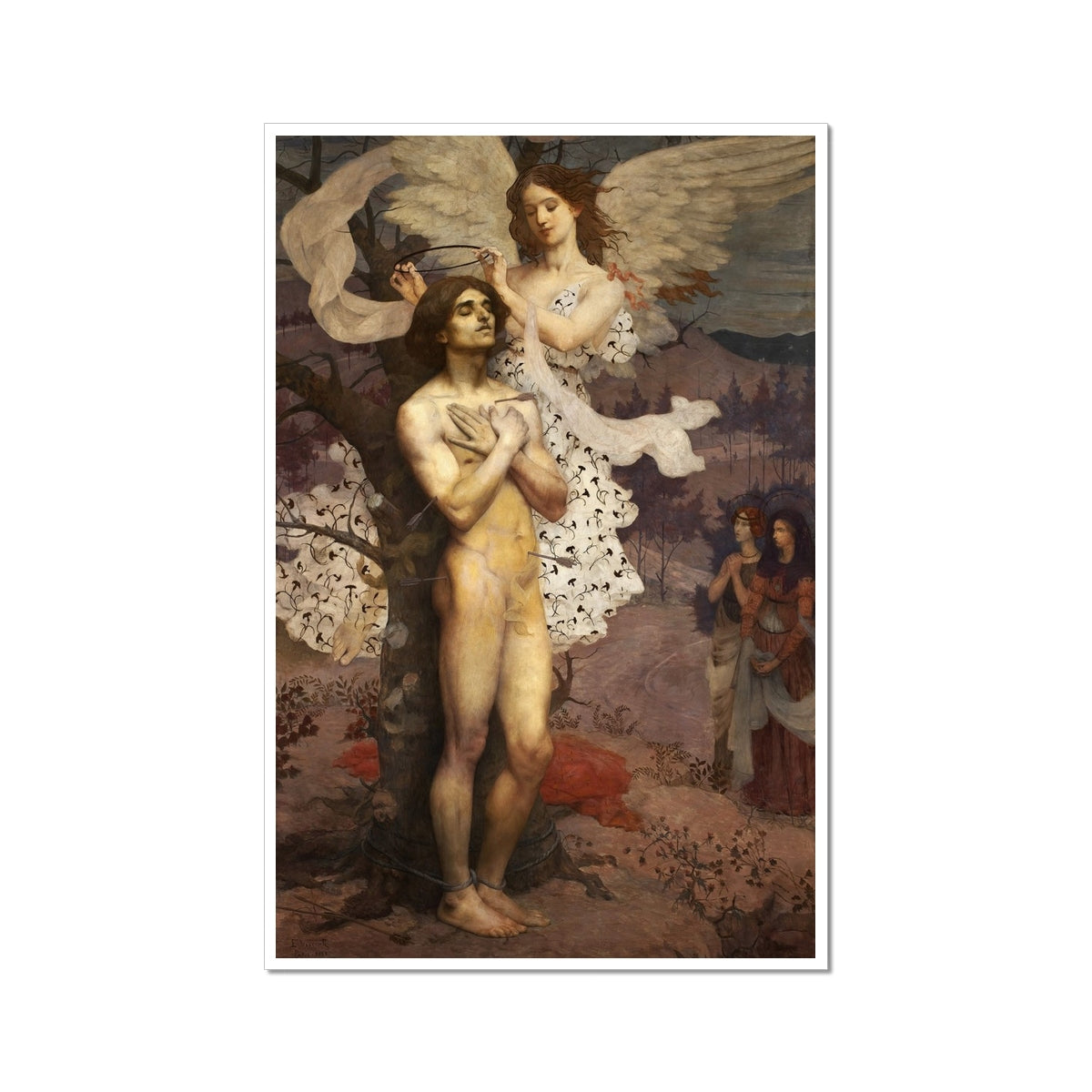 This painting, Reward of Saint Sebastian by Eliseu Visconti (1898), depicts a tender and spiritual interpretation of the martyrdom of Saint Sebastian. The saint, bound to a tree and pierced with arrows, is shown in a serene and contemplative pose, his face reflecting a sense of divine grace rather than suffering. An angel, gentle and ethereal, crowns him with a laurel wreath, symbolizing his reward for faith and martyrdom. The background features soft, muted tones of a forest landscape, with two onlookers in the distance, adding depth to the scene. Visconti’s use of light and delicate brushstrokes creates a harmonious blend of the earthly and divine, emphasizing themes of redemption and transcendence.