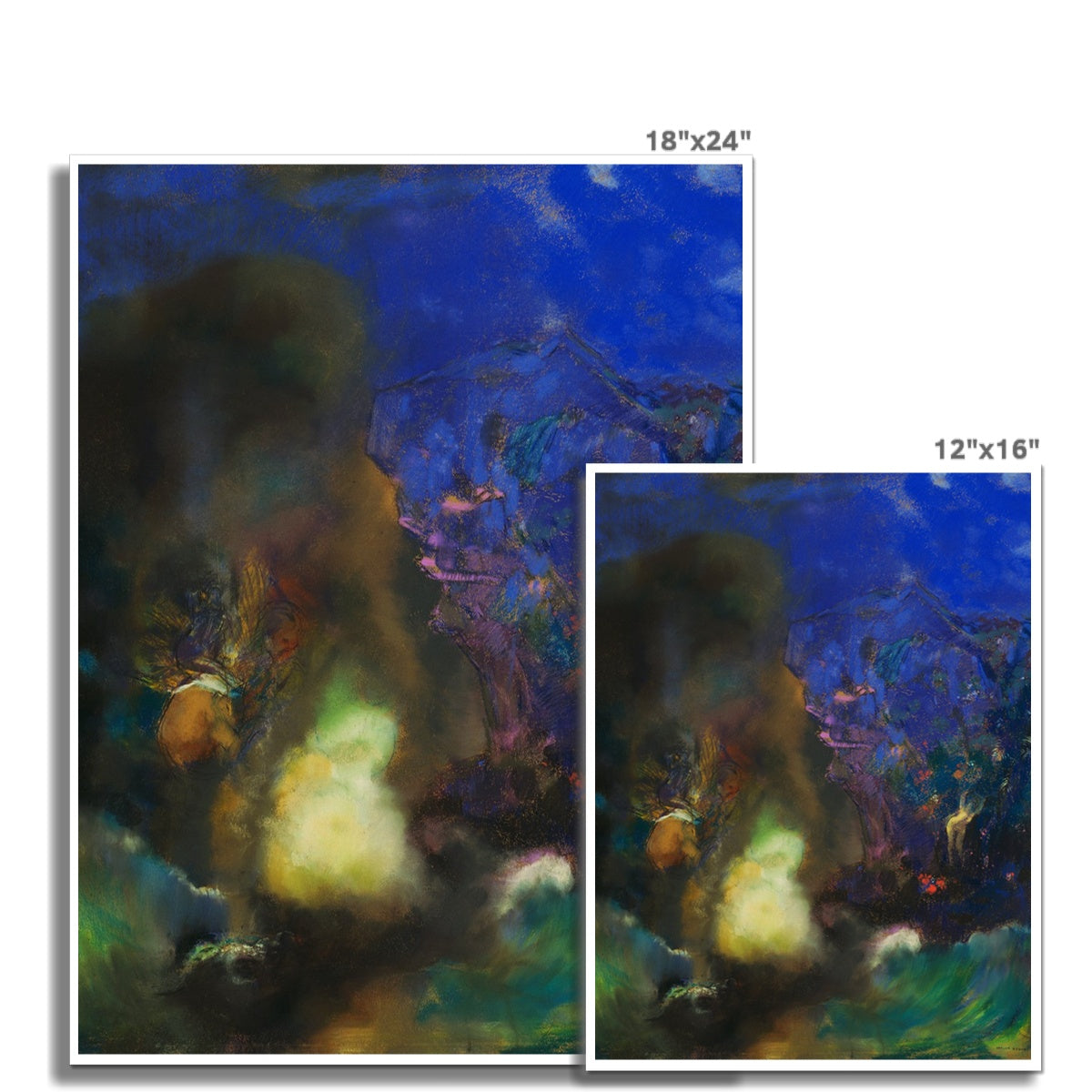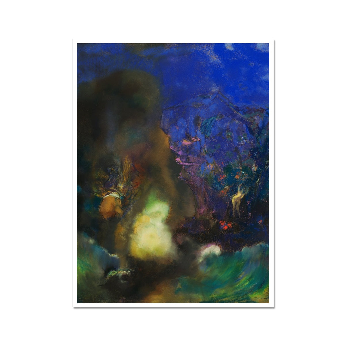 "Roger and Angelica" by Odilon Redon, created around 1910, is a vibrant work that encapsulates the fantastical elements of the narrative it depicts. The piece is inspired by the poem "Orlando Furioso" by Ludovico Ariosto, where the knight Roger saves the maiden Angelica from a sea monster. Redon's interpretation is a dreamlike vision that captures the dramatic moment of rescue. The painting is characterized by its vivid colors and swirling composition, creating a sense of movement and emotional intensity. Redon’s use of color and form abstracts the figures and the scene, giving the impression of a fleeting, mystical encounter. The dramatic contrast between the dark and light elements, as well as the use of saturated blues, suggests both the danger present and the miraculous nature of the event. This artwork is a quintessential example of Redon's symbolist approach, where the subject matter is conveyed through a powerful and personal visual language.