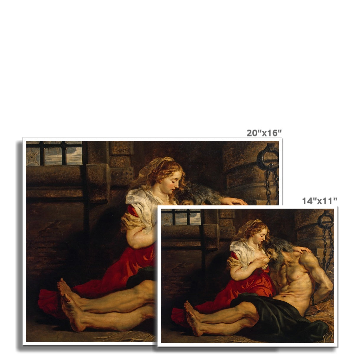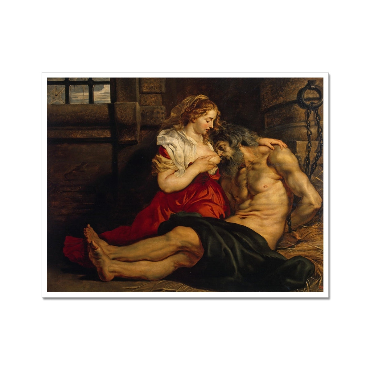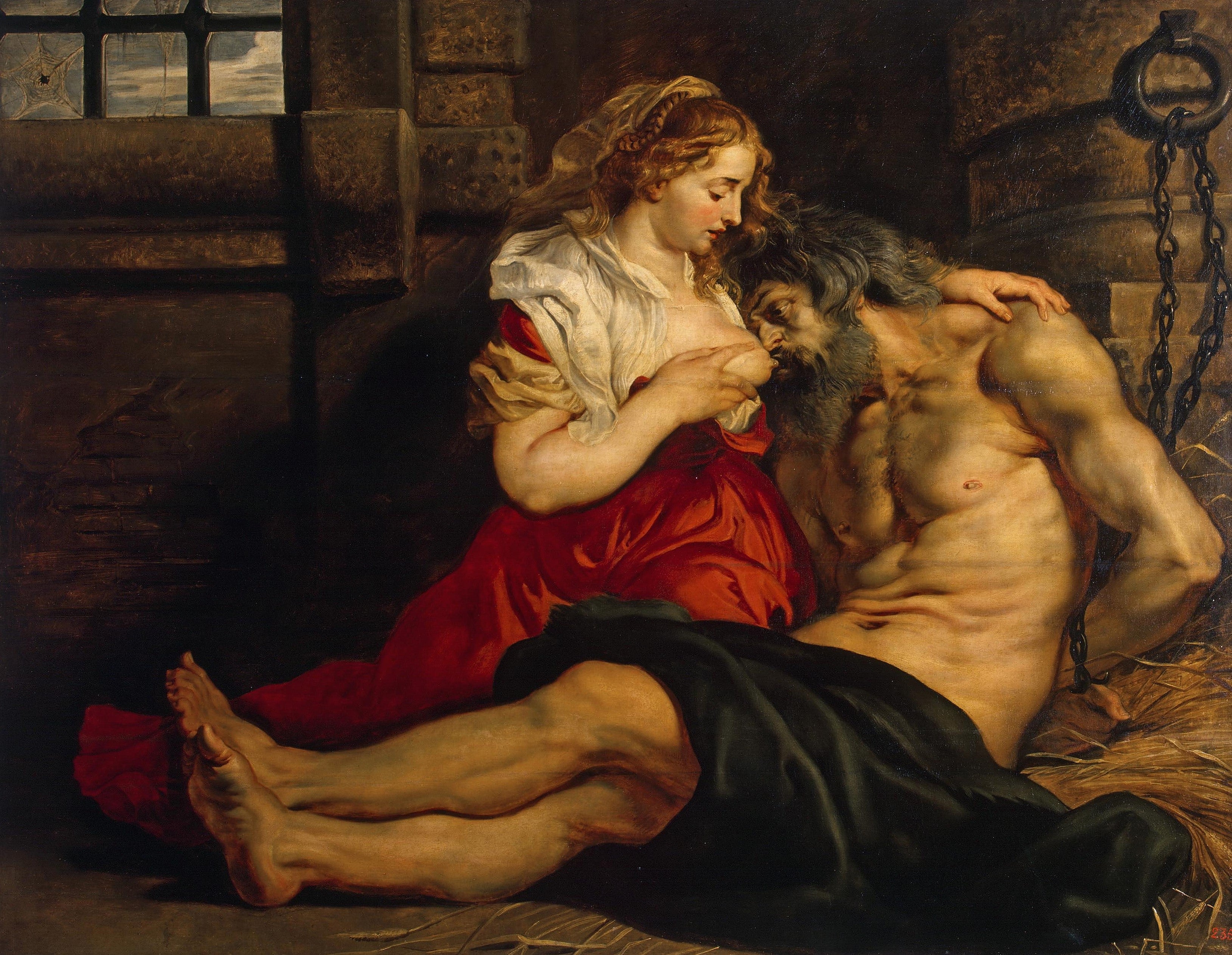 This painting illustrates the story of Roman Charity, where Pero, a young daughter, breastfeeds her imprisoned father, Cimon, condemned to starve. The act of selflessness and familial devotion is the focal point. Rubens captures intense emotions, with Pero's face showing compassion and determination, while Cimon's expression reflects gratitude and desperation. Their close physical connection highlights their deep bond. The painting uses dramatic contrasts of light and shadow, enhancing the scene's theatricality and focusing attention on the figures and their interaction. It symbolizes filial piety, self-sacrifice, and Roman virtues of moral duty and compassion.