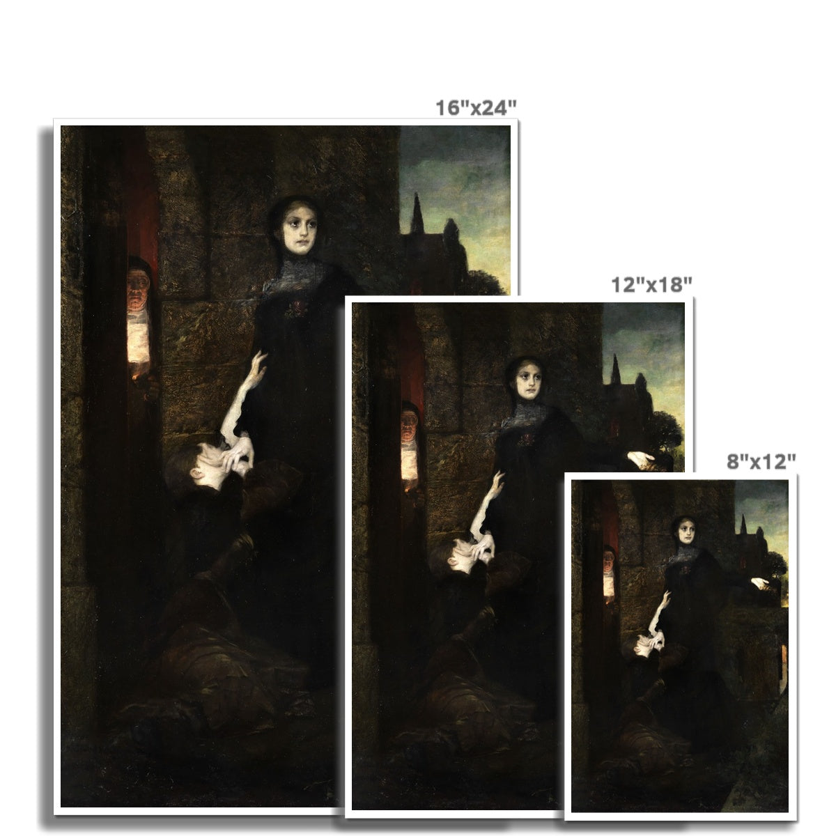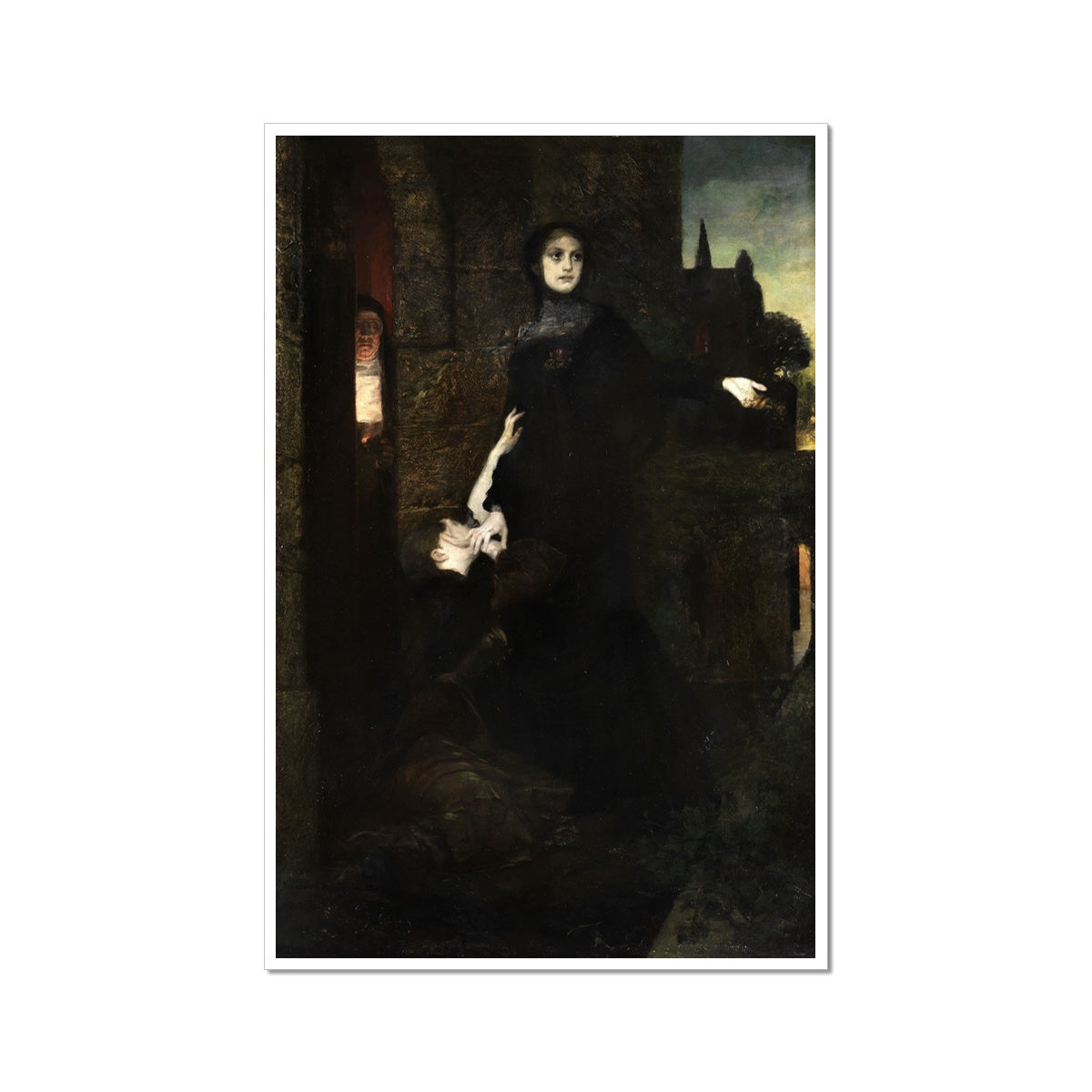 This painting by Ferdinand Keller, a German artist, portrays a dramatic nocturnal scene. A pale, somber woman in black stands at the center, extending her arm towards a child, who appears in a vulnerable position, reaching out to her. The background features a shadowy gothic landscape with a glimpse of a cathedral, contributing to the eerie, mysterious atmosphere. The use of light and shadow enhances the emotional intensity and the overall gothic mood of the piece.