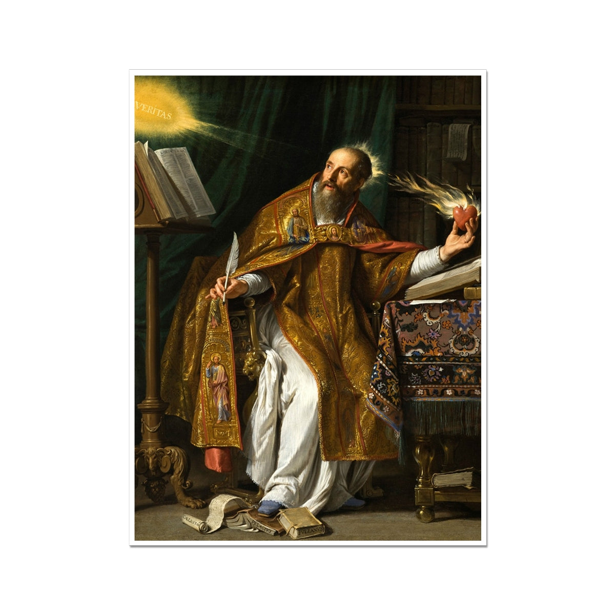 This painting portrays Saint Augustine—one of the most pivotal figures in Christian theology—seated at his writing desk, adorned in ornate ecclesiastical vestments. In his left hand, he holds a flaming heart, a powerful symbol of his fervent love for and devotion to God. His gaze is lifted toward a radiant divine light bearing the word Veritas (Truth), signifying his unwavering quest for spiritual enlightenment and ultimate truth. Champaigne’s masterful technique is evident in his meticulous rendering of textures, from the opulent fabrics to the finely detailed patterns of the carpet and vestments. The composition as a whole underscores Augustine’s identity as both a devoted scholar and an ardent seeker of divine truth.