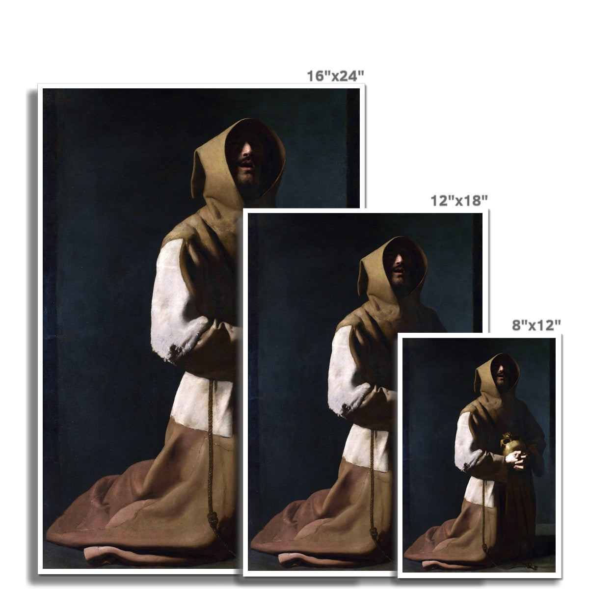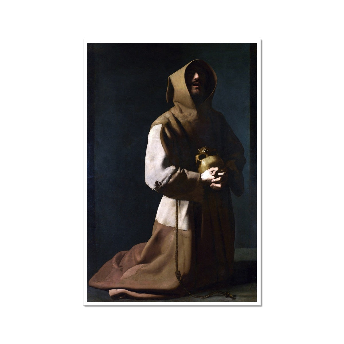 "Saint Francis in Meditation" is a painting by Spanish Baroque artist Francisco de Zurbarán, created in the early 17th century. The painting depicts Saint Francis of Assisi in a contemplative pose, with his hands folded in prayer and his eyes downcast. The saint is shown against a dark background, emphasizing his spiritual introspection and detachment from worldly distractions. The painting is notable for its simple, austere composition and its use of light, which creates a glowing aura around the saint, reinforcing his holiness and purity. The painting is considered a masterpiece of Spanish Baroque art and is admired for its serene beauty and spiritual intensity.