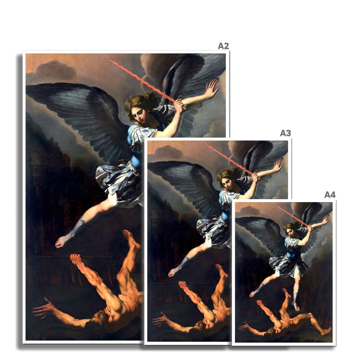 This painting is a dramatic depiction of Saint Michael the Archangel, often portrayed as a warrior angel in Christian iconography. Saint Michael is known for his battle against evil, typically shown as him defeating Satan, often represented as a dragon or a demonic figure. In this particular work, Saint Michael is seen in mid-air, his wings outstretched, with a bold, defiant expression as he wields a sword or spear, symbolizing the fight against darkness. The defeated figure below represents evil being vanquished. The use of chiaroscuro, the strong contrast between light and dark, adds to the intensity and drama of the scene. This painting exemplifies the Baroque era's focus on movement, detail, and emotional intensity.