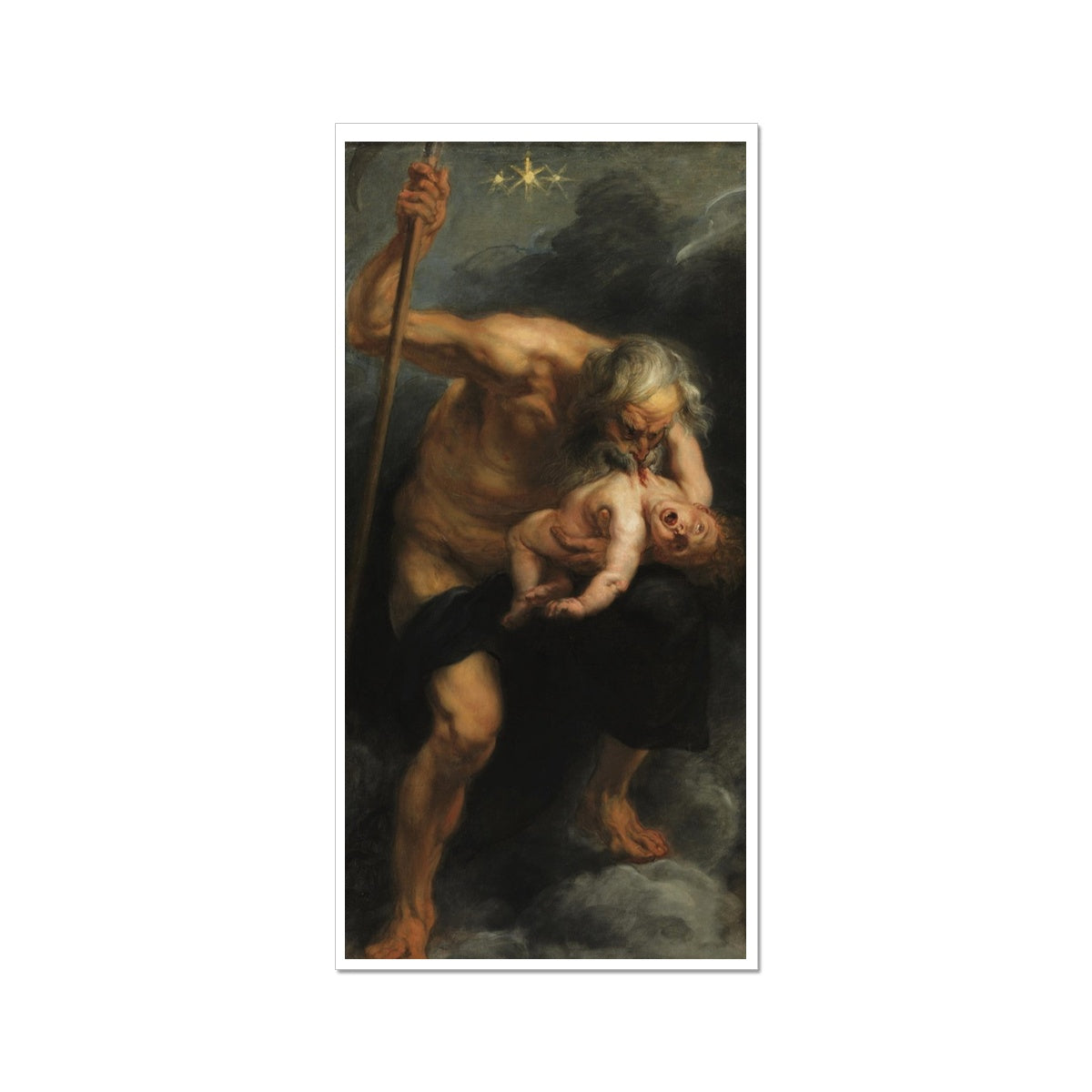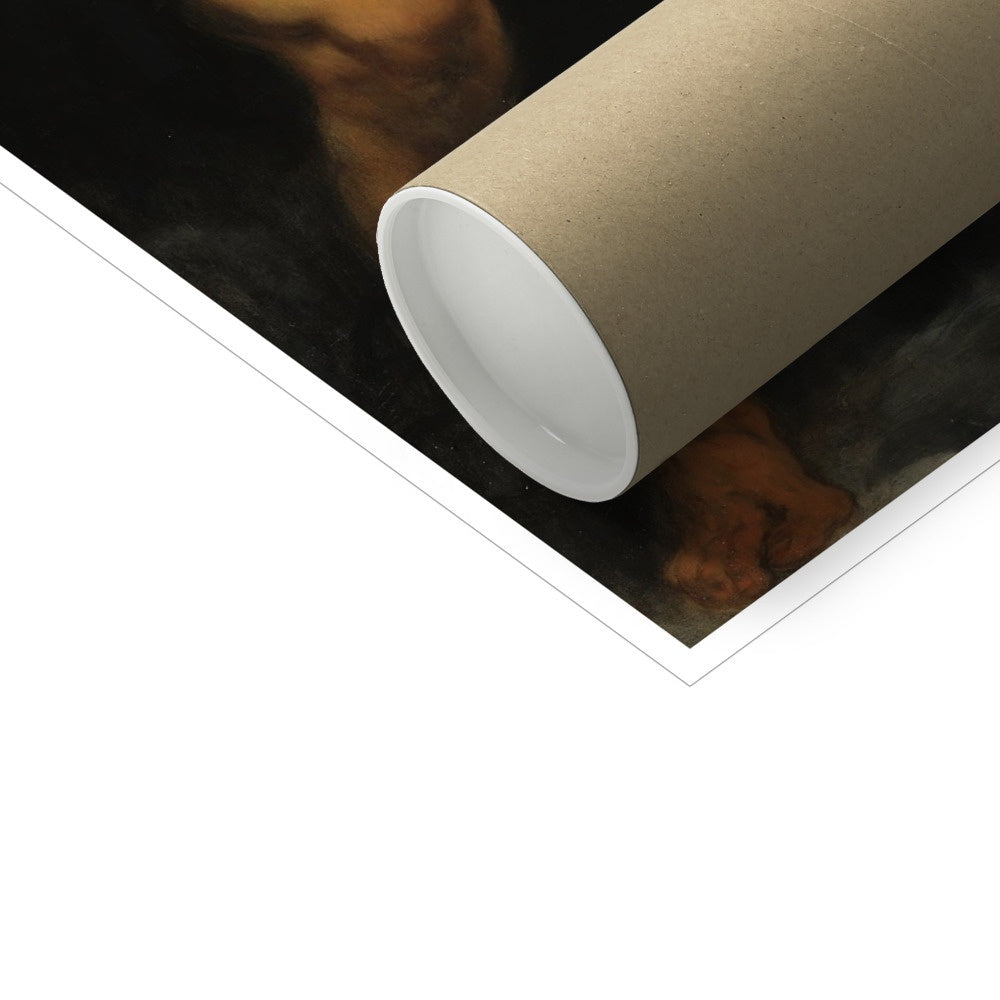 "Saturn Devouring His Son," by Peter Paul Rubens, depicts the mythological event where Saturn, fearing that he would be overthrown by one of his children, eats each one upon their birth. The artwork is a dramatic and dark representation of this tale from Roman mythology. It shows the powerful, muscular form of Saturn in a twisted pose, his mouth clamped over the body of his unfortunate offspring, whose limp form and anguished expression evoke both horror and pity. The painting stands out for its dynamic composition, intense emotion, and visceral, almost tangible textures. Rubens' mastery of the human form and use of chiaroscuro—a strong contrast between light and dark—are evident in this deeply moving piece.