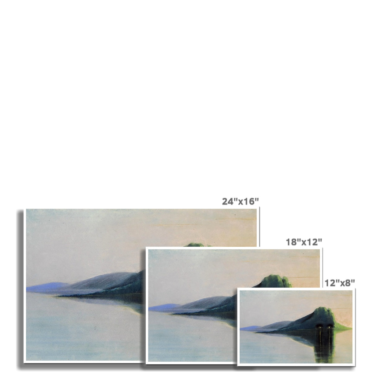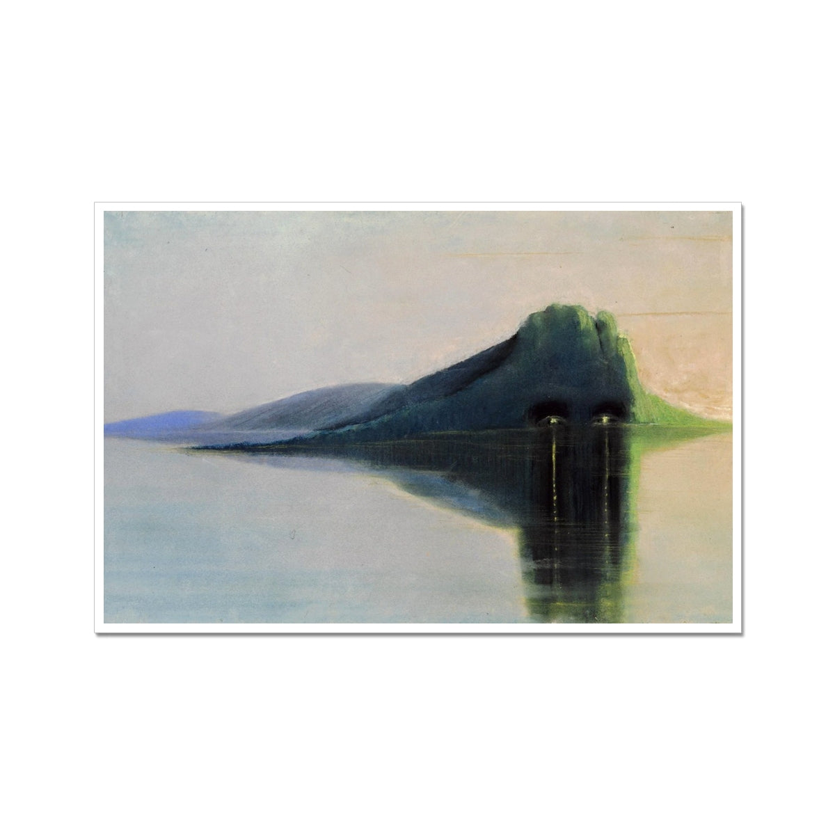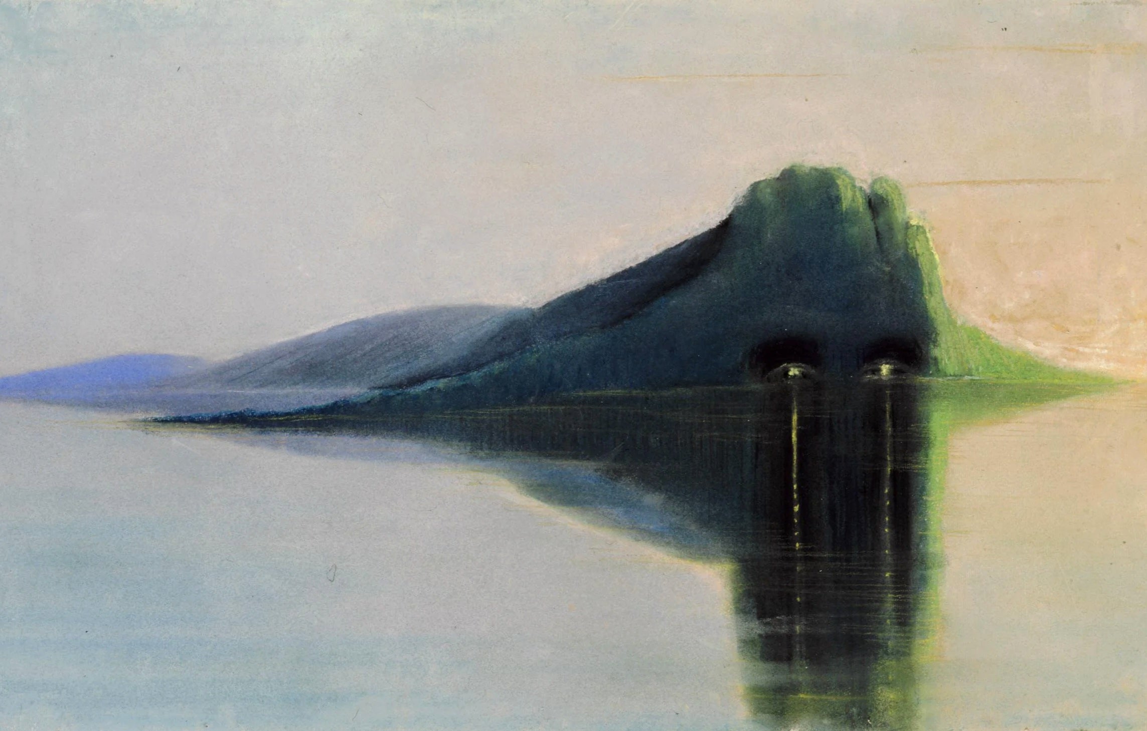 Serenity (1904) by Mikalojus Konstantinas Čiurlionis presents a dreamlike landscape where a solitary green-blue hill rises from tranquil waters, its mirrored reflection forming a mysterious face with glowing eyes. The soft gradients of sky and water evoke stillness and eternity, while the surreal vision blends natural calm with symbolic depth, characteristic of Čiurlionis’ fusion of landscape, mysticism, and imagination.