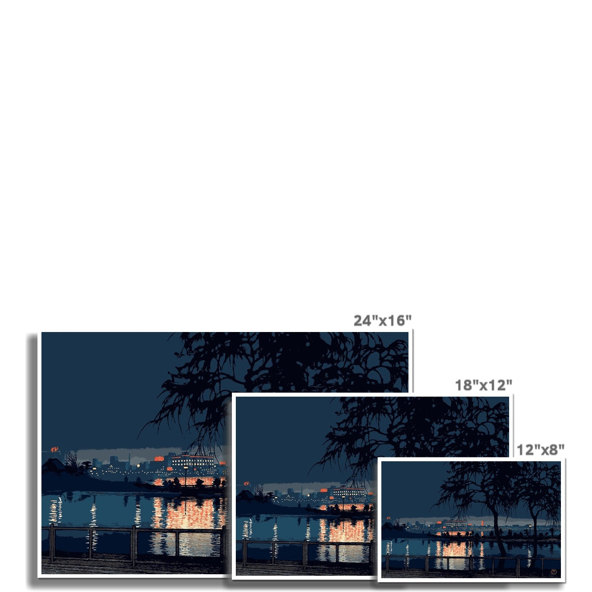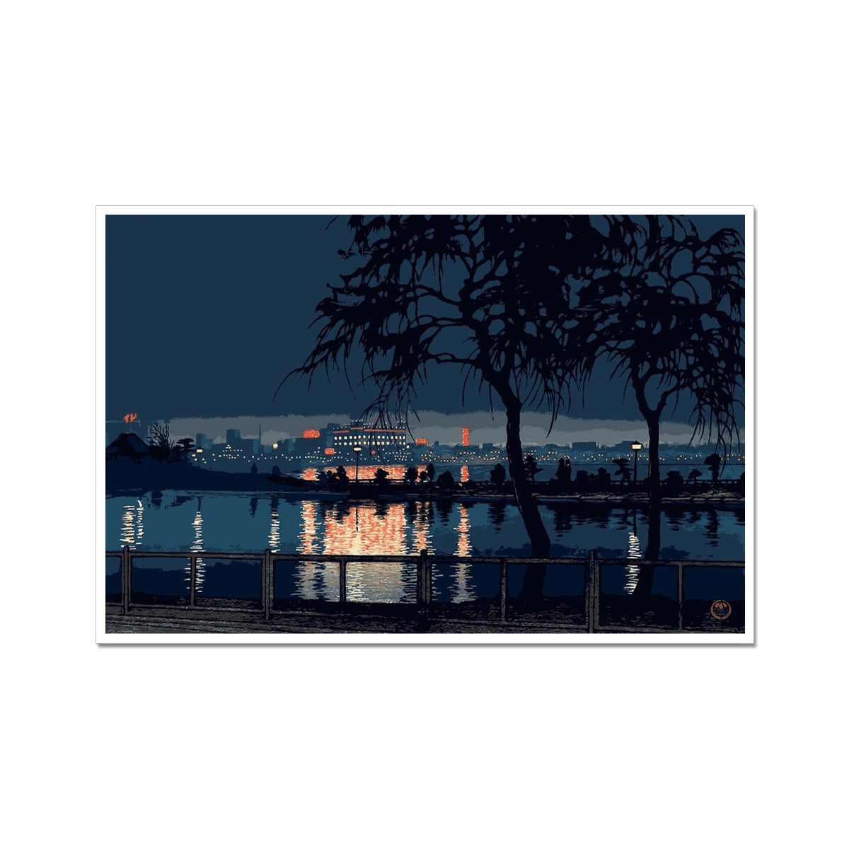 "Shinobazu Pond at Night" by Kawase Hasui, created around 1932, is a vivid depiction of a tranquil evening scene. The artwork features Shinobazu Pond, a body of water in Ueno, Tokyo, known for its beauty and serenity. The composition is dominated by dark silhouettes of trees in the foreground, framing the view of the pond and the illuminated cityscape in the background. The reflections of lights on the water create a shimmering effect, enhancing the sense of calmness. Silhouetted figures can be seen enjoying the nocturnal ambiance. The contrast between the natural elements in the foreground and the urban skyline suggests a harmony between nature and the encroaching city life. Hasui's work is often celebrated for its atmospheric quality and the use of color and light to convey mood, which is exemplified in this piece.