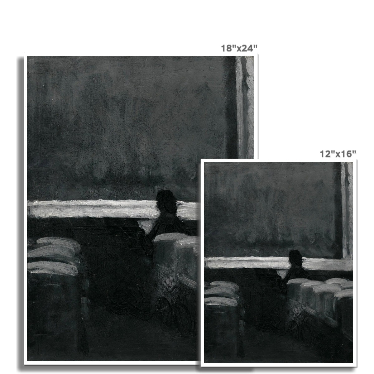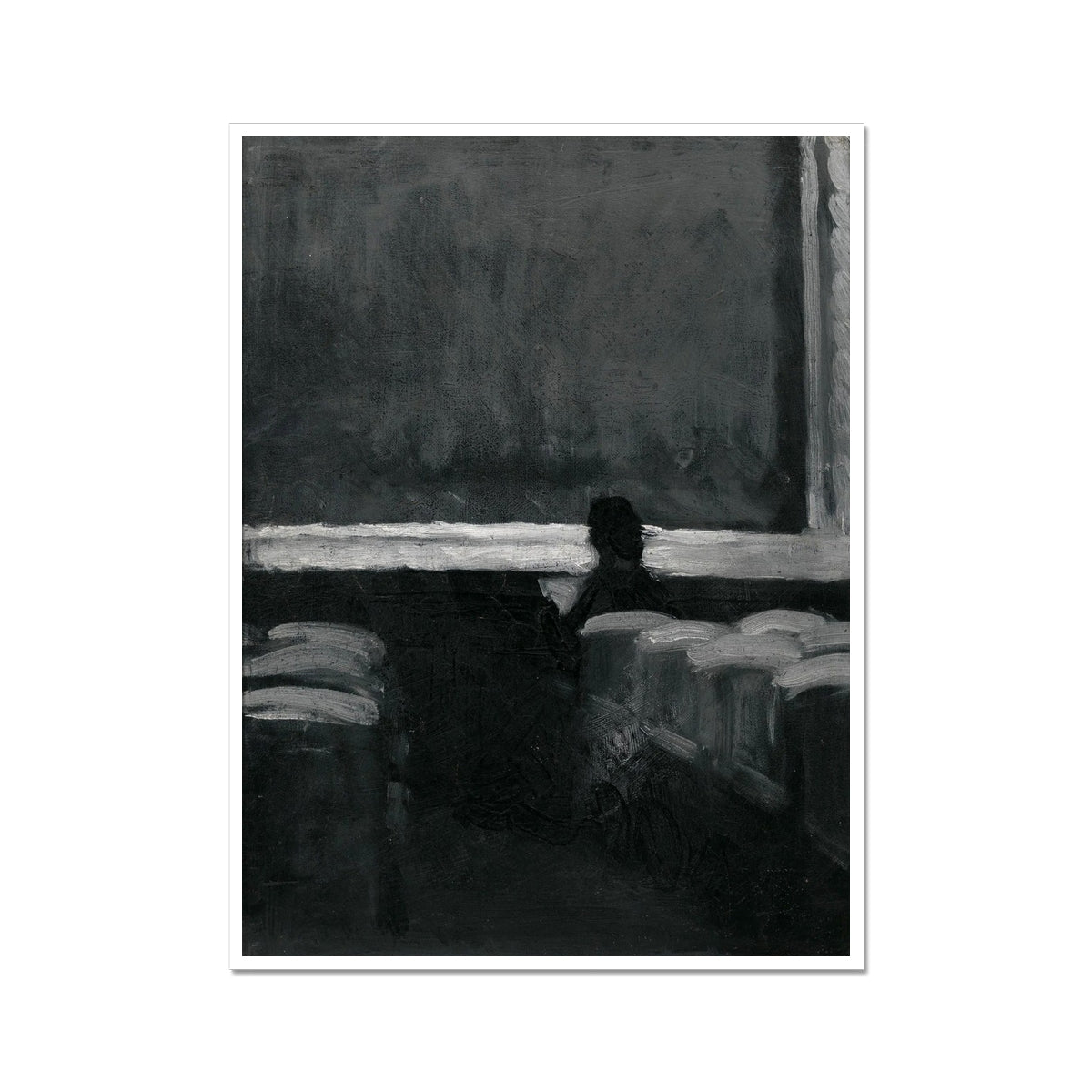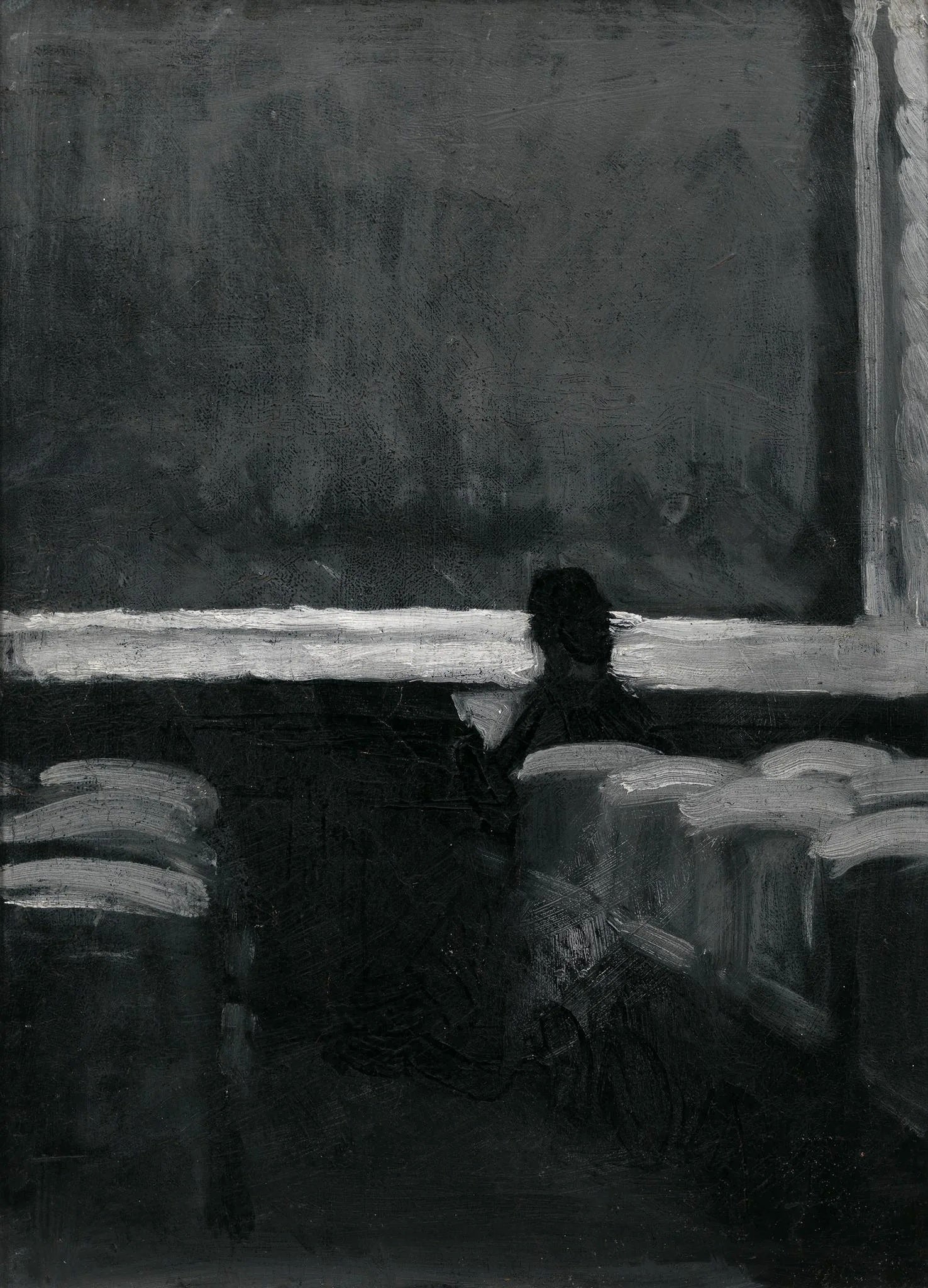 In this early work, Edward Hopper captures a moment of quiet isolation within a dimly lit theater. A lone figure, barely distinguishable against the darkness, sits among empty seats, their presence dwarfed by the vast, shadowy expanse of the screen or stage. The stark contrast between deep blacks and bright whites heightens the mood of solitude, foreshadowing the artist’s later exploration of urban loneliness. Even in its simplicity, the painting evokes a profound sense of introspection, as if the viewer has stumbled upon a fleeting, deeply personal moment of contemplation.