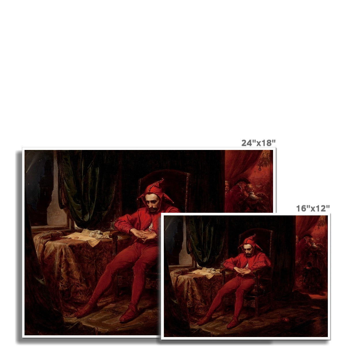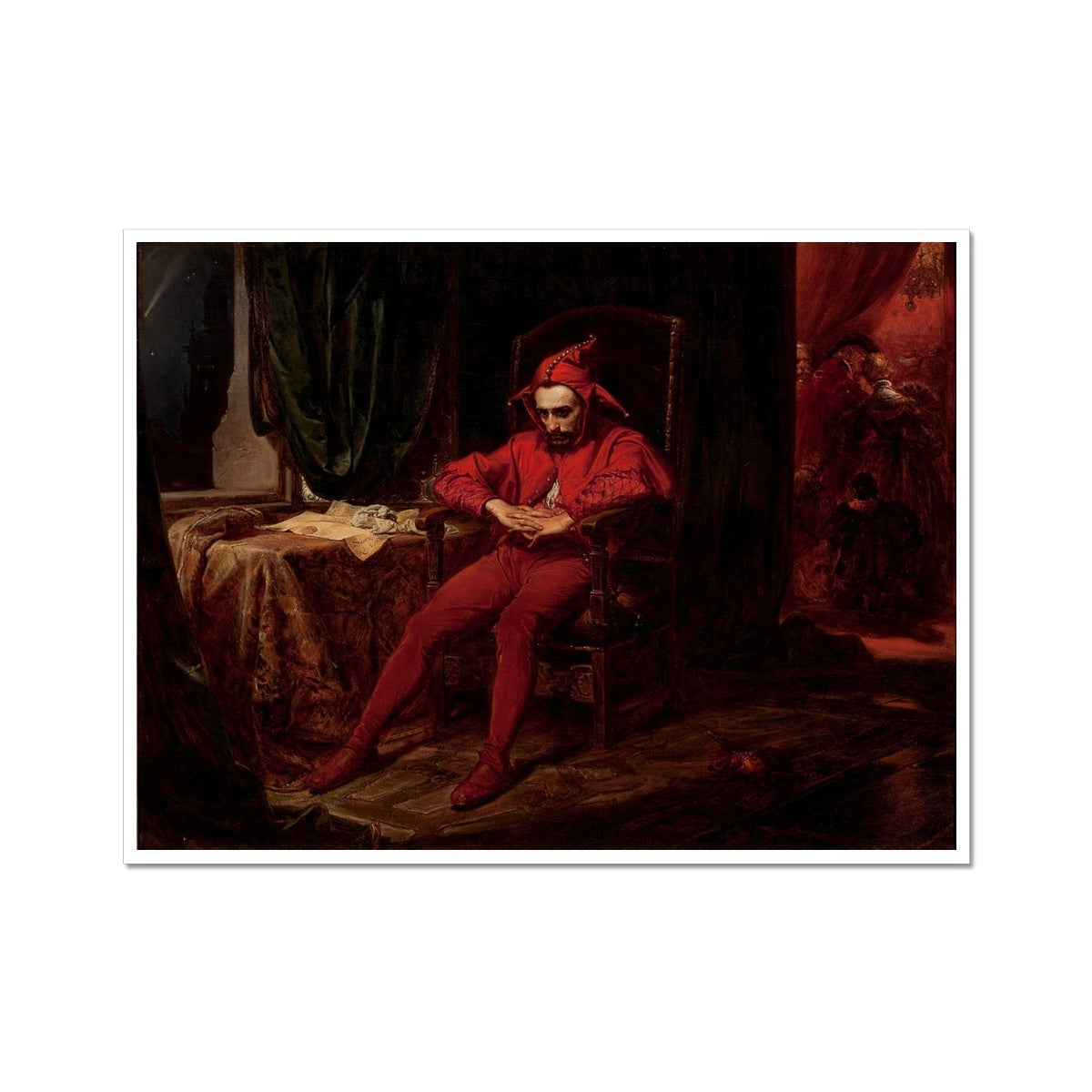 The primary composition of the painting is in the contrast between the solemn jester (Stańczyk) – the focus of the painting – and the lively ball going on in the background. Stańczyk is shown sitting alone in a dark room, while a ball, hosted by the royal family, is in full swing in the neighbouring hall. His appearance is unlike that one would expect in a jester – gloomy, deep in thought. His seriousness is reinforced by his accessories: his marotte lies discarded on the floor, whereas a holy medallion of the Black Madonna of Częstochowa can be seen on his torso. The wrinkled carpet at Stańczyk's feet could have been formed by his collapsing heavily into the chair upon reading the letter, or through a nervous shifting of the feet thereafter. On the table lies a letter likely announcing that the Grand Duchy of Lithuania has lost Smolensk (now in Russia) to the Grand Duchy of Moscow, causing Stańczyk's sorrow and reflection on his fatherland's fate.