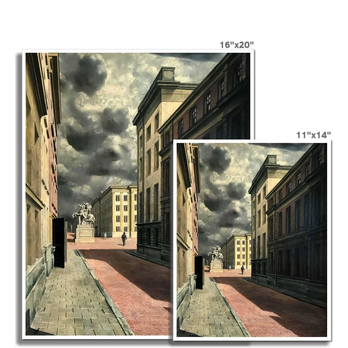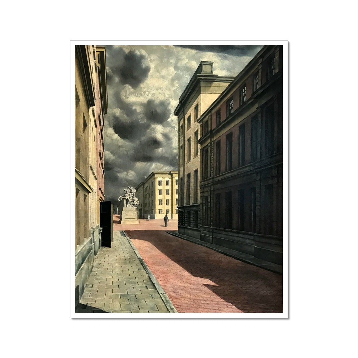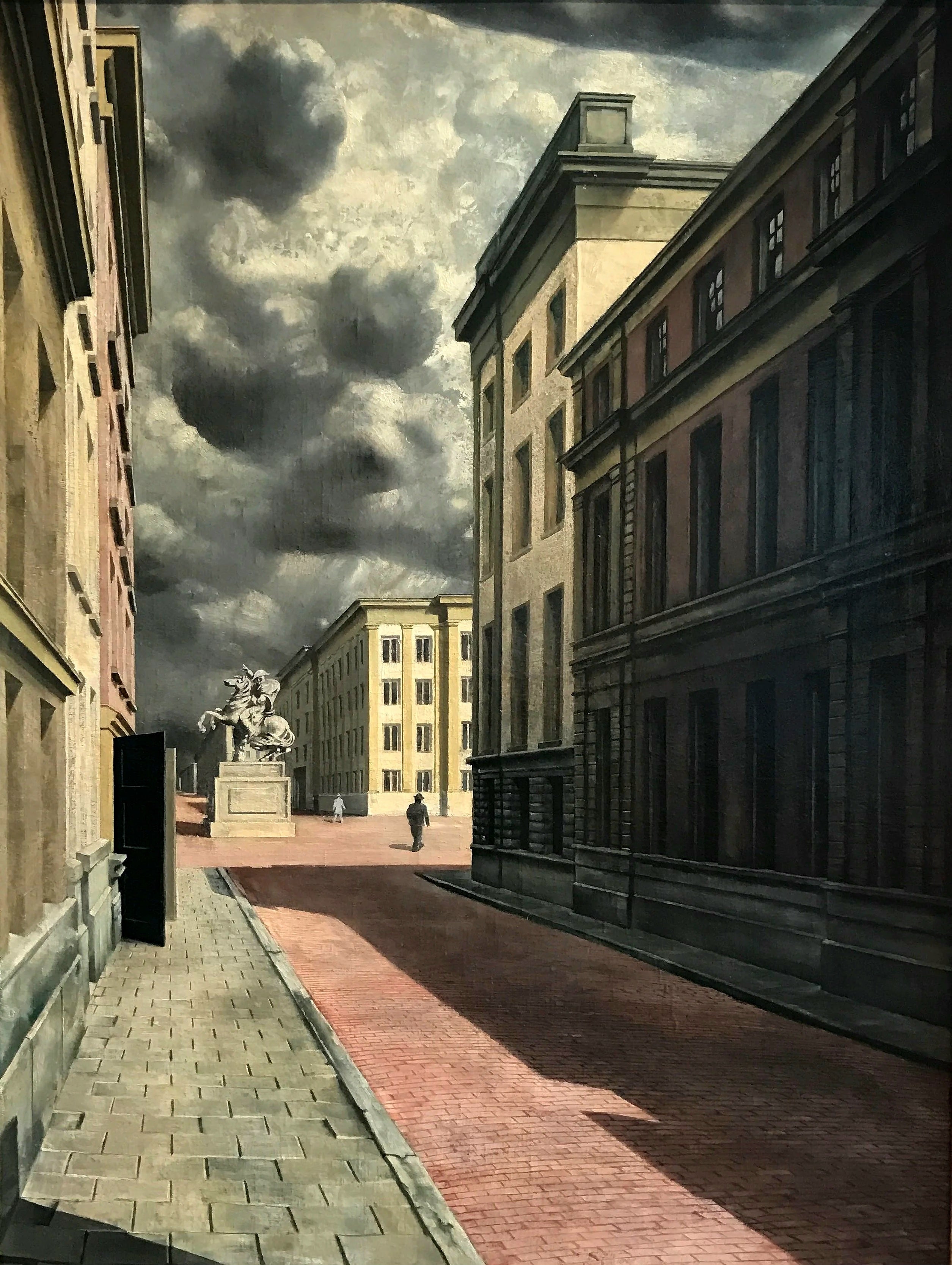 Carel Willink’s "Street with a Statue" (1934) presents a stark, deserted urban scene under a looming sky of heavy, turbulent clouds. The rigid geometry of the empty buildings and long shadows cast across the red-brick street create an atmosphere of foreboding stillness. At the center stands an equestrian statue, monumental yet isolated, its presence heightening the sense of unease in this eerily silent cityscape.