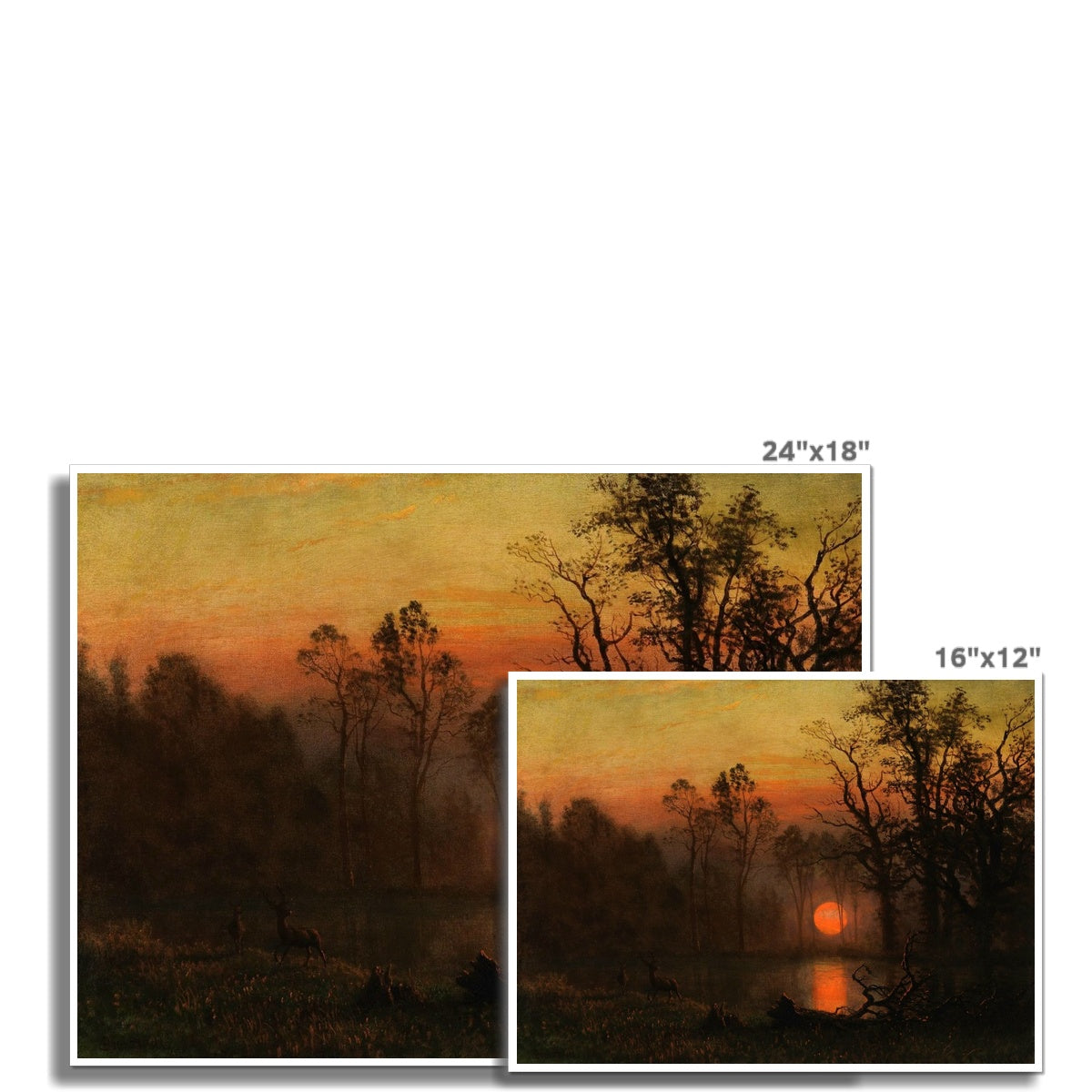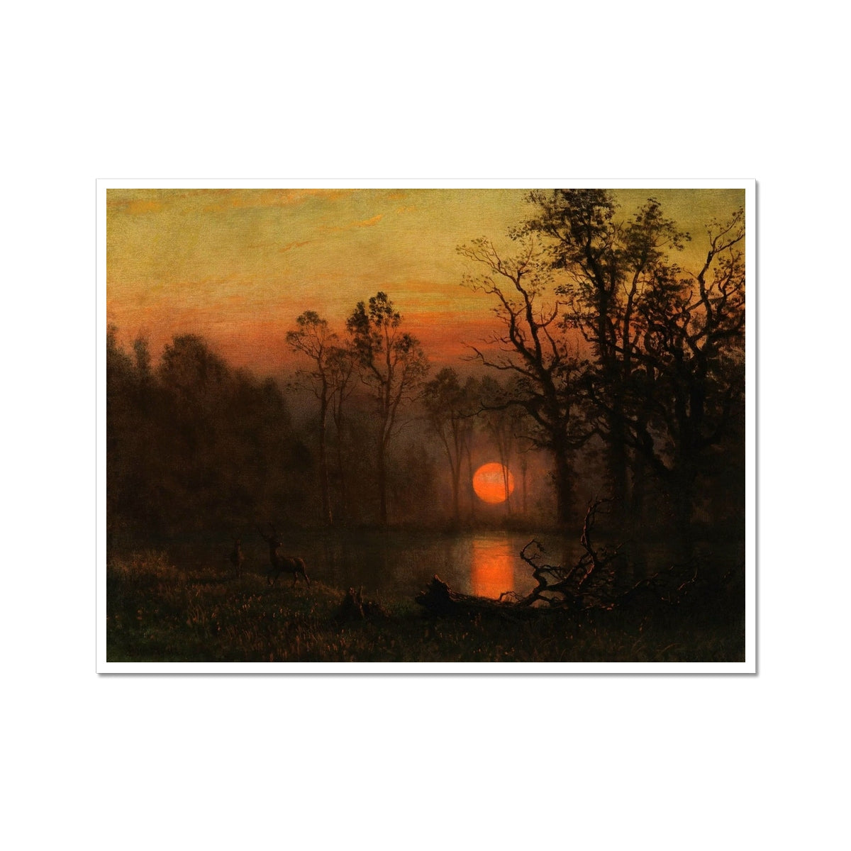 Sunset Over the Plains (also known as Deer in a Sunset Landscape, c. 1887) by Albert Bierstadt is a luminous, atmospheric painting that captures the tranquil beauty of nature at dusk. The scene depicts a pair of deer standing by a quiet water’s edge, silhouetted against a glowing red-orange sun sinking behind a dense forest. The tall, dark trees and rich shadows contrast vividly with the radiant sky, enhancing the drama of the setting sun. Bierstadt’s romantic treatment of light and landscape evokes a deep sense of serenity and reverence for the wilderness.