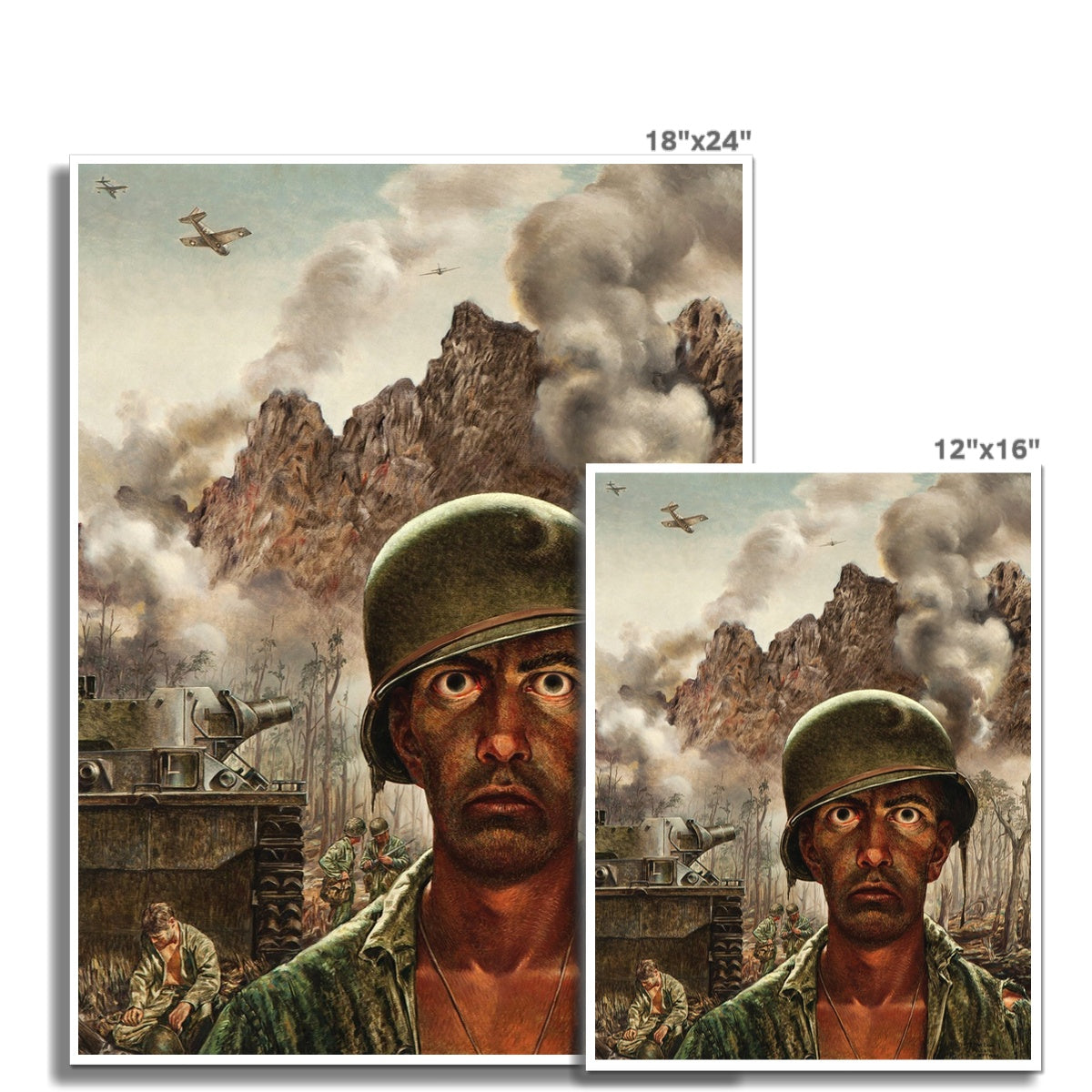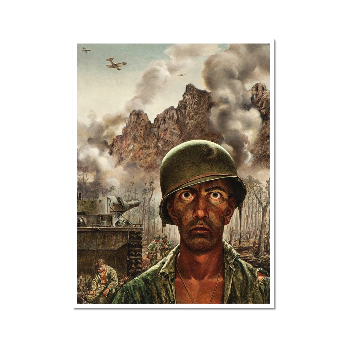 "That Two Thousand Yard Stare" by Thomas Lea (1944) is a powerful wartime painting depicting the haunting psychological toll of war. The central figure is a battle-worn soldier with wide, hollow eyes that seem to look beyond the viewer, symbolizing trauma and detachment. Set amidst a chaotic battlefield with smoldering mountains, tanks, and planes overhead, the scene conveys the devastating reality of combat. Surrounding him, other soldiers and equipment emphasize the collective strain of war, while his expression captures the individual experience of profound exhaustion and emotional numbness. The piece is a poignant representation of the cost of war on the human spirit.