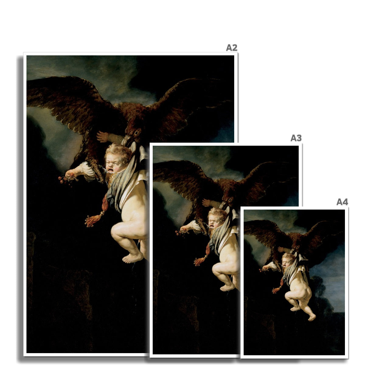 "The Abduction of Ganymede" is a painting by Rembrandt, created in the 1630s. The painting depicts the mythological scene of Zeus, disguised as an eagle, abducting the handsome young Ganymede to be his cup-bearer and lover on Mount Olympus. In the painting, Ganymede is shown being lifted into the air by the eagle, his arms outstretched in surprise and alarm, while other figures look on in horror.