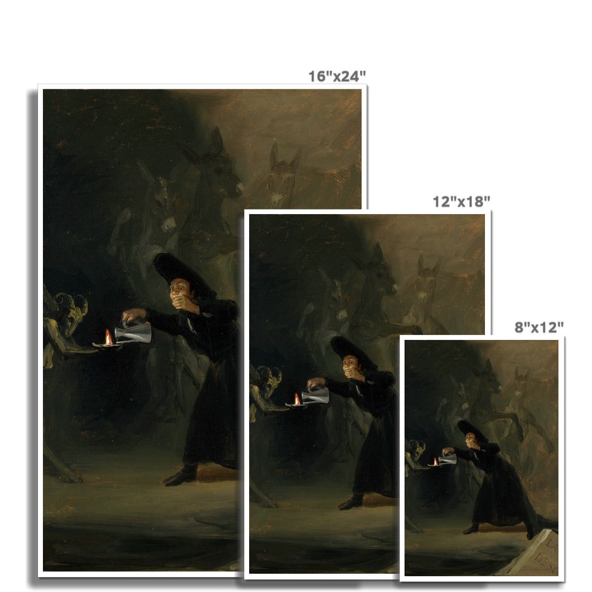 This is a dark, theatrical painting depicting a terrified man recoiling from a ghostly vision. Dressed in black, he clutches his chest while pouring liquid onto a candle held by a demonic goat like figure. Behind him looms shadowy donkey like figures. The work reflects Goya’s fascination with the irrational and the supernatural, part of his broader critique of 18th-century Spanish society.