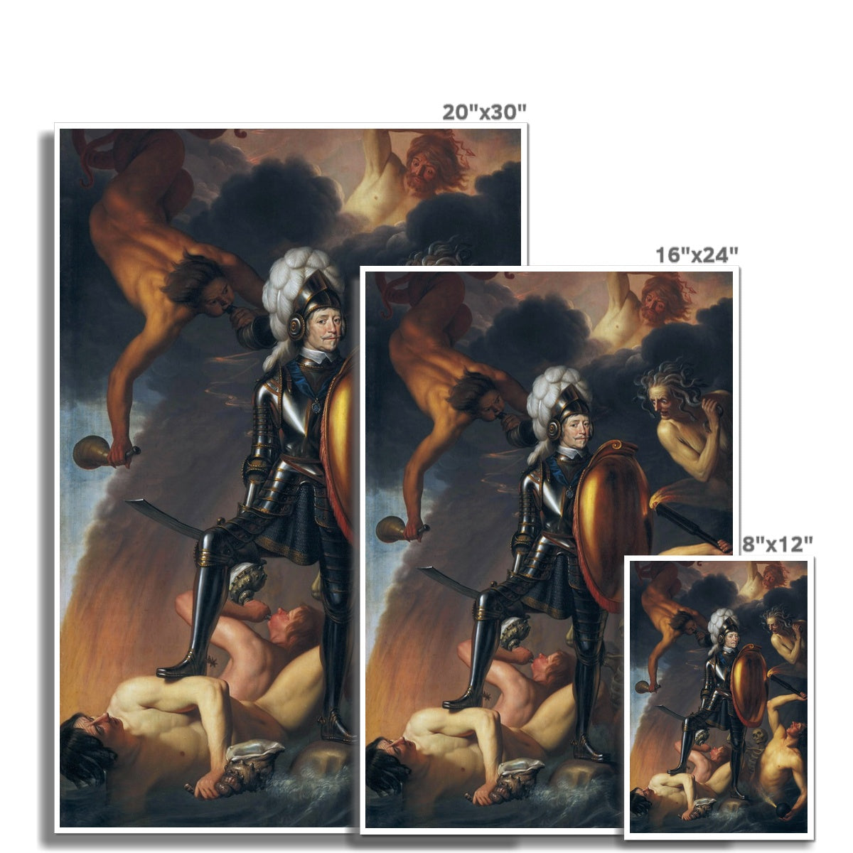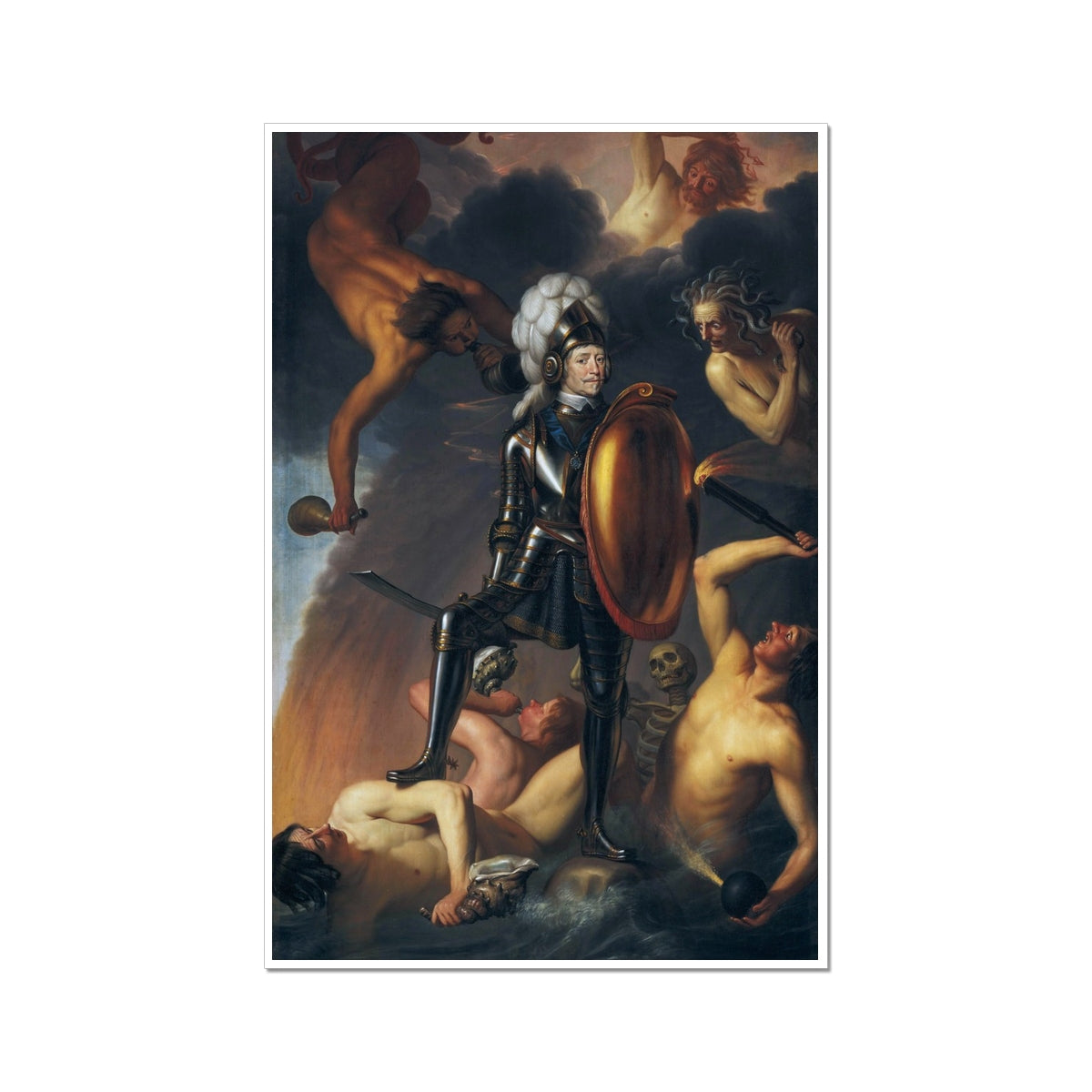Around him, various allegorical figures and elements are present. To the left and right, mythological and symbolic characters, such as Titans or personifications of vice and virtue, are shown in dynamic poses, highlighting the turmoil and challenges he faced. The presence of a skeletal figure in the background may symbolize death or the omnipresence of mortal danger. The use of light and shadow, as well as the detailed rendering of the armour and the figures, showcases van Honthorst's skill in creating dramatic and heroic imagery. The overall composition emphasizes the strength and constancy of Frederik Hendrik amid chaos and adversity.