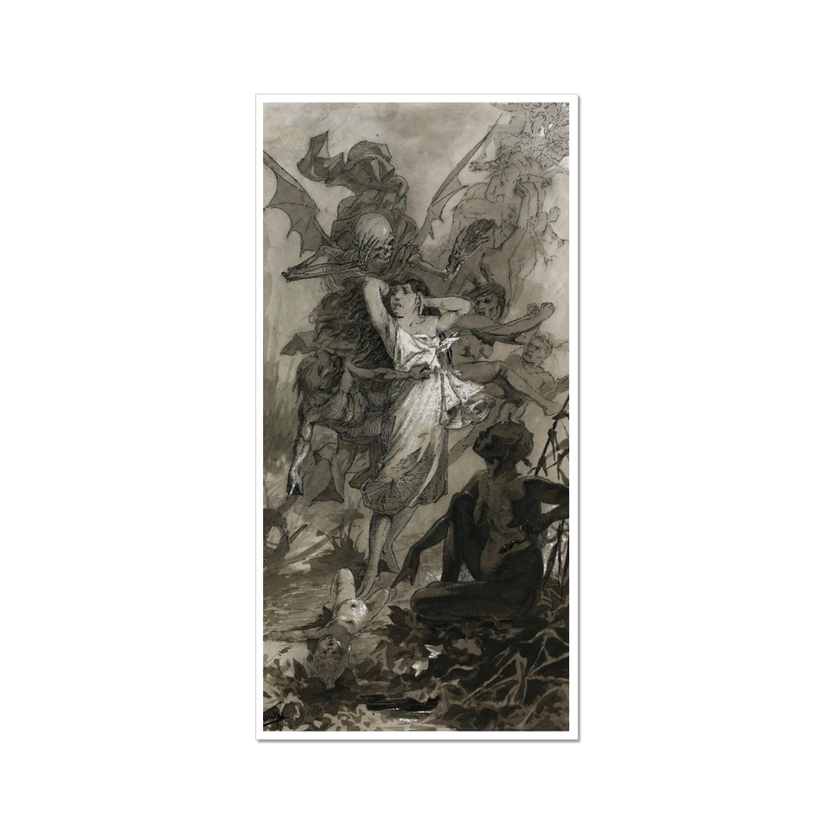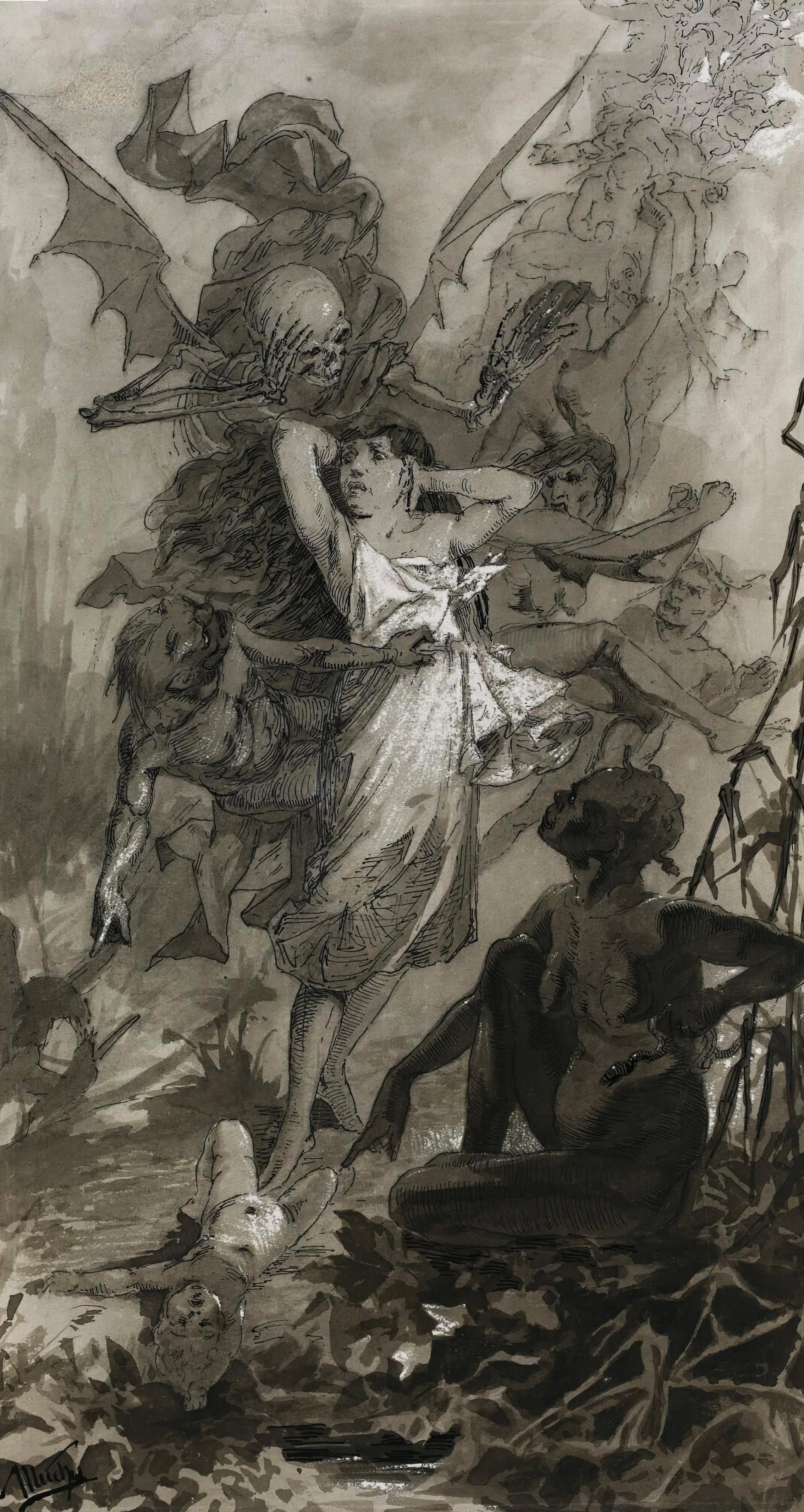"The Dance of Death" by Alphonse Mucha, created in the 19th century, is a striking and evocative illustration. This artwork features a skeletal figure with bat-like wings representing Death, who is seen grasping a woman, pulling her into a macabre dance. The woman's expression is one of horror and helplessness, contrasting sharply with the dark, almost demonic figures surrounding her. The scene is set in a surreal, nightmarish landscape with twisted forms and chaotic movement, capturing a sense of impending doom and the inevitability of death. Mucha's intricate line work and use of shading enhance the eerie and haunting atmosphere of the illustration.