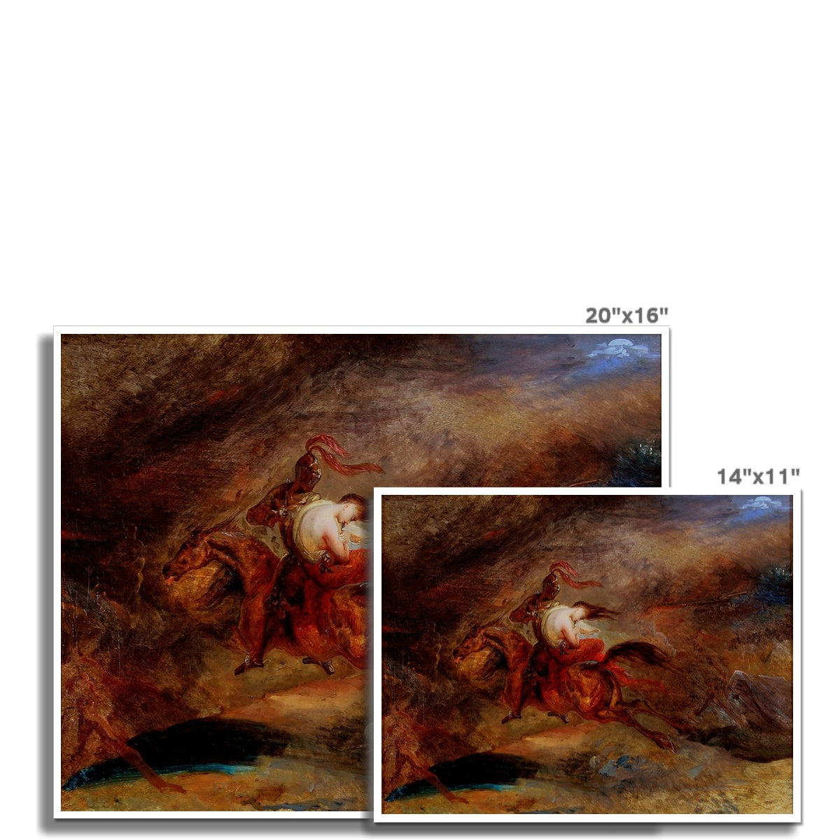 The Dead Ride Fast by Ary Scheffer (1795–1858) is a dramatic Romantic vision of a terrified woman swept through a storm-dark landscape by a ghostly horseman. Rendered in turbulent, swirling brushstrokes and fiery, nocturnal tones, the scene captures a moment of supernatural flight, where fear, speed, and fate seem to merge into one. Inspired by Gothic poetry and legend, the painting embodies the Romantic fascination with death, terror, and the sublime power of the unknown.