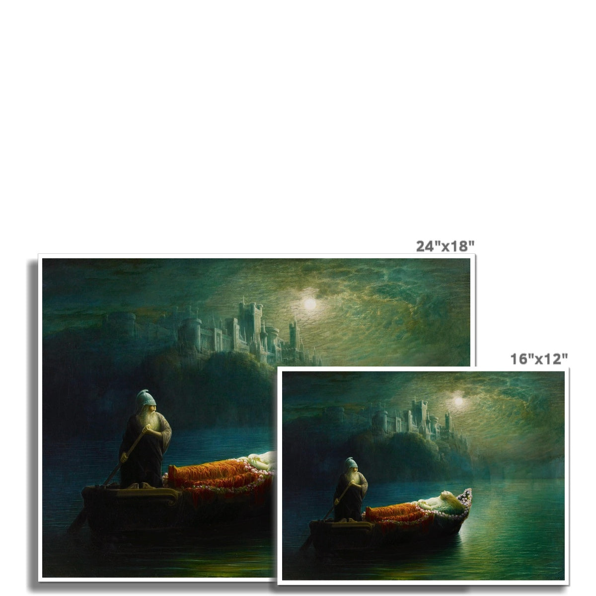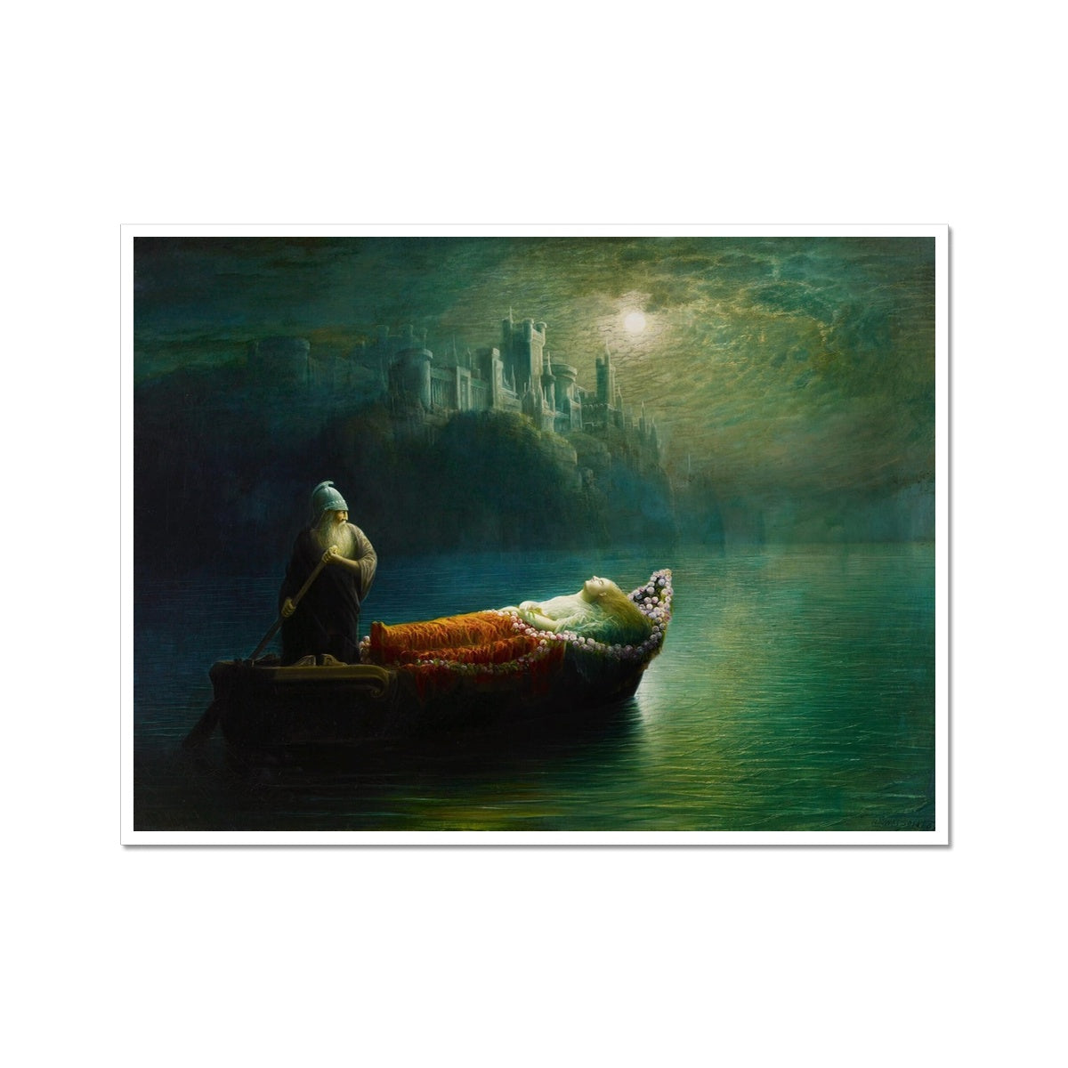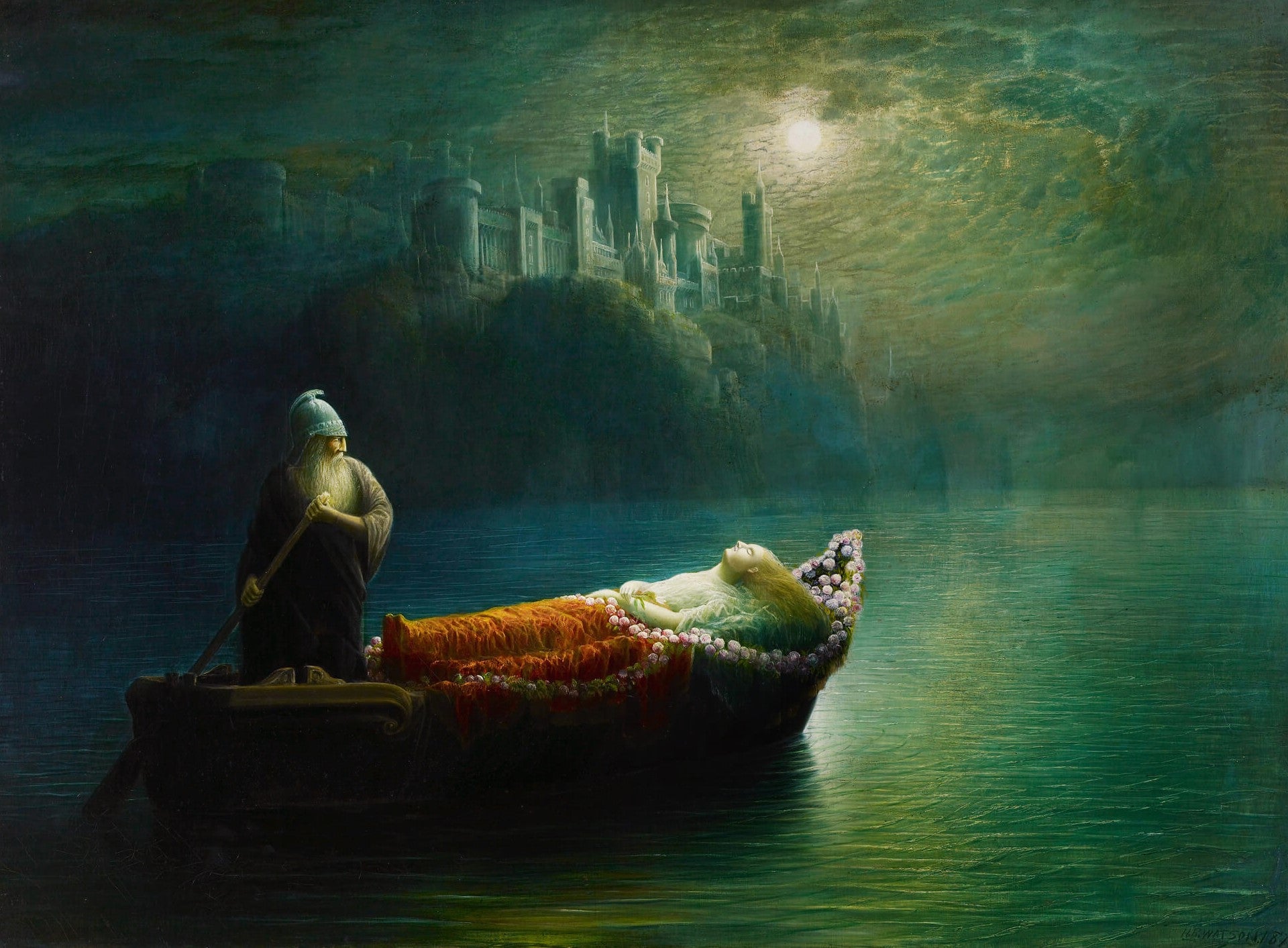Homer Watson's "The Death of Elaine" (circa 1877) is a moving piece that captures the poignant end of Elaine of Astolat, a tragic figure from Arthurian legend. Under the glow of a pale moon, her figure lies serenely on a boat adorned with a bounty of flowers, signifying her young and pure life cut short by unrequited love. A solemn boatman in armor silently ferries her towards the ethereal city of Camelot in the distance, its spires and towers barely visible through the mist. The water's calm, the play of moonlight, and the tranquil expression on Elaine's face lend a somber yet peaceful atmosphere to this narrative painting. Watson's use of light, shadow, and texture gives a mystical quality to the scene, beautifully conveying the legend's melding of romance and tragedy.