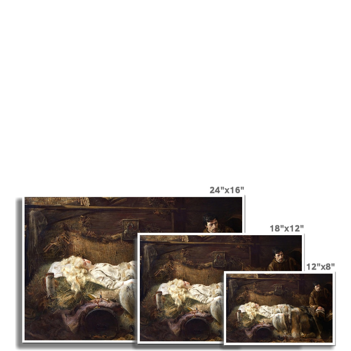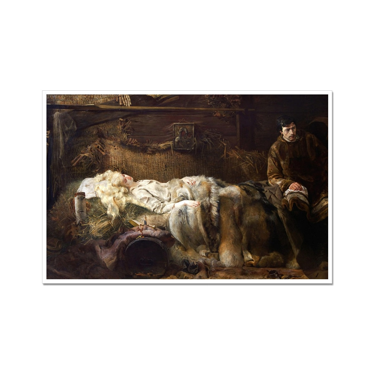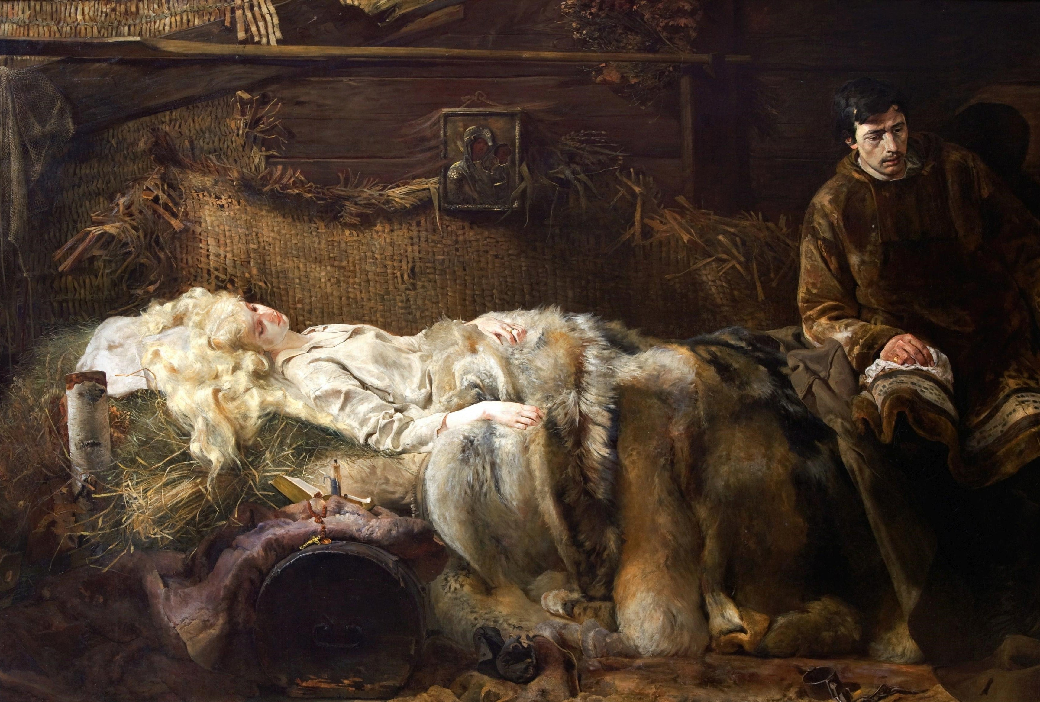 "The Death of Ellenai" by Jacek Malczewski, painted around 1883, is a piece of Polish symbolism that depicts a tragic scene filled with emotional depth and narrative complexity. In the painting, we see Ellenai, a character inspired by the Polish poem "Anhelli" by Juliusz Słowacki, lying lifeless, her pallor contrasting with her flowing, golden hair. She is draped in a simple, ethereal white gown and rests on a bed of straw. Beside her, a grief-stricken man sits in solemn vigil, his expression one of deep sorrow and contemplation, dressed in period attire that suggests a 19th-century setting.