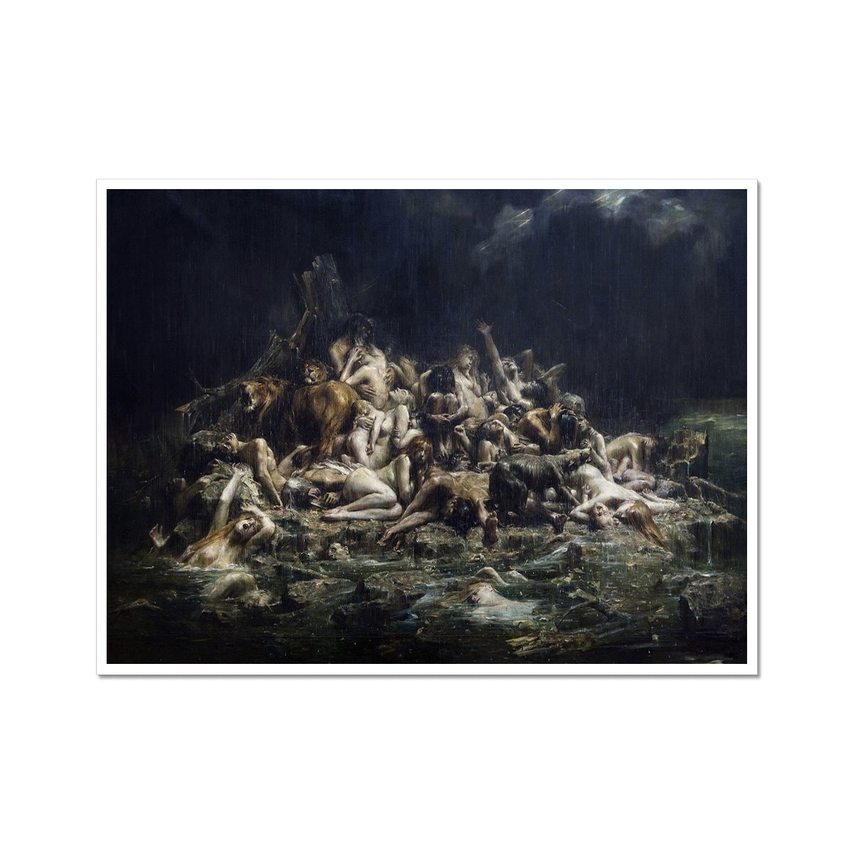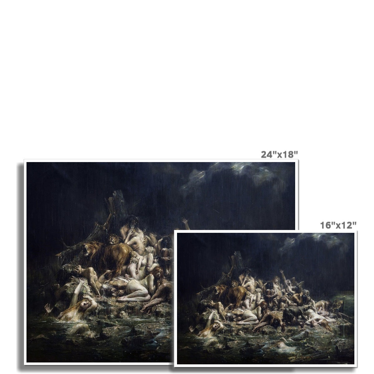"The Deluge" is a painting by Léon Comerre, created in 1911. This dramatic work of art depicts the chaos and desperation of humans and animals clinging to a small patch of land amid a violent storm. The scene is dark and tumultuous, emphasizing the power and fury of nature as it unleashes its destructive force. The composition is crowded with figures, highlighting their struggle for survival against overwhelming odds. The use of light and shadow adds to the intense, somber atmosphere of the painting, drawing the viewer into the plight of the subjects caught in the midst of this catastrophic flood.