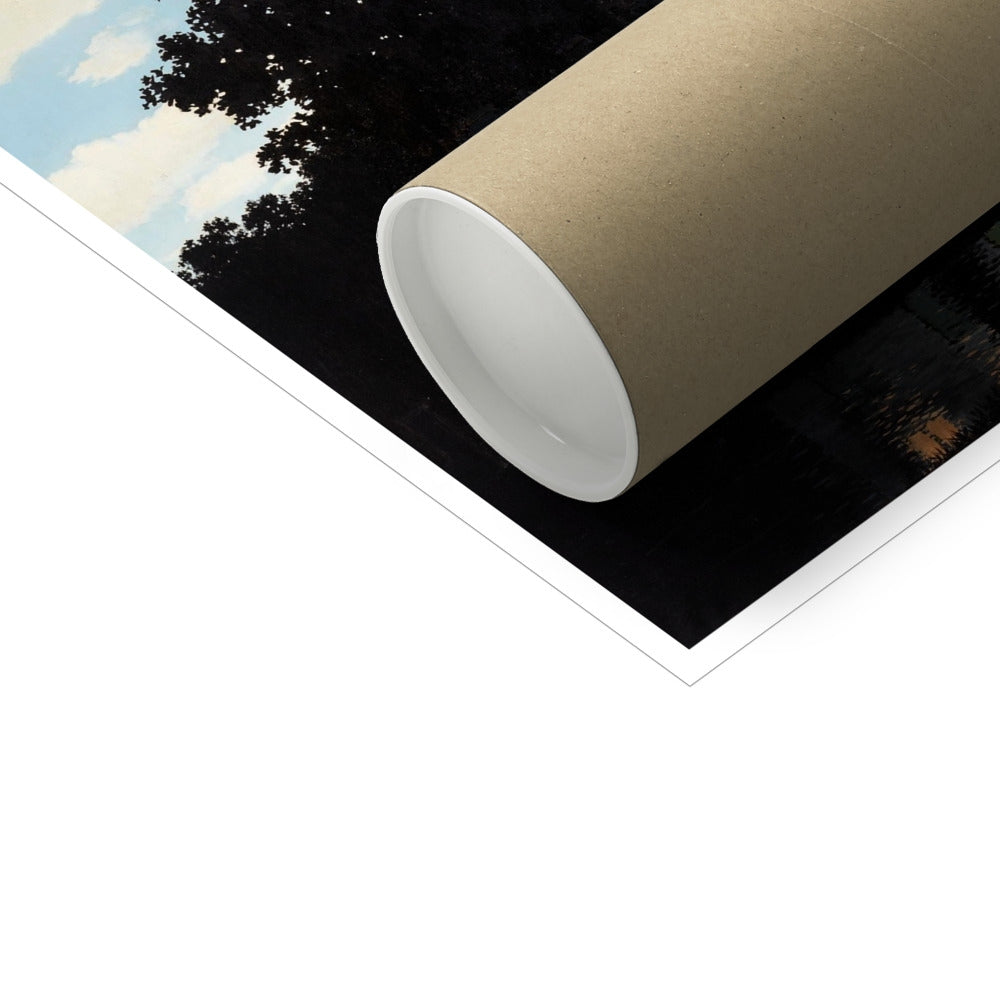 René Magritte's painting L'Empire des lumières (circa 1954) is a surrealist work that juxtaposes night and day within a single scene. The lower part of the painting depicts a darkened street, with a lamppost casting a gentle glow near a house with illuminated windows. In contrast, the sky above is bright, filled with soft, fluffy clouds typical of daylight. This interplay between light and dark creates a dreamlike, almost unsettling atmosphere, challenging the viewer’s perception of reality and time. The reflection of the lamplight on the water in the foreground further enhances the surreal quality of this iconic piece.