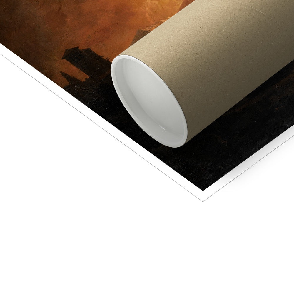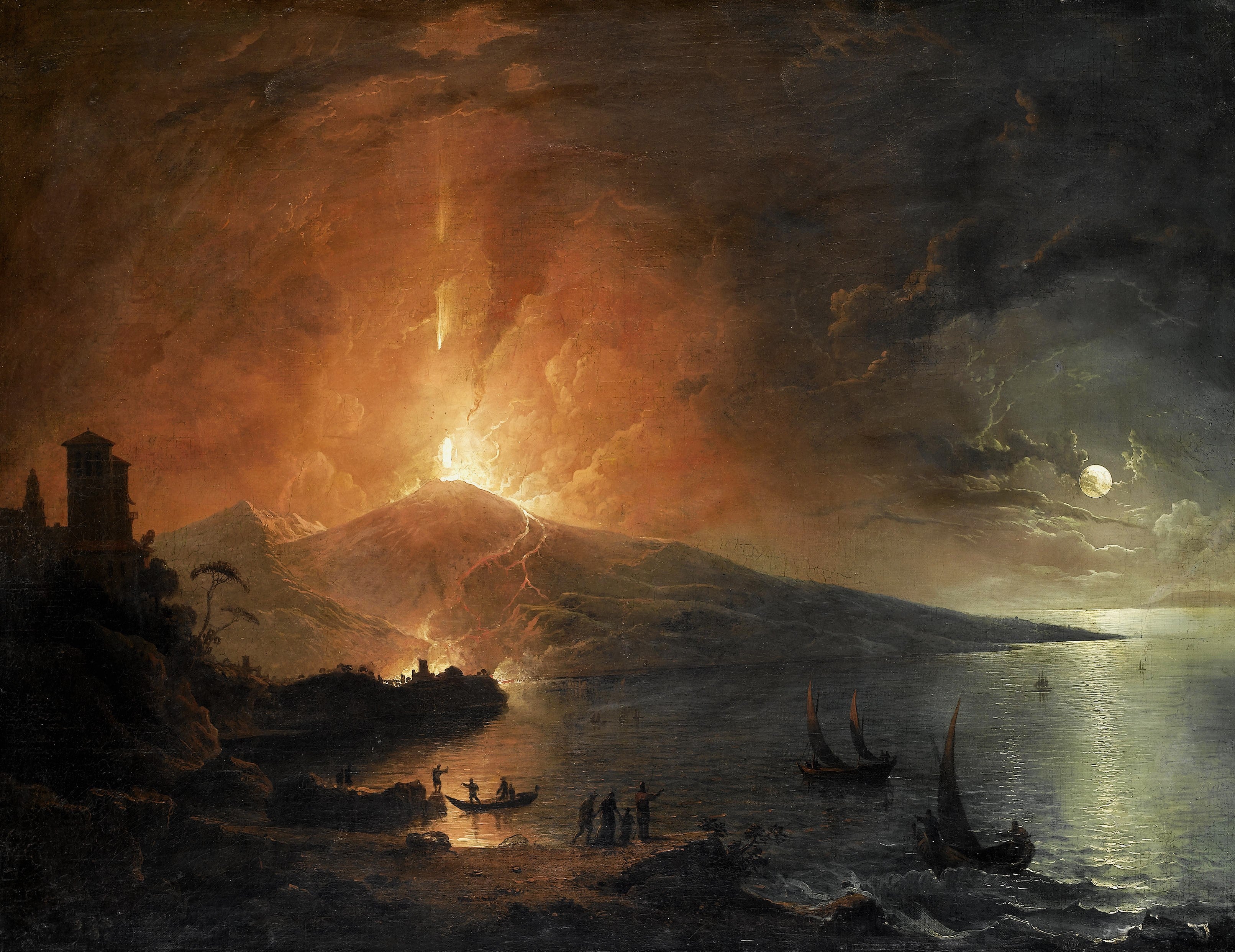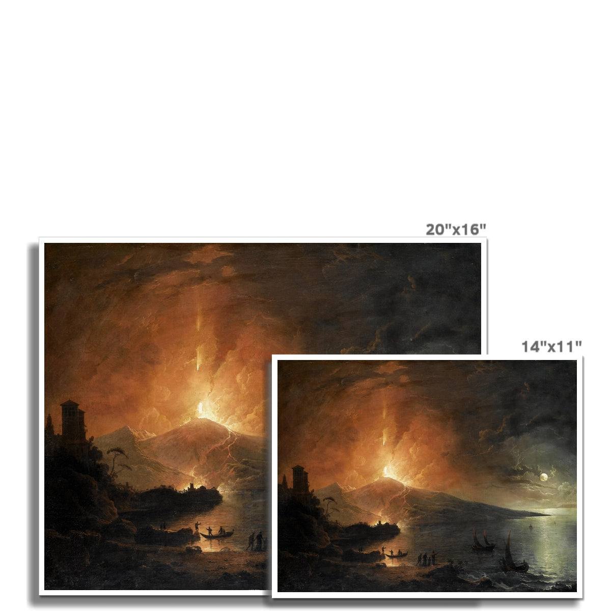 The painting "The Eruption of Vesuvius by Night" by Henry Pether, created in the 19th century, captures the dramatic and tumultuous event of a volcanic eruption at night. The central focus is Mount Vesuvius, depicted in the throes of an explosive eruption, with bright lava flows and a plume of glowing ash and smoke ascending into the night sky. The sky is a canvas of dark, brooding colors, lit by the fiery eruption, contrasting with the calm and reflective sea in the foreground, where the moon casts a serene light. Small boats and figures are visible near the shore, possibly evacuating or observing the event. The painting juxtaposes the destructive power of nature with the tranquility of the surrounding environment and the resilience of human life in the face of natural disasters. Pether is known for his nocturnal scenes, and this work exemplifies his skill in depicting light and atmosphere to convey the mood of the scene.