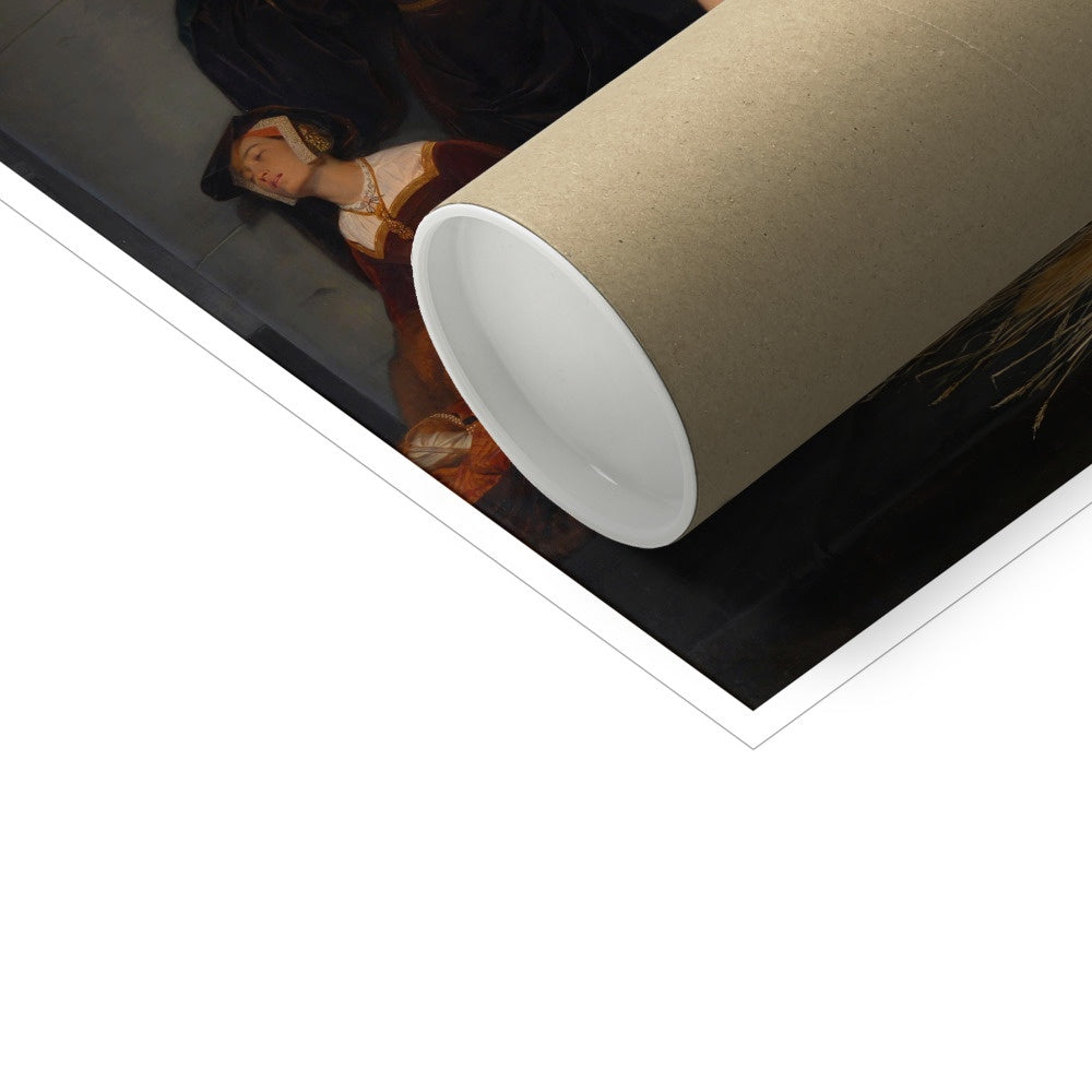 Paul Delaroche’s The Execution of Lady Jane Grey (1833) is a poignant historical painting that captures the final moments of the young Lady Jane Grey, who was executed at the age of sixteen after being deposed as Queen of England. Set in a somber, dimly lit space, the work highlights Jane’s innocence and vulnerability as she, blindfolded and guided by an attendant, reaches for the execution block. With its meticulous realism, emotional intensity, and dramatic use of light and shadow, Delaroche’s masterpiece reflects the tragic downfall of a figure caught in the ruthless politics of Tudor England.