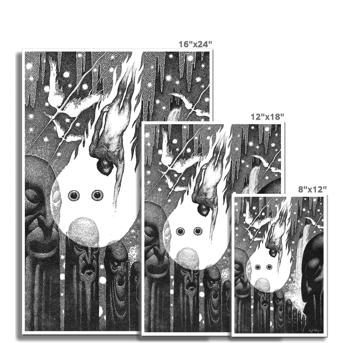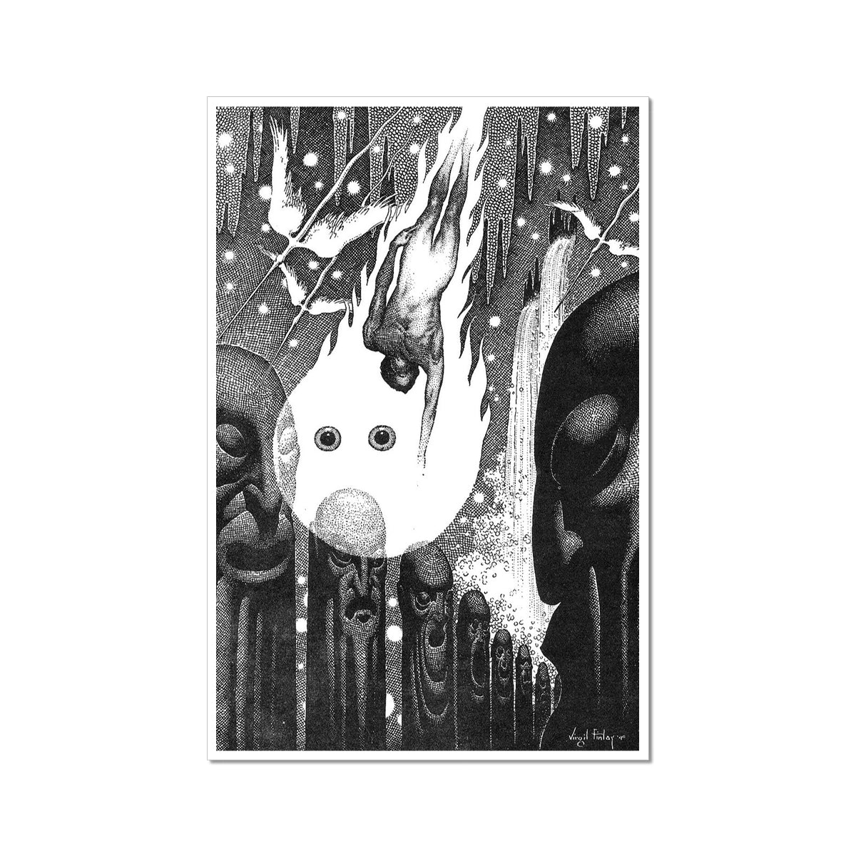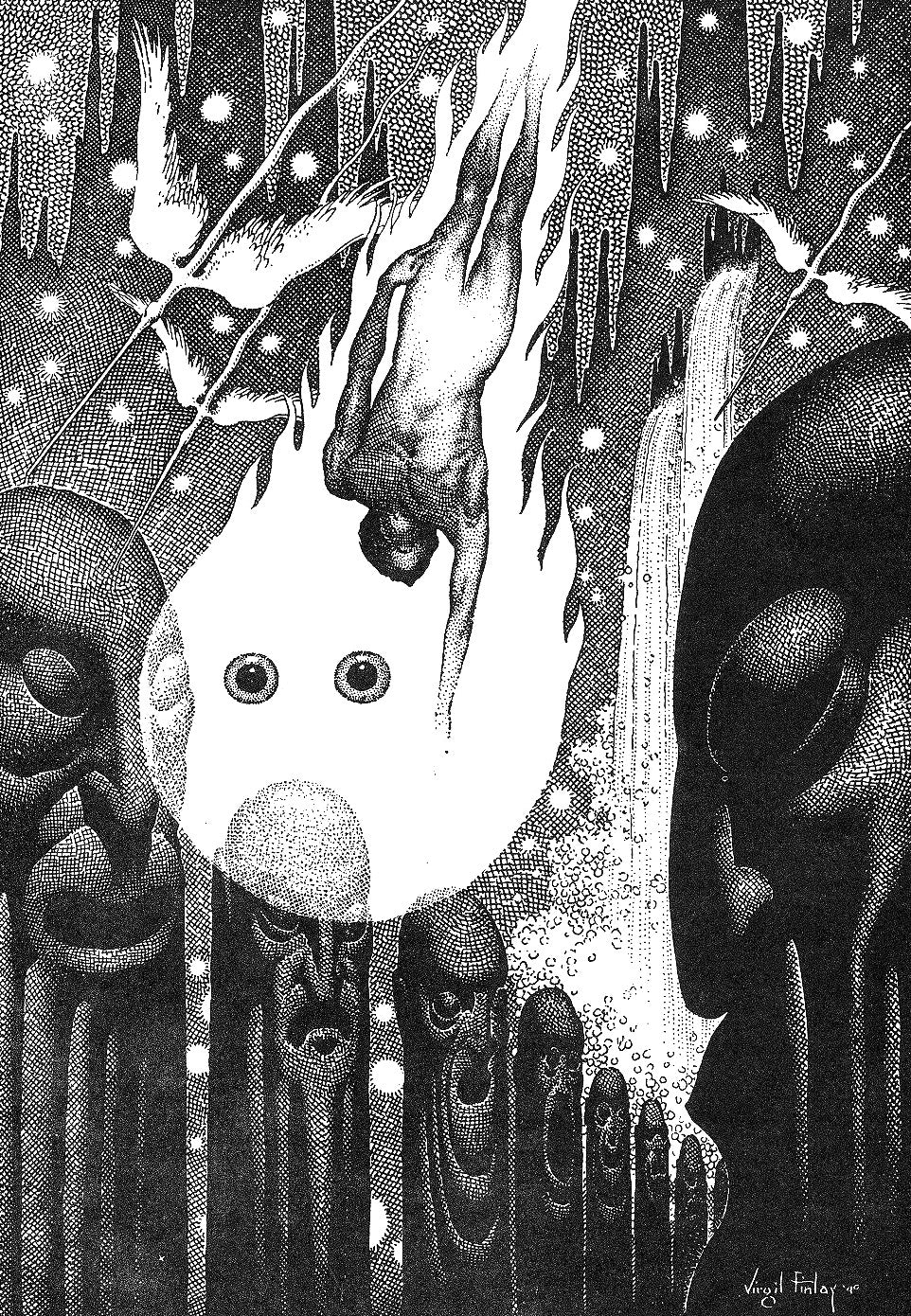 "The Face in the Abyss" by Virgil Finlay (circa 1940) is a surreal and haunting illustration showcasing Finlay's intricate and detailed pen-and-ink style. The composition features a central, enigmatic glowing face with large, eerie eyes surrounded by elongated, totem-like figures with expressive and grotesque visages. A naked figure falls downward into the abyss, enveloped in flames, while ethereal birds and cascading streams of light add to the dreamlike and otherworldly atmosphere. The work evokes a sense of cosmic mystery and existential dread, blending elements of fantasy and horror with striking visual intensity.