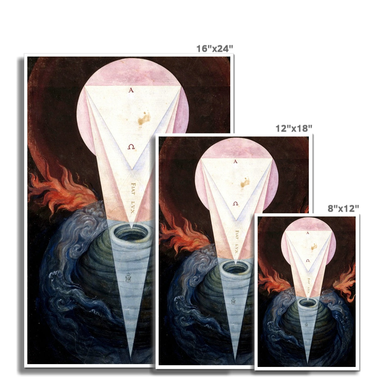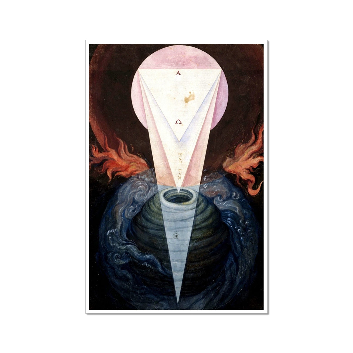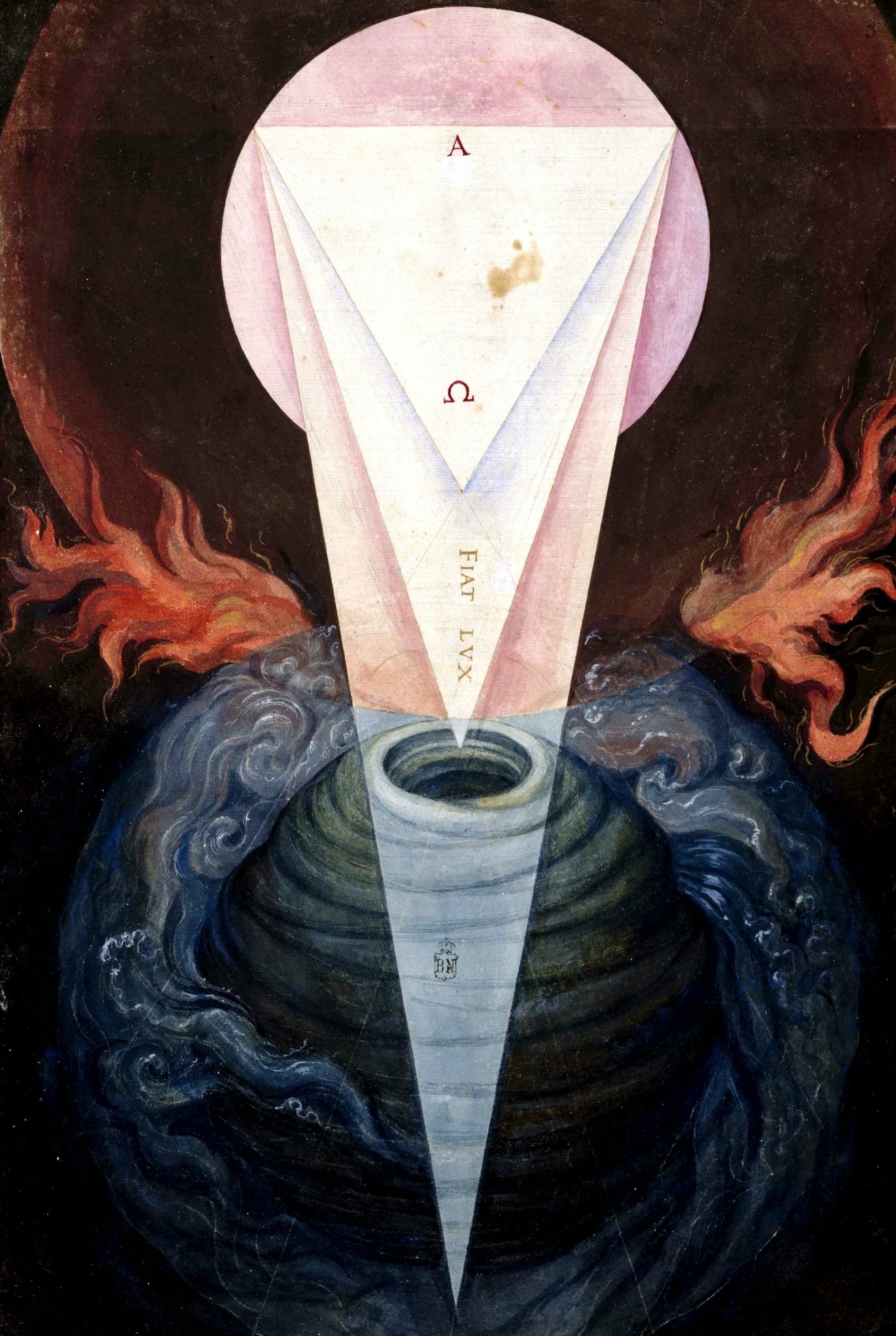 Francisco de Holanda's The First Day of Creation (1545) is a mystical and symbolic representation of divine creation. A luminous triangle, inscribed with the Greek letters Alpha and Omega and the Latin phrase “Fiat Lux” (“Let there be light”), descends from a radiant circle into a swirling, primordial void. Flames and cosmic waters surround the central vortex, suggesting chaos giving way to divine order. The painting blends Renaissance humanism with Christian cosmology and Neoplatonic thought, visualizing the moment light emerged from darkness.