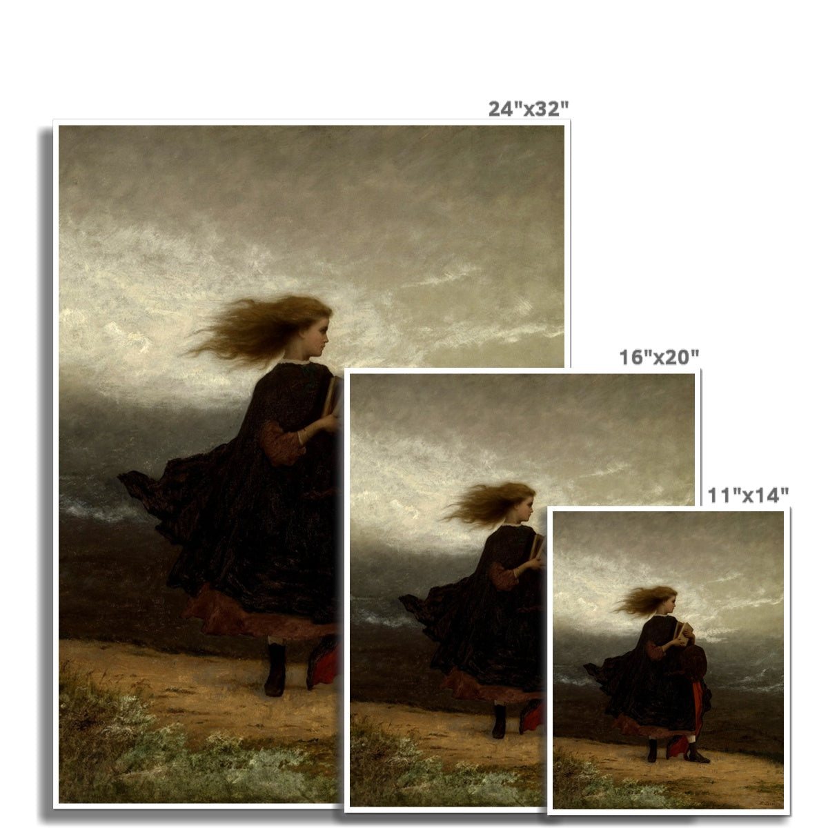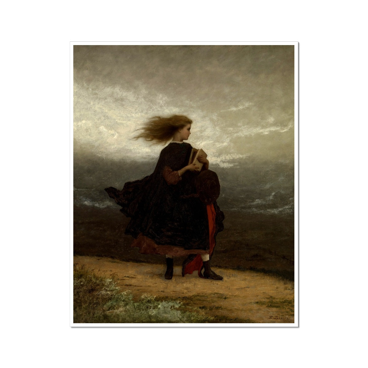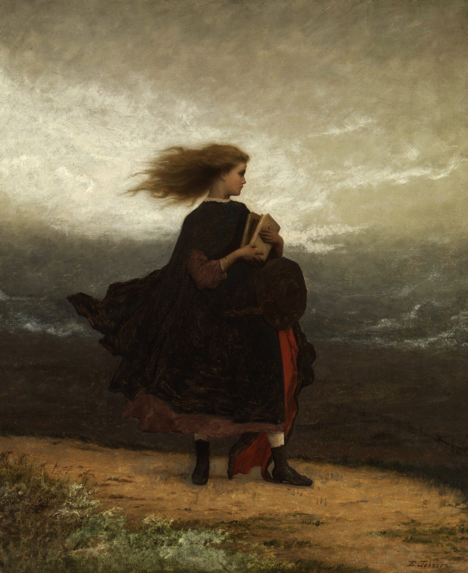 This painting is "The Girl I Left Behind Me" by Eastman Johnson, completed in 1872. It depicts a young woman standing in a windswept landscape, her hair and dress billowing behind her. She holds a book close to her chest, which might suggest the value of education or the comfort of storytelling. The woman's gaze is directed away from the viewer, towards the horizon, which could imply a sense of contemplation or anticipation. The stark, moody sky and the barren landscape contribute to the painting's evocative atmosphere, possibly reflecting on themes of loneliness, resilience, or change. Johnson's work is often noted for its narrative quality and emotional depth, as seen here.