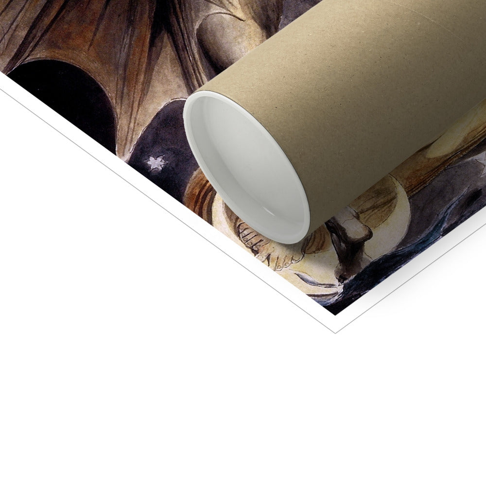 The Great Red Dragon and the Woman Clothed with the Sun by William Blake (c.1805) is a dramatic watercolor illustrating a scene from the Book of Revelation. The monstrous, muscular dragon dominates the composition with outstretched bat-like wings, multiple crowned heads, and a coiled tail. Beneath it lies the radiant, vulnerable figure of the "woman clothed with the sun," depicted in flowing gold with a crown of stars, evoking purity and divine protection. Blake’s intense contrasts and symbolic imagery heighten the spiritual struggle between good and evil.