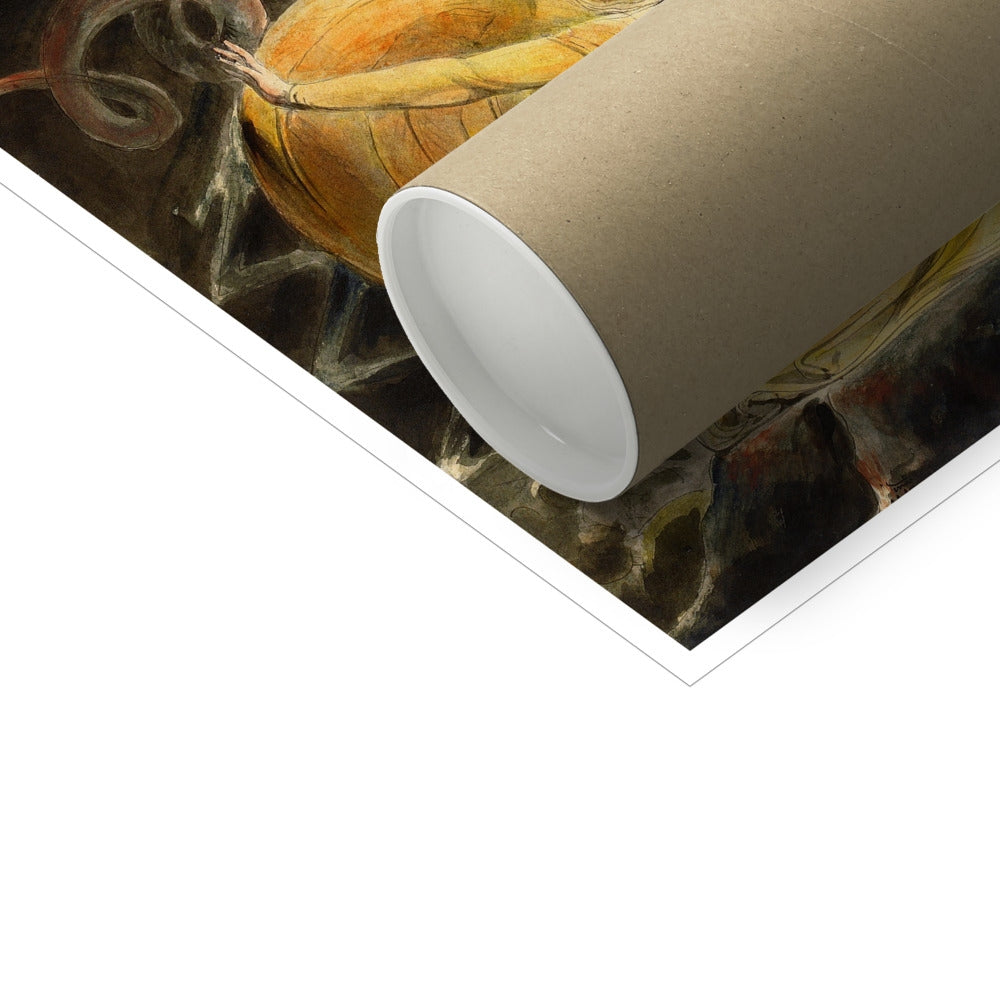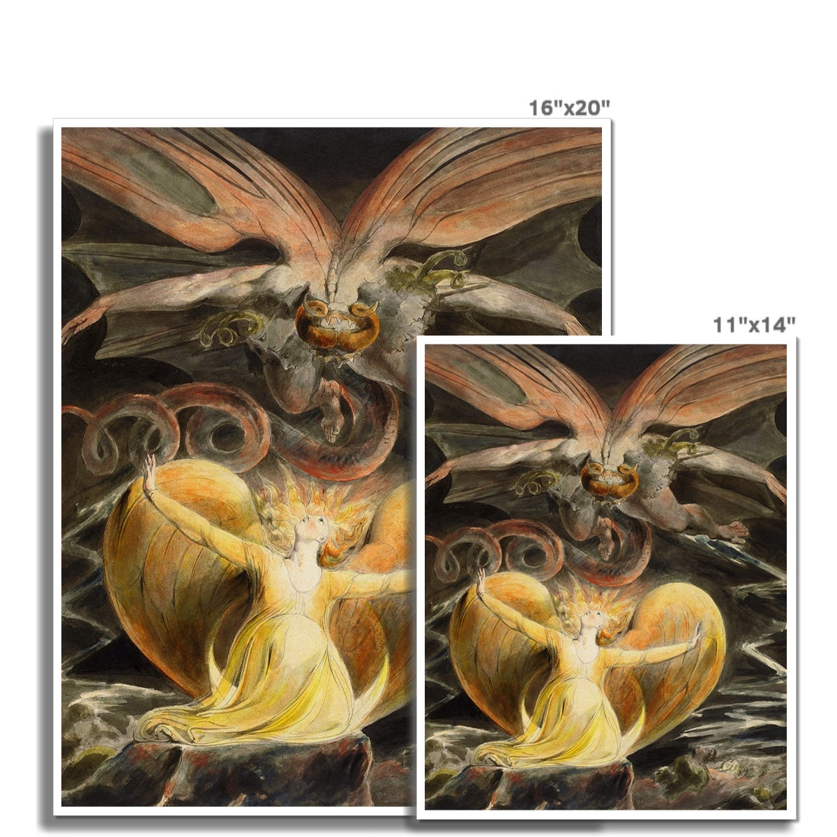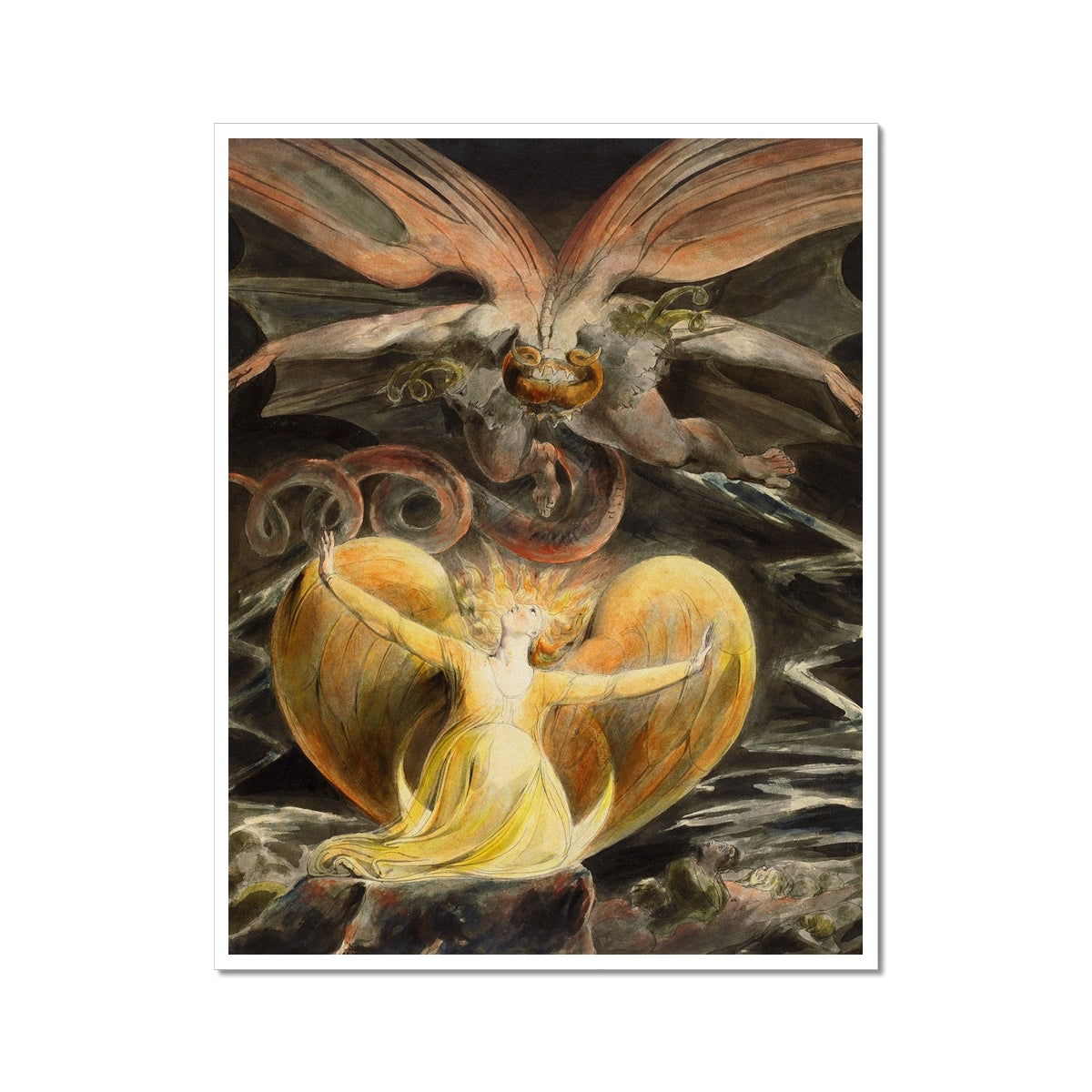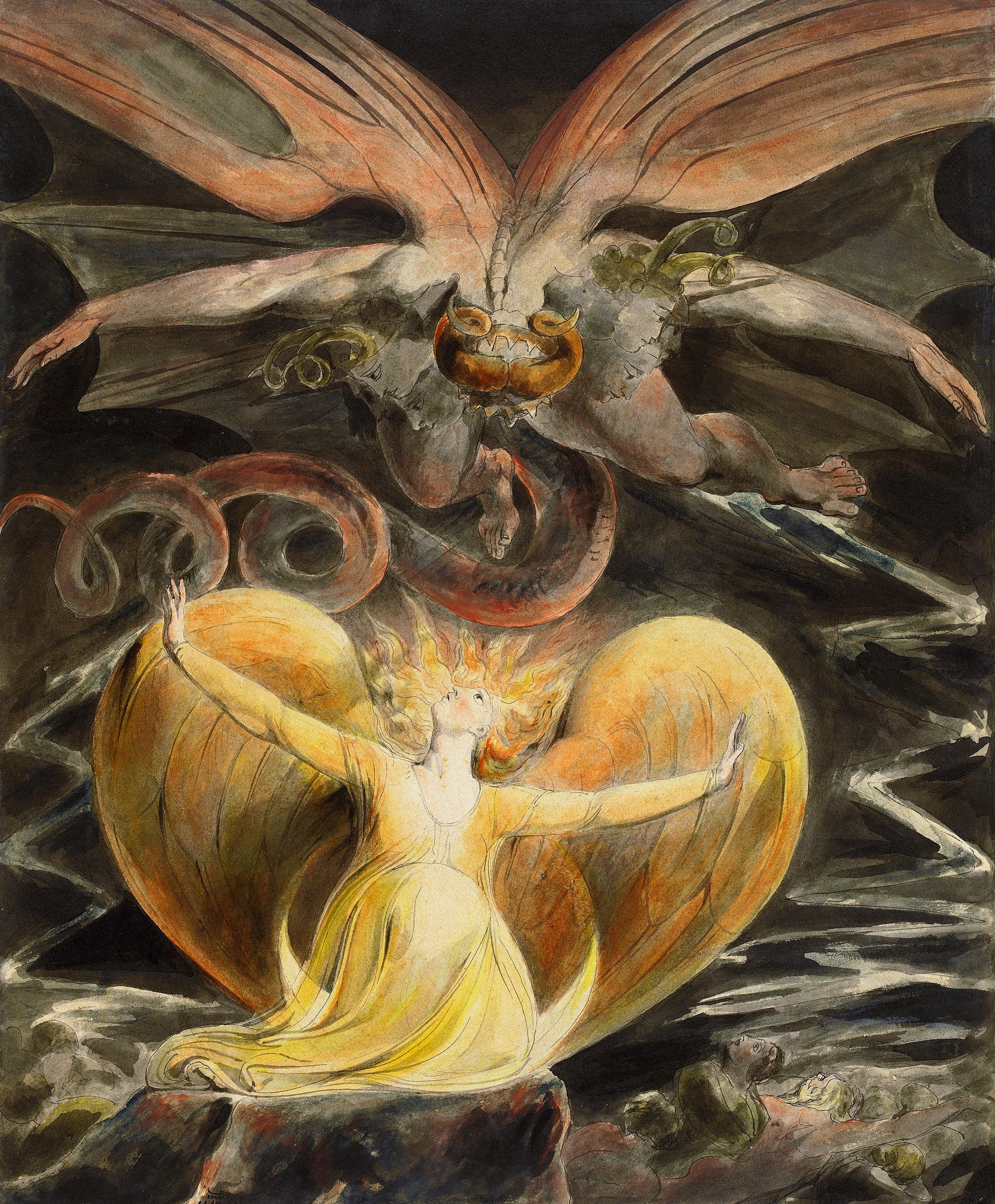 "The Great Red Dragon and the Woman Clothed with the Sun," created by William Blake around 1810. It is one of a series of watercolors Blake made depicting scenes from the Book of Revelation. The painting illustrates a dramatic moment in the biblical narrative where a fierce, monstrous dragon, representing Satan, hovers menacingly above a radiant woman. The woman, clothed in sunlight, with large wings and a serene expression, seems to be caught in a moment of divine rapture or protection, despite the imminent danger. The contrasting elements of light and dark, along with the dynamic positioning of the figures, create a sense of tension and spiritual intensity.