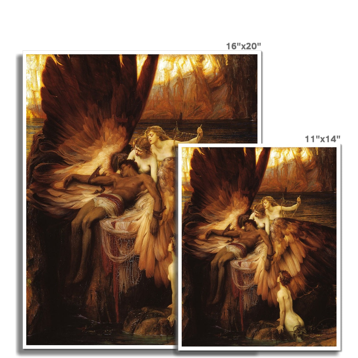 "The Lament for Icarus" is a painting by Herbert James Draper, completed around 1898. This work of art depicts the tragic aftermath of the Greek myth of Icarus, who flew too close to the sun with wings made of feathers and wax. The heat caused the wax to melt, leading to his fall into the sea. In the painting, Icarus's lifeless body is draped over a rock, his large, burnt wings hanging down. Surrounding him are three sea nymphs, or possibly muses, who mourn his demise. The golden hues of the background contrast with the somber, shadowy tones in the foreground, emphasizing the melancholic and tragic mood of the scene. The detailed rendering of the figures and the delicate interplay of light and shadow are characteristic of Draper's style, showcasing his skill in capturing mythological themes with emotional depth.
