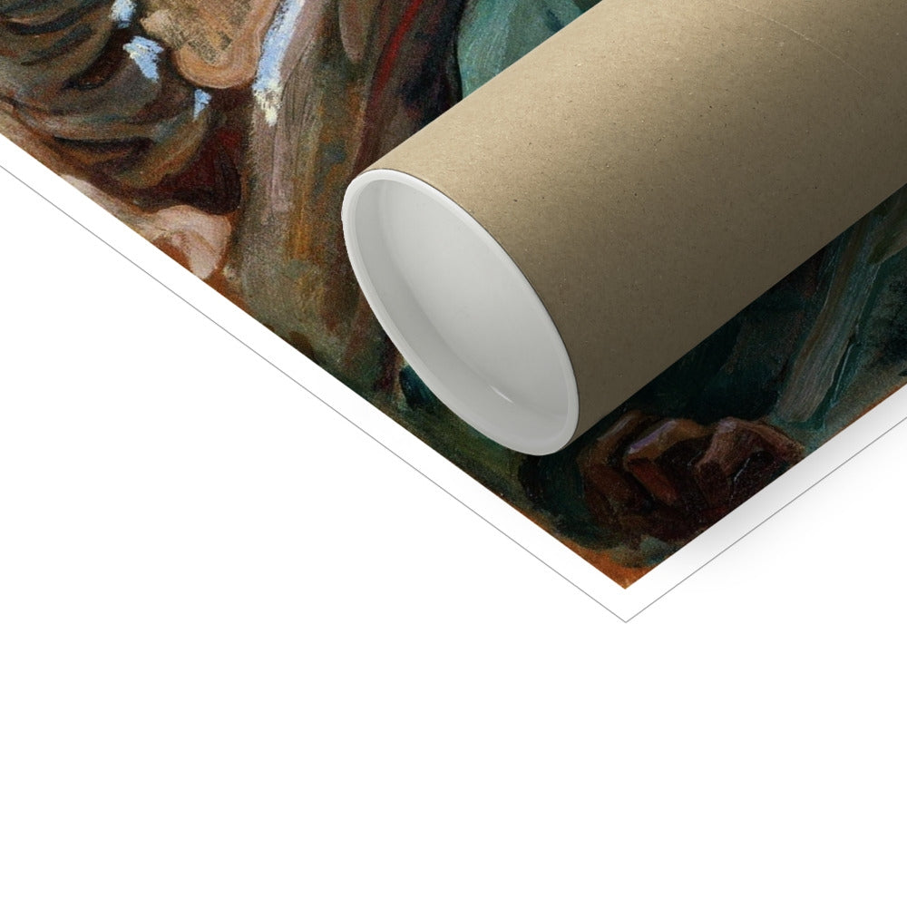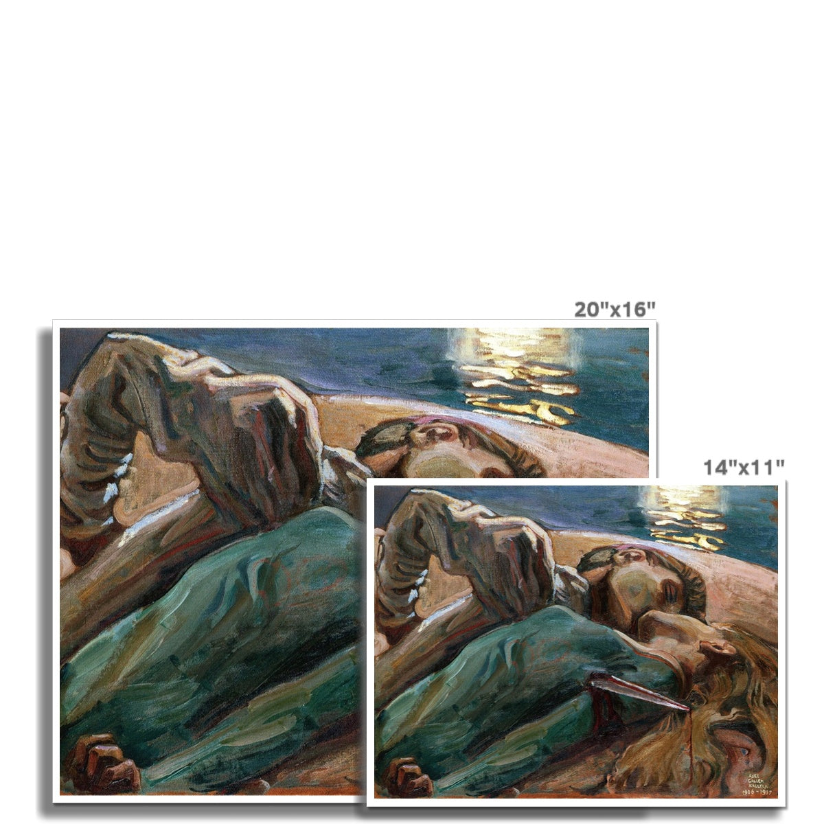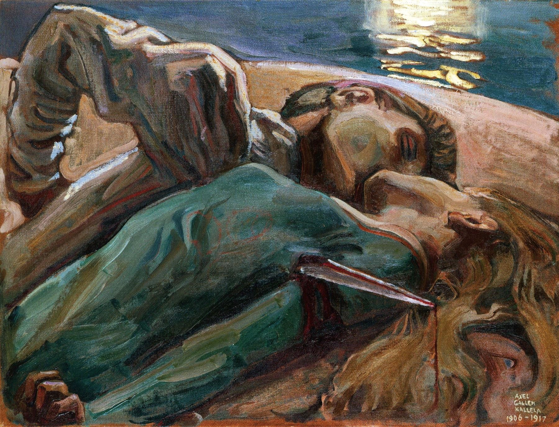 "The Lovers" by Axel Gallen-Kallela, painted circa 1917, is a striking and deeply evocative work that juxtaposes themes of love, sacrifice, and betrayal. The composition depicts a couple in an intimate embrace, their forms illuminated by the soft radiance of moonlight reflecting on water. However, this seemingly tender moment is interrupted by a harrowing act: the man has plunged a knife through his own back, the blade continuing through to pierce his lover beneath him. This shocking act transforms the scene from one of romantic intimacy to a powerful meditation on despair and the destructive extremes of passion. Through masterful use of dynamic brushwork and a vivid yet somber palette, Gallen-Kallela conveys the profound emotional weight of the moment, offering a haunting commentary on the duality of human relationships and the tragic consequences of unbridled emotion.